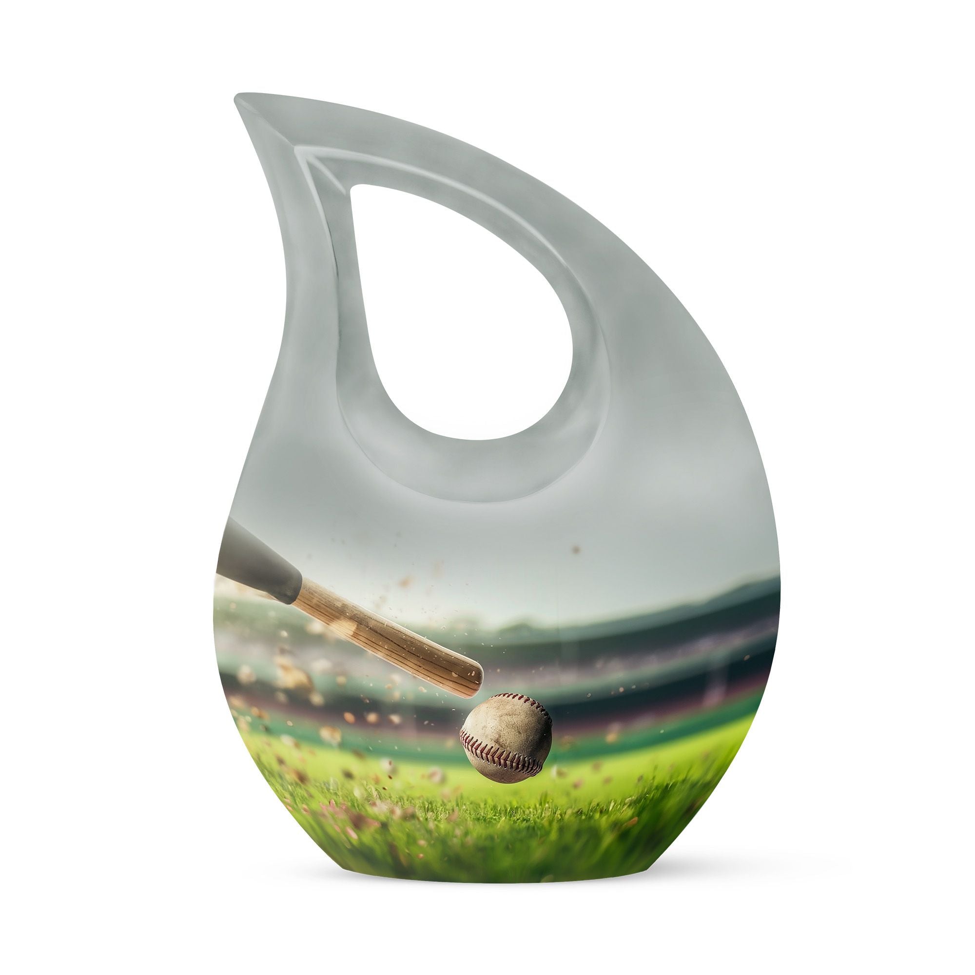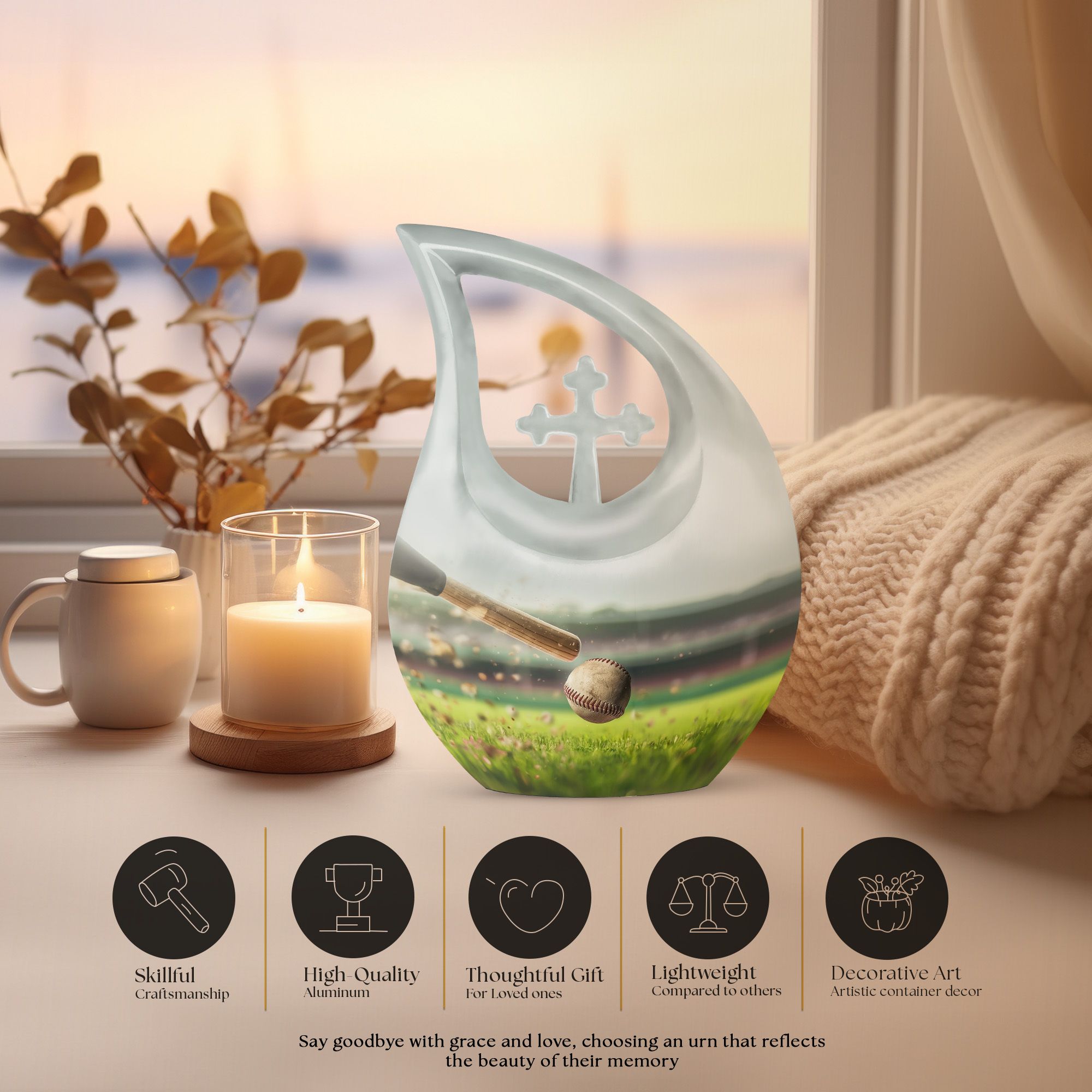 Preserve the memory of your loved one with our bespoke Cross Drop Baseball Urn, an affordable yet dignified choice for a cremation urn. Crafted from high-quality aluminium, this large urn stands 10 inches tall and weighs in at 3.3 pounds. With a generous capacity of 200 cubic inches, it comfortably contains the ashes of an adult. This urn's baseball theme adds a poignant personal touch, making it an ideal choice for sports enthusiasts or fans. Each urn comes with a velvet pouch, providing a secure place for the containment of the ashes. What's more, you can further personalize this urn with engraved names, allowing you to keep your loved one's memory alive in a special and unique way. Purchase this low-cost cremation urn that beautifully merges functionality and sentiment to honor your dear one's life lived and their love for baseball.