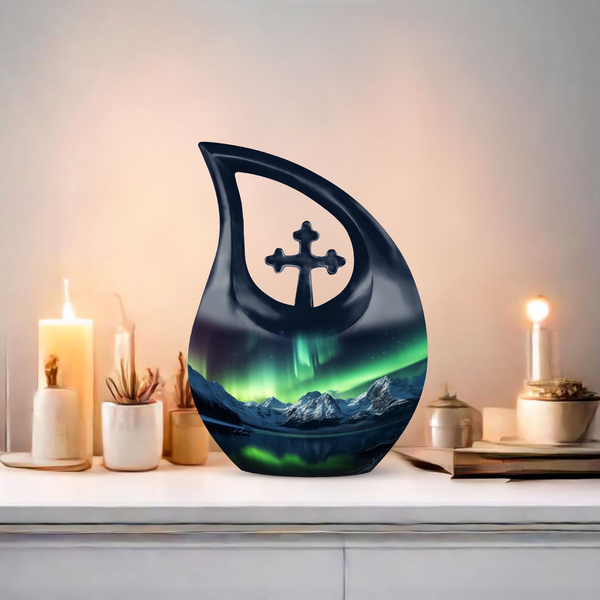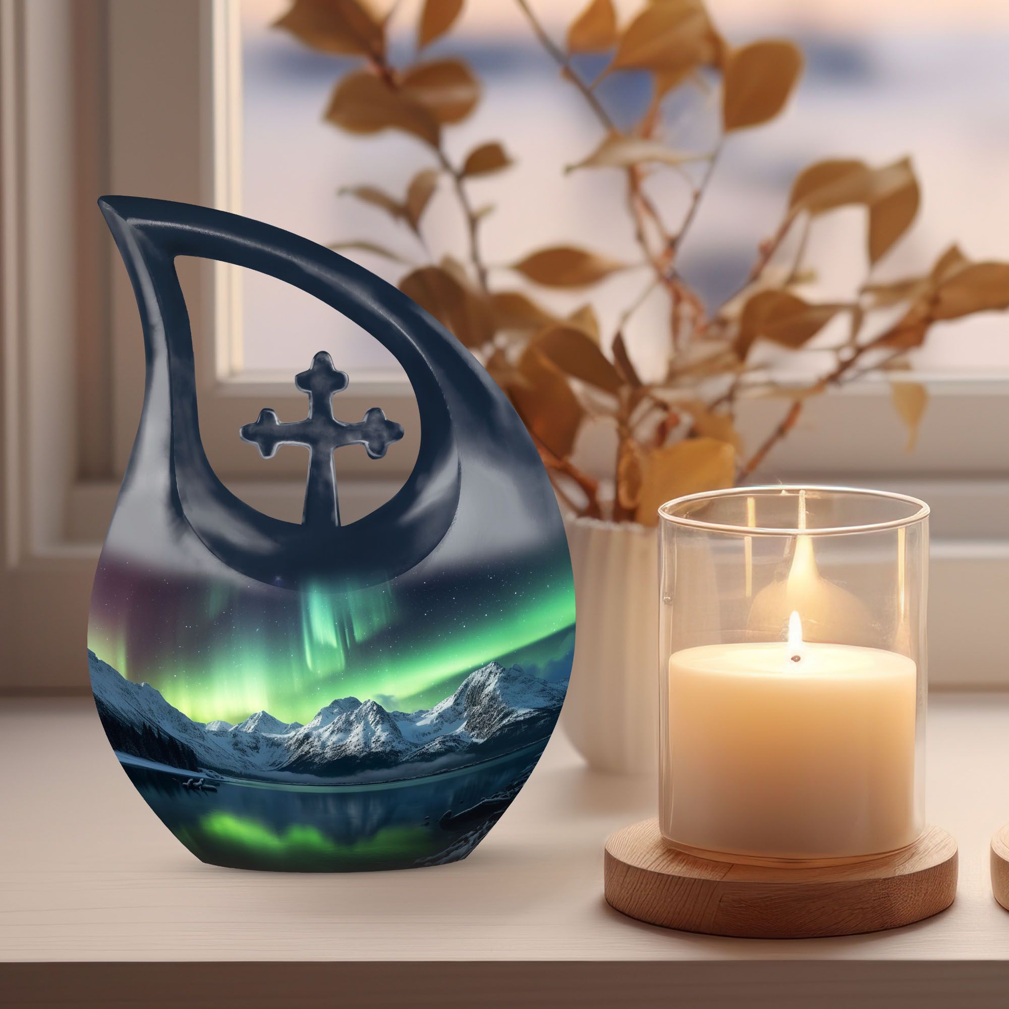 • Design: Aurora Borealis mountain scene, symbolizing peace, light, and eternal remembrance