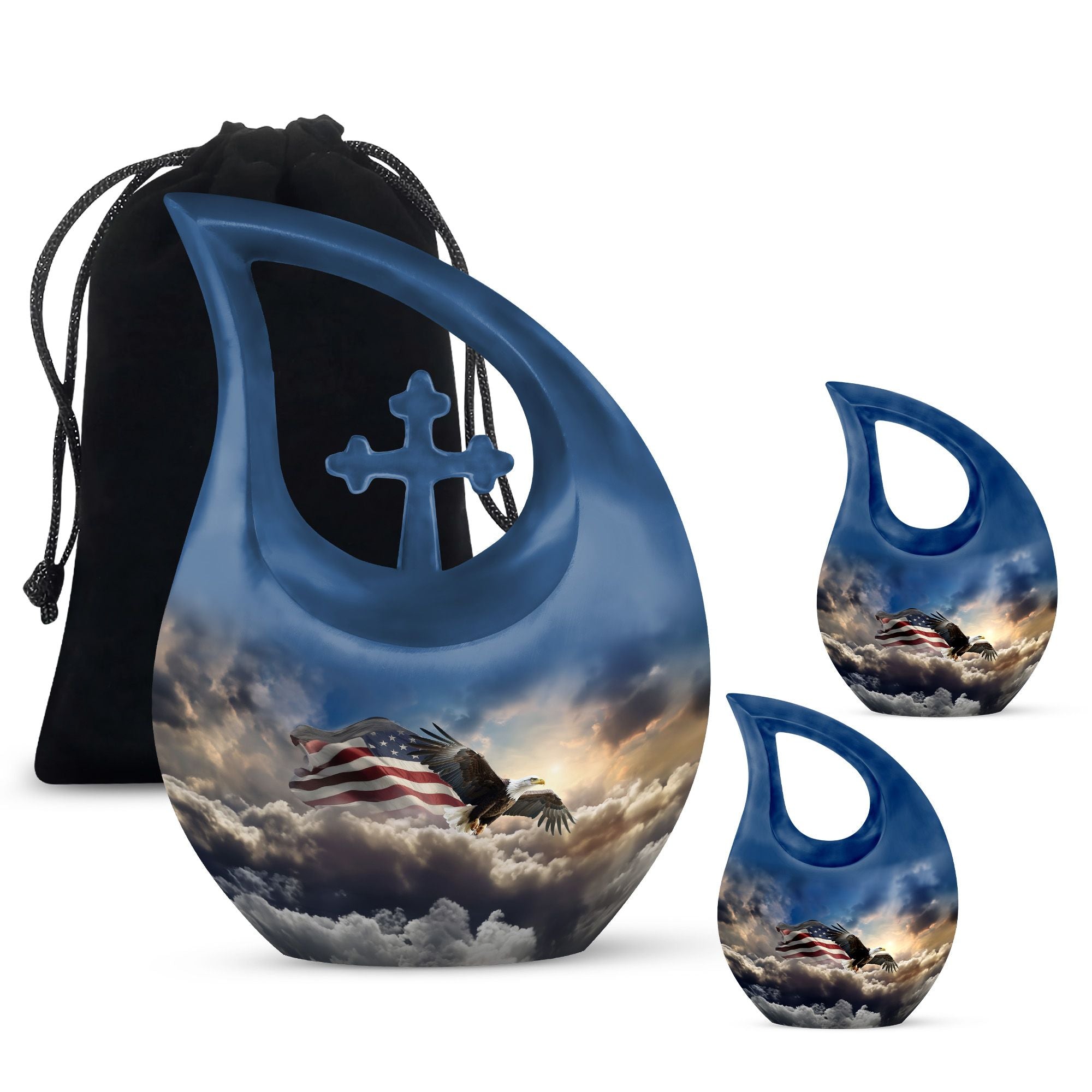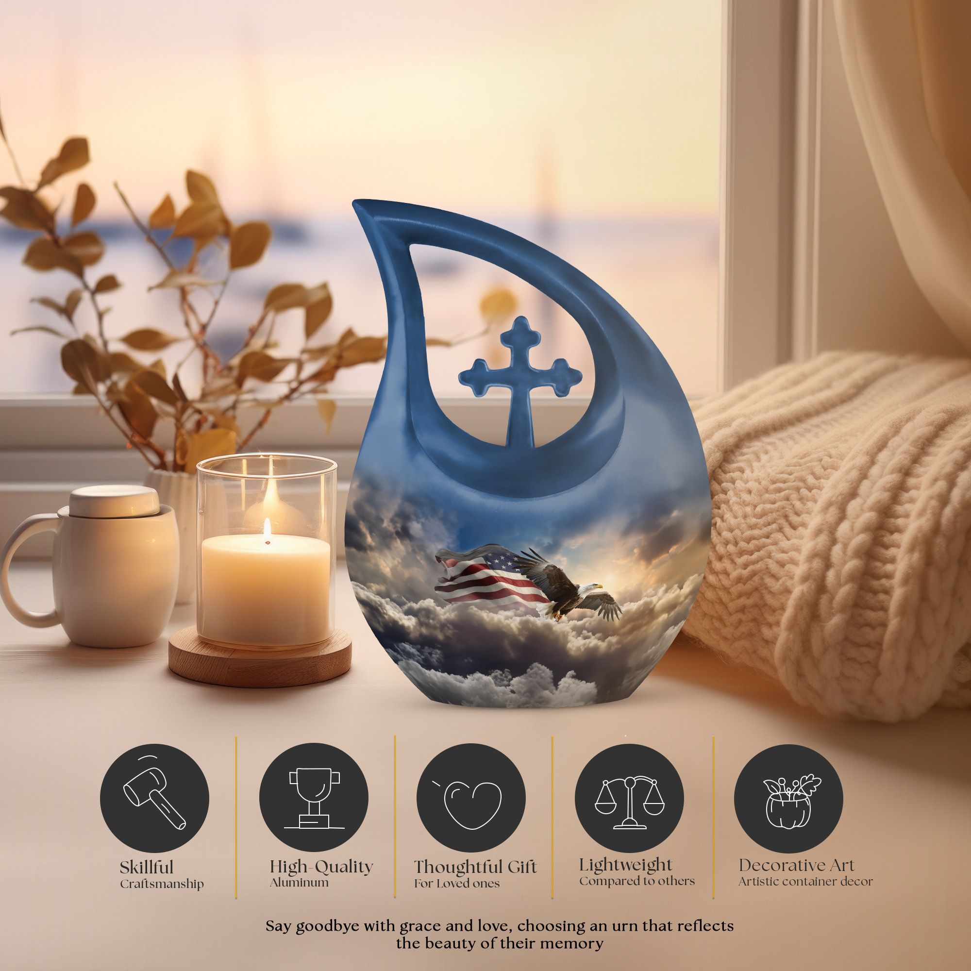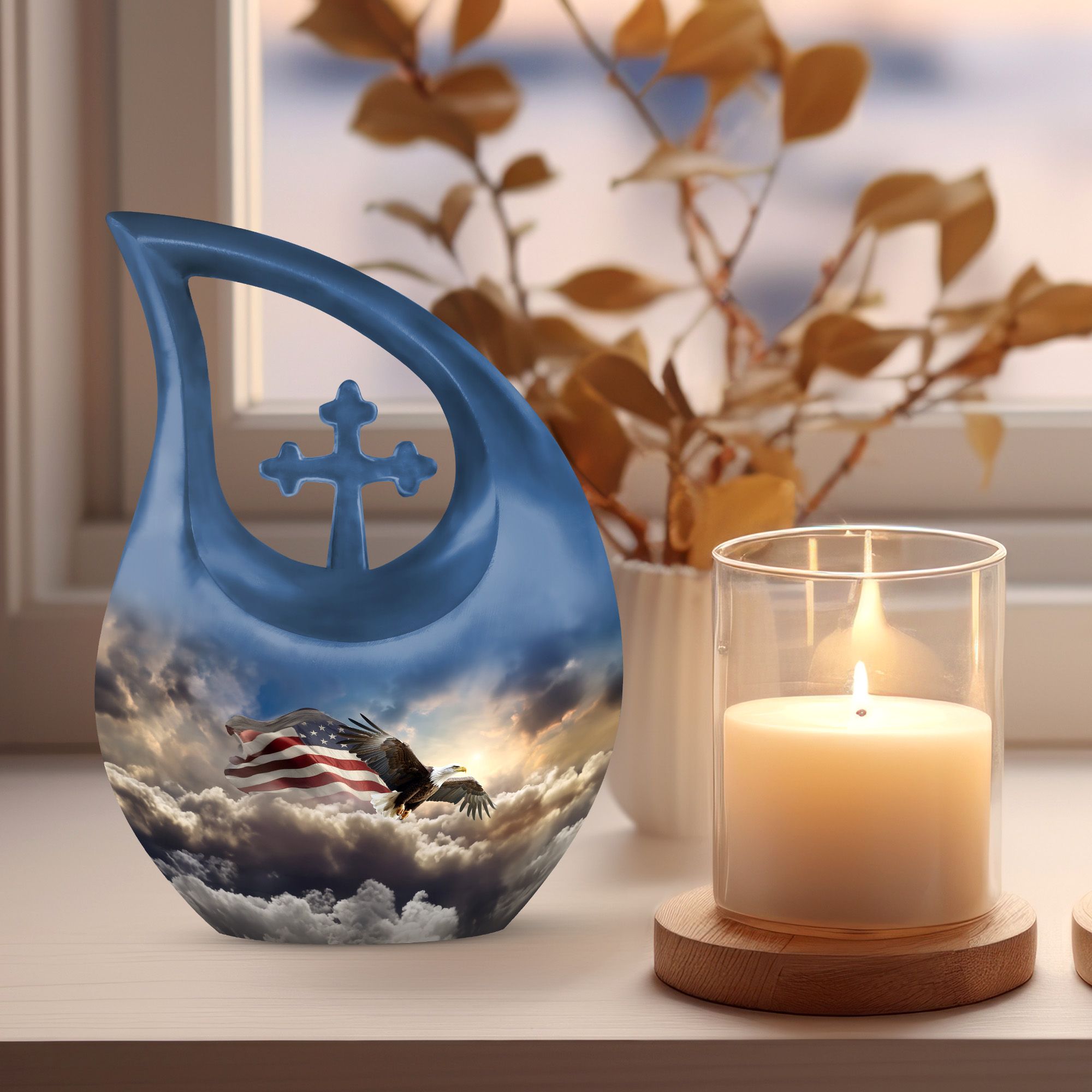 Celebrate the life and legacy of a true patriot with this American Eagle & Flag Memorial Urn, a powerful tribute symbolizing strength, freedom, and love for the nation. Designed in deep blue with an intricate U.S. flag and soaring eagle motif, this urn beautifully represents the courage and spirit of your loved one. Suitable for both men and women, it serves as a timeless remembrance among funeral urns for men and funeral urns for women collections.
