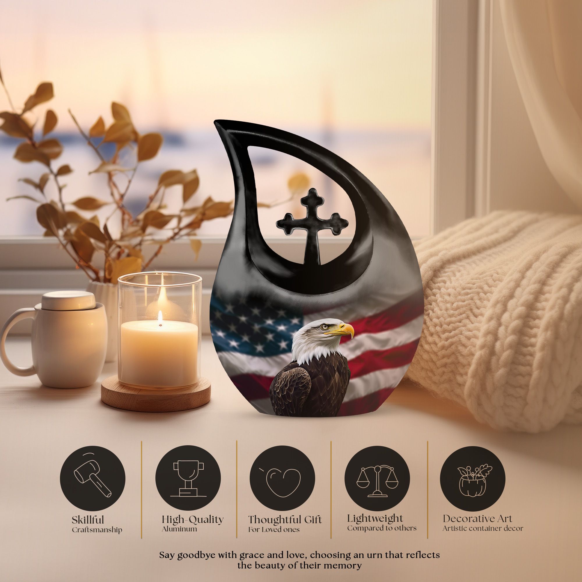 Crafted from durable aluminum, this 10 inch urn features a soaring eagle across the American flag—an iconic emblem of strength and protection. The secure screw-top lid ensures dependable safekeeping, making it suitable for adult urns women, beautiful urns women, or keepsake urns for men ashes when coordinating memorial pieces are needed. Its polished finish provides a bold and elegant presence, whether used for tiny urns for women & men or for ashes keepsake women options shared among loved ones.