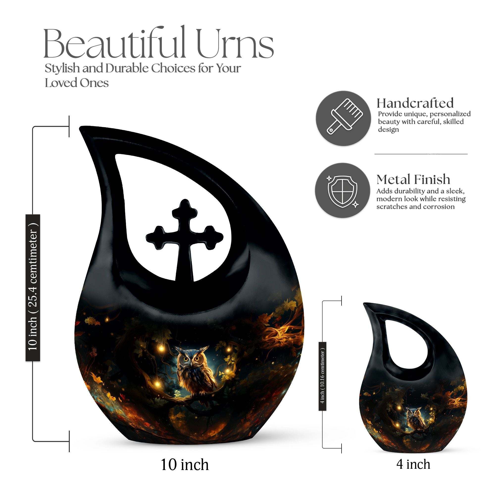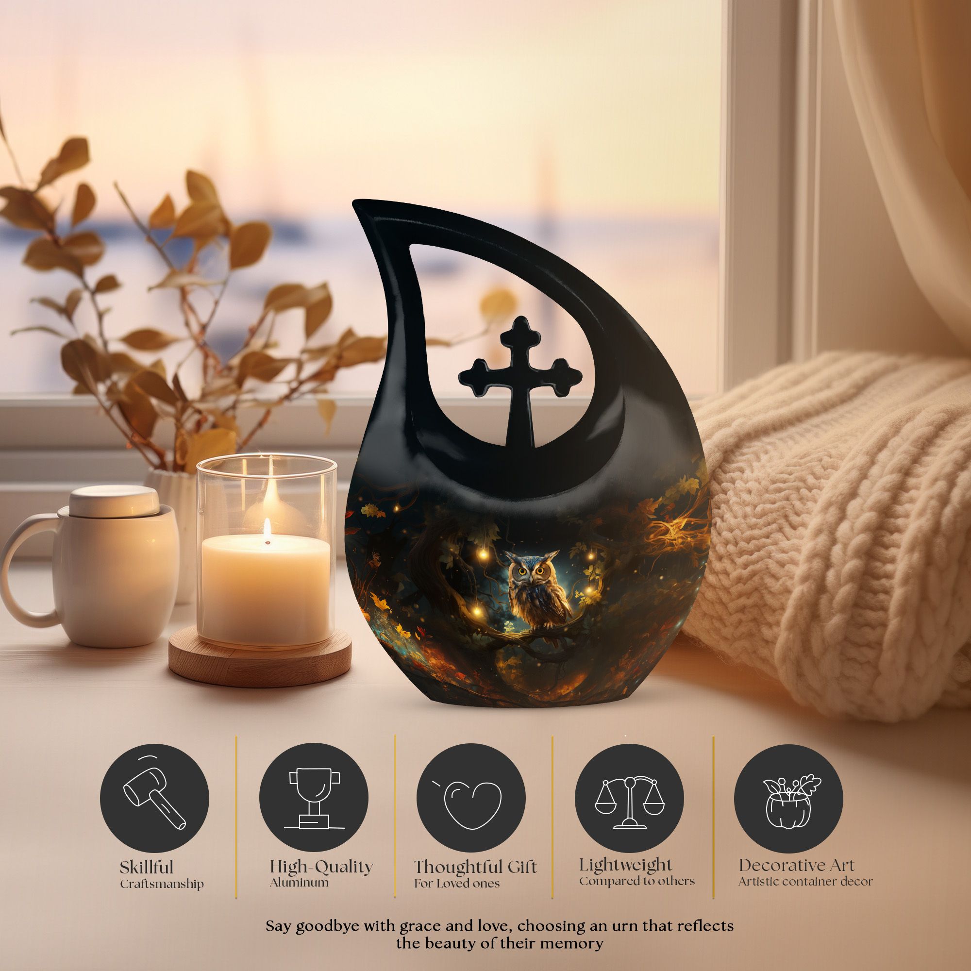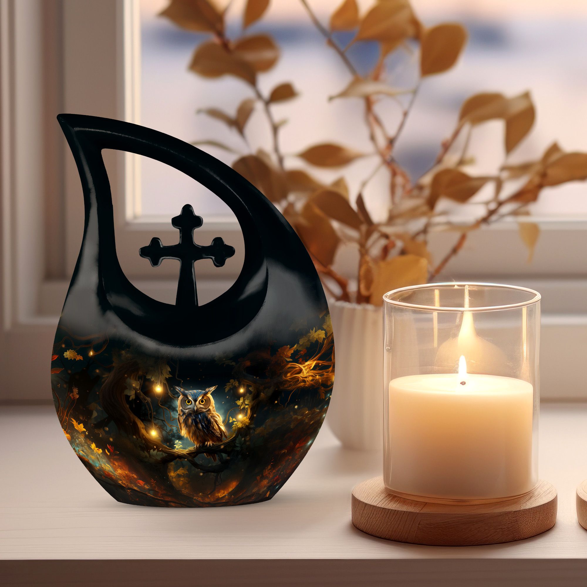 This large human ashes urn reflects the calm wisdom of the owl and the peaceful transition of autumn — a reminder that love and spirit never fade. Whether chosen as a large cremation urn or centerpiece urn for ashes adult male large, it honors a life well-lived with grace and dignity.