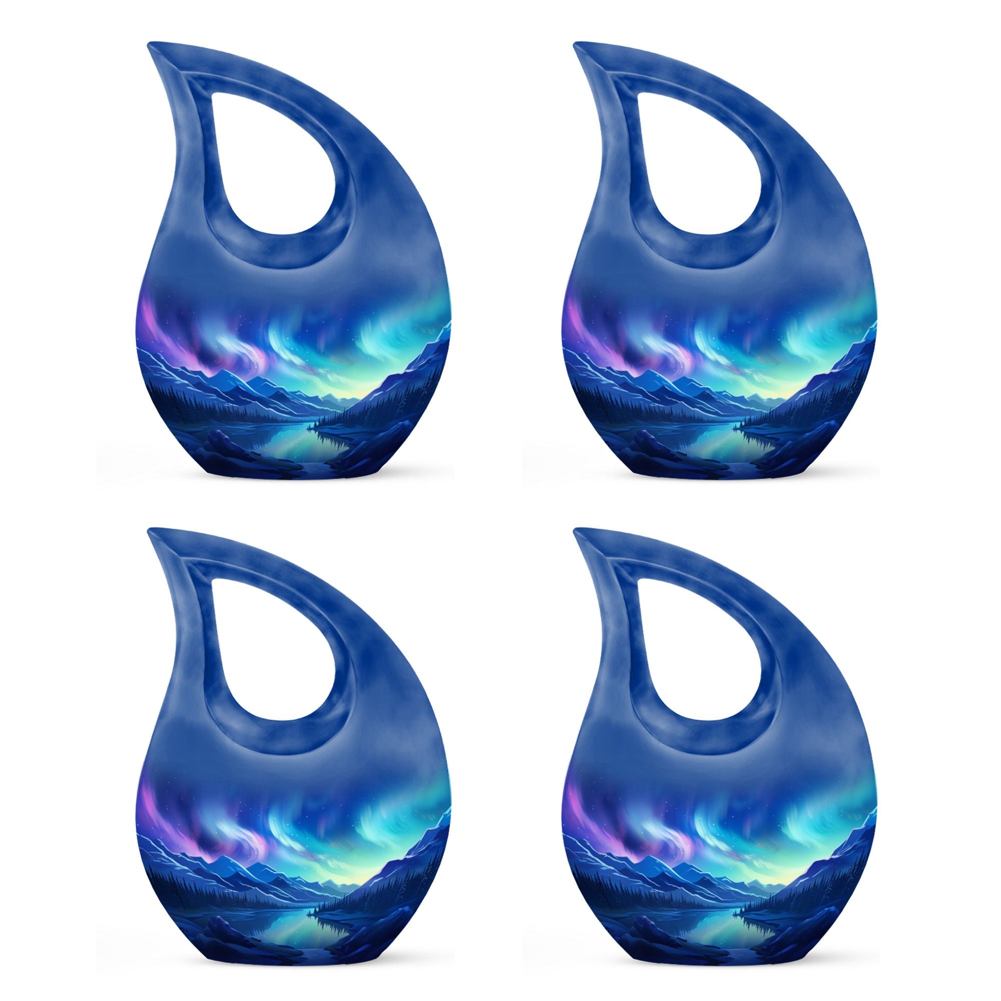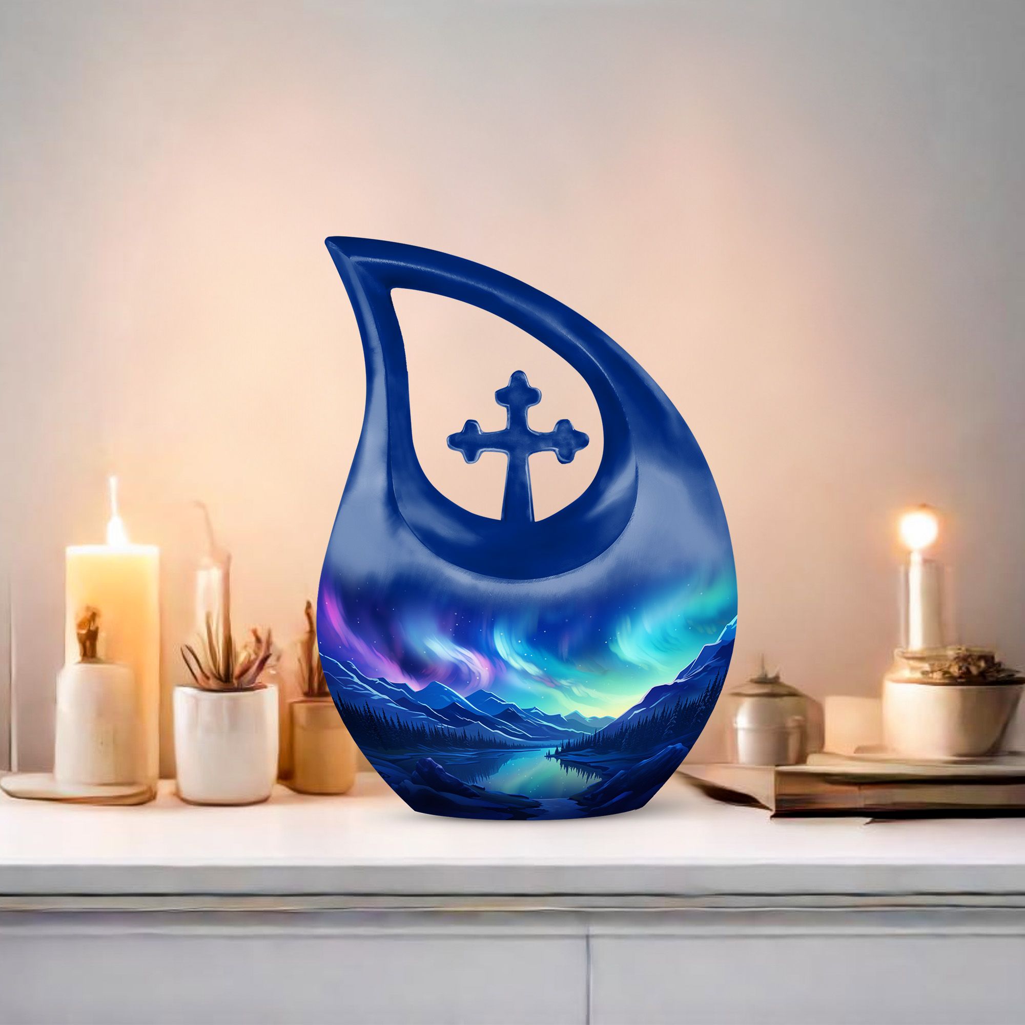 Expertly crafted by skilled artisans, this urn showcases a mesmerizing deep-blue scenic finish reminiscent of the Aurora Borealis night sky. Made from premium aluminum, it’s both lightweight and durable, ensuring timeless protection for your loved one’s remains. The detailed craftsmanship and luminous tones make it one of the most unique urns for ashes available today. This funeral adult urn is suitable for display at home, in a columbarium, or for a burial ceremony.