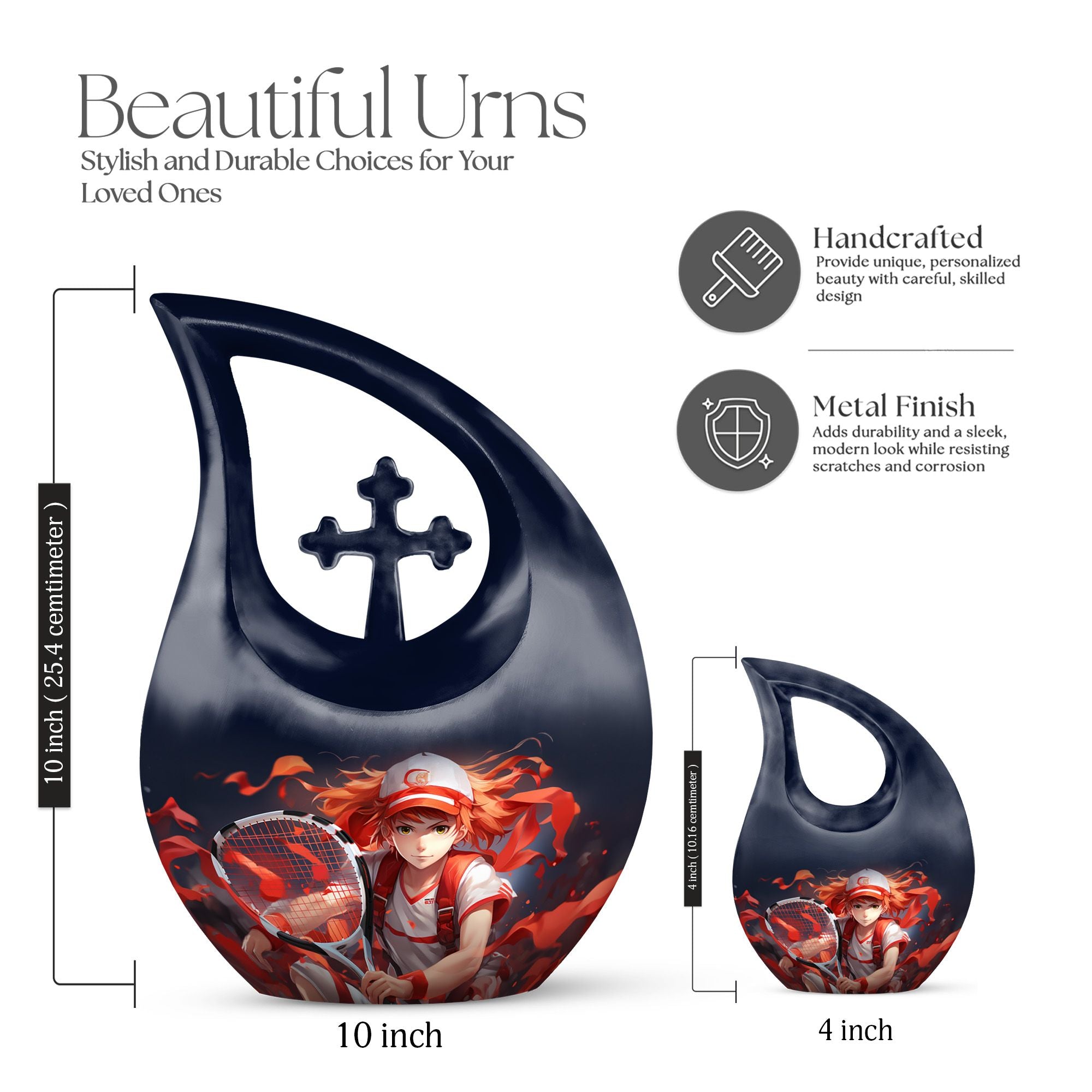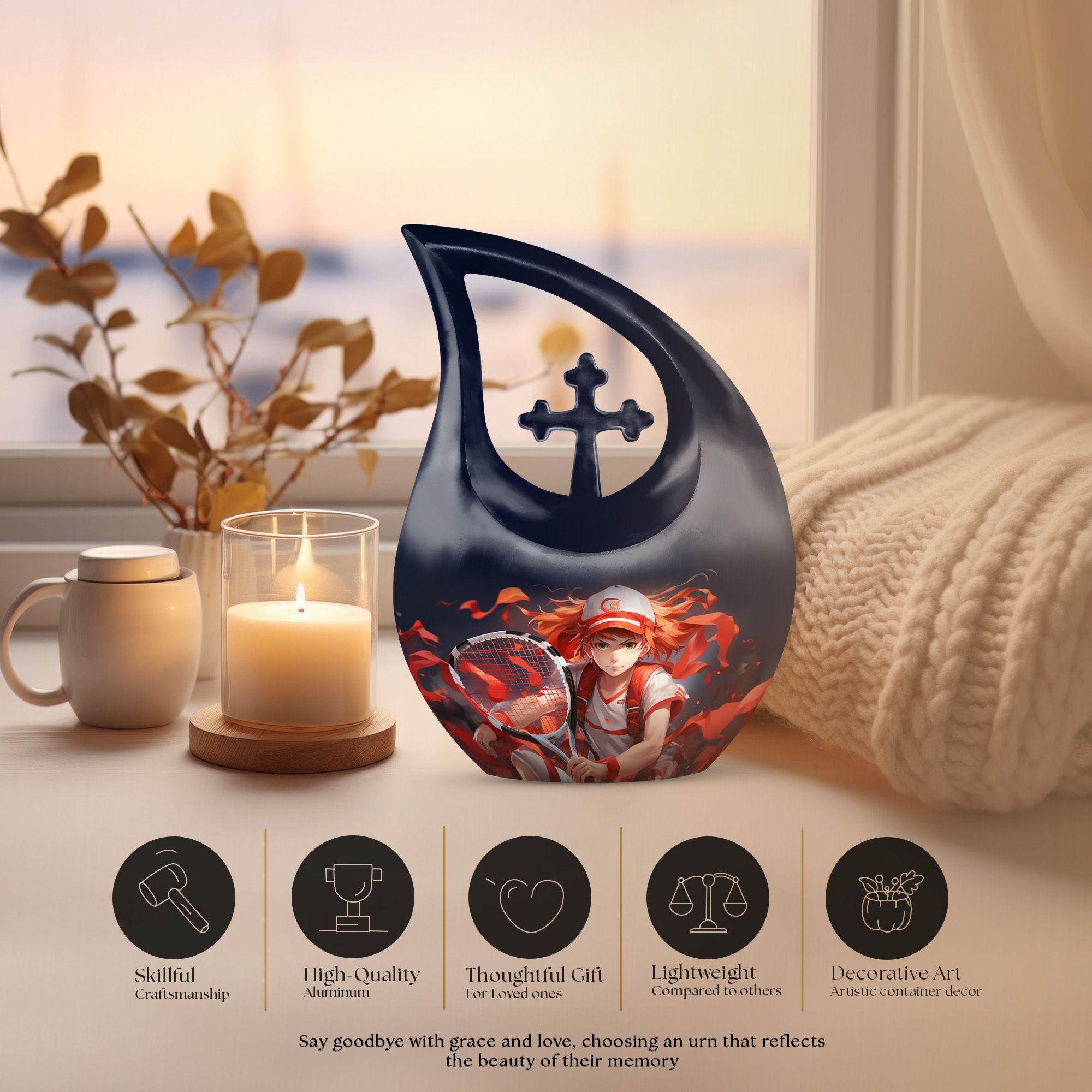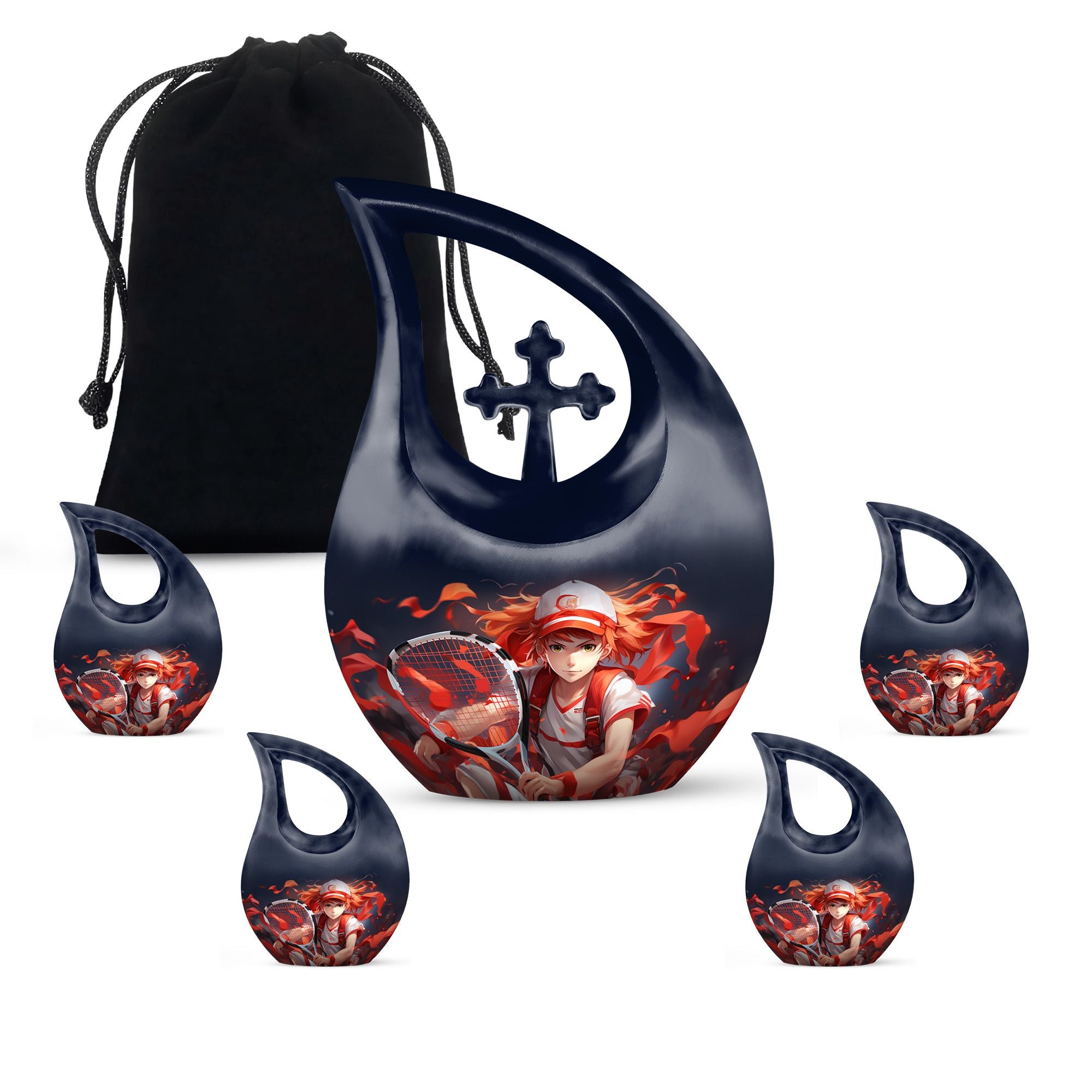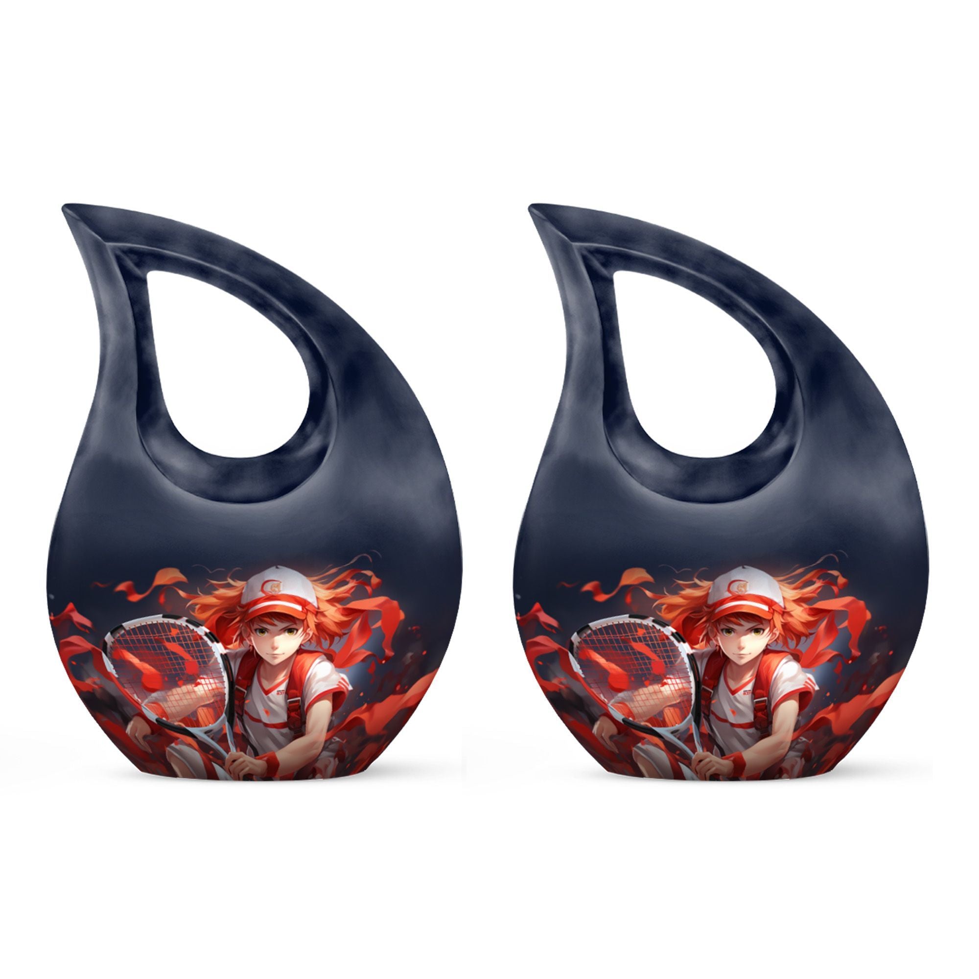 Skillfully crafted from durable aluminum, this premium urn features detailed anime art paired with a tennis-themed motif, creating a unique and symbolic representation of a life well remembered. The secure screw-top lid ensures lasting protection, making it suitable for burial urns for adult human ashes or home memorial display. Families wishing to share ashes can pair this piece with urns for ashes keepsake items, a keepsake urn set, or keepsake urns human ashes for a beautifully coordinated remembrance. It also works wonderfully with human ash keepsake pieces and urn ashes keepsake collections for multi-member memorials.