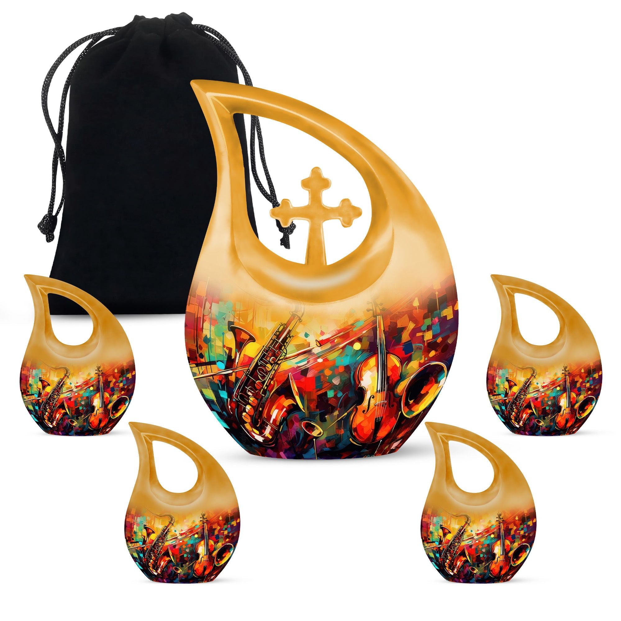 Crafted from durable aluminum, this urn features a stunning musical motif symbolizing rhythm, creativity, and the timeless power of art. Its secure screw-top lid ensures dependable protection, while its full-size 10-inch capacity makes it perfect for cremation ashes urns combo sets, cremation urn for human ashes needs, or cremation memorial displays. Families wishing to share ashes can pair this full-size urn with cremation ashes keepsake options, small cremation keepsakes, cremation mini urn pieces, or keepsake cremation urns for human ashes adult. The coordinated cremation urns set and cremation urn keepsake possibilities allow multiple loved ones to participate in honoring a cherished life.