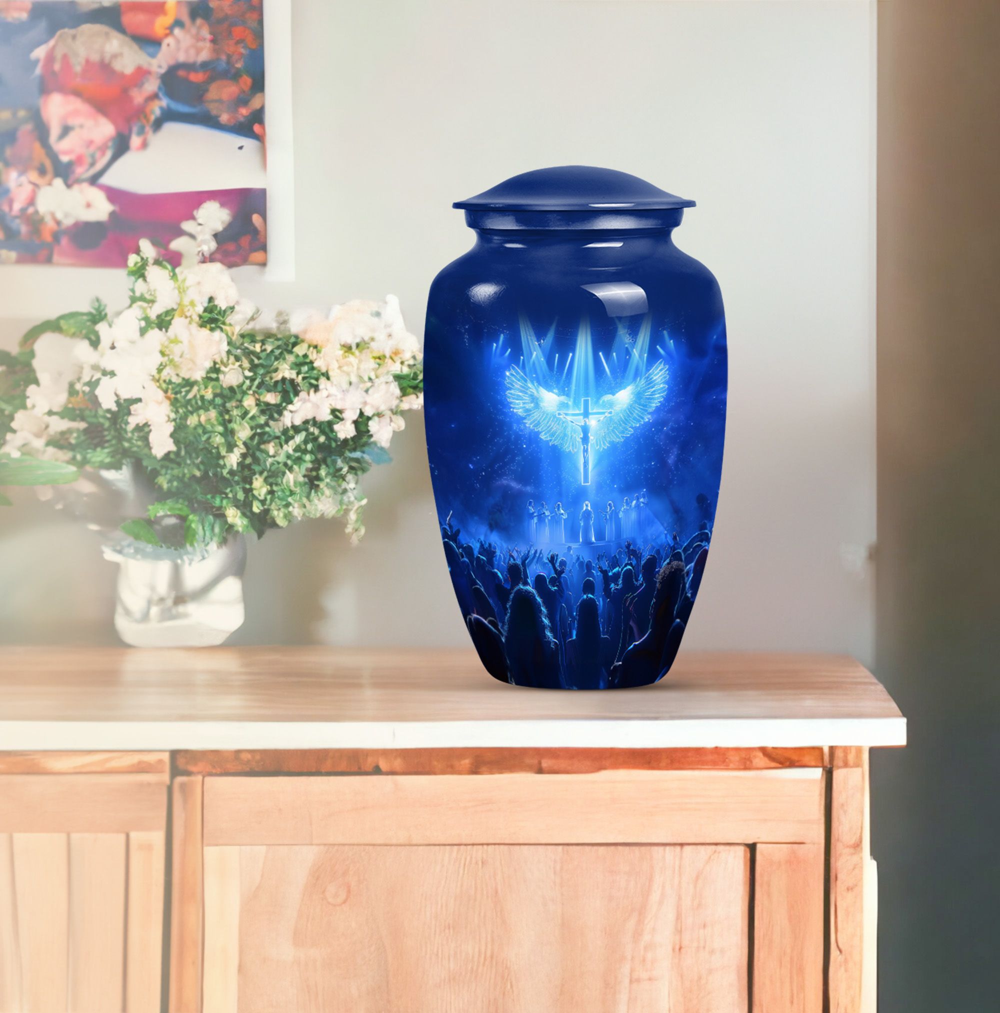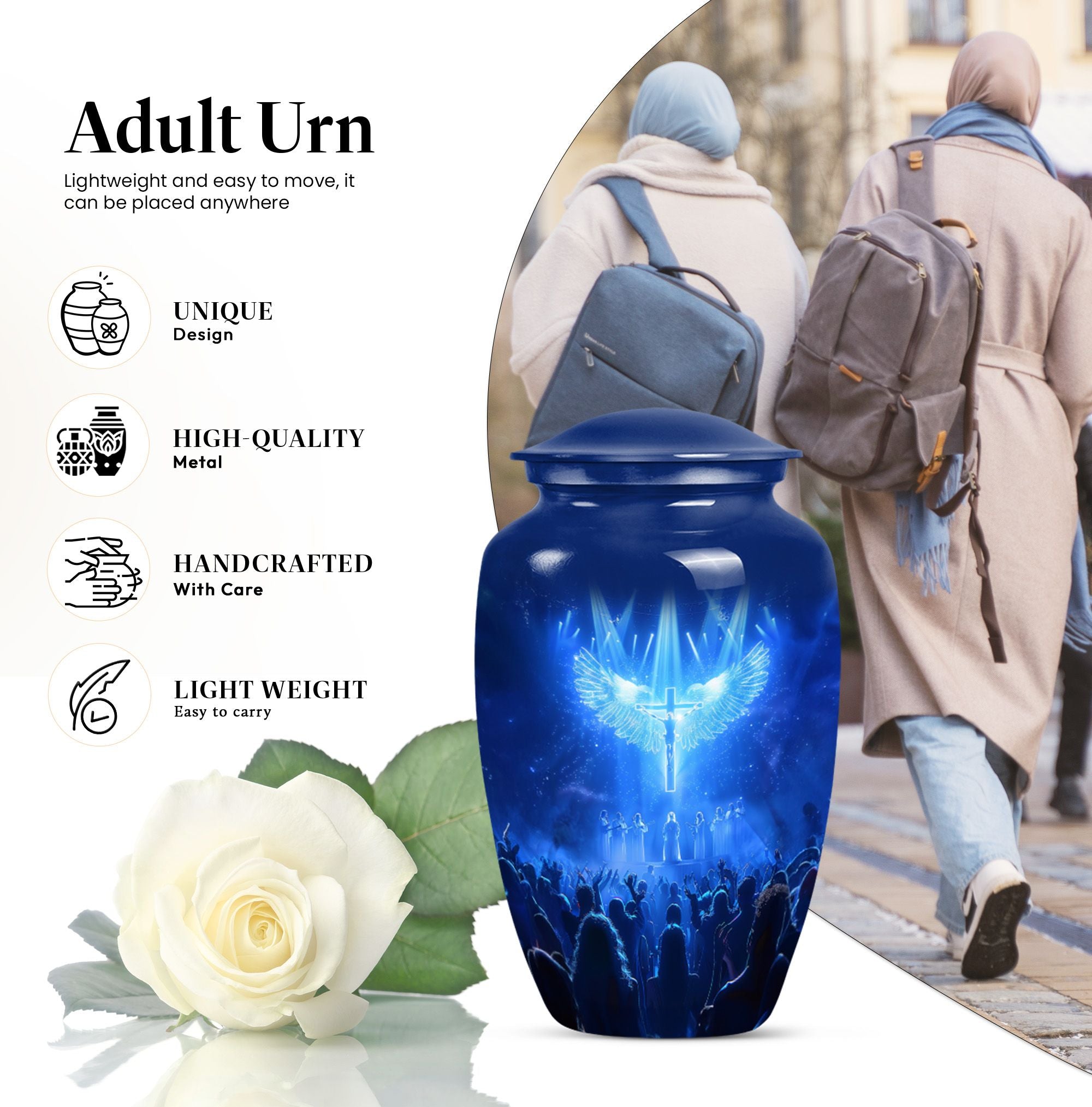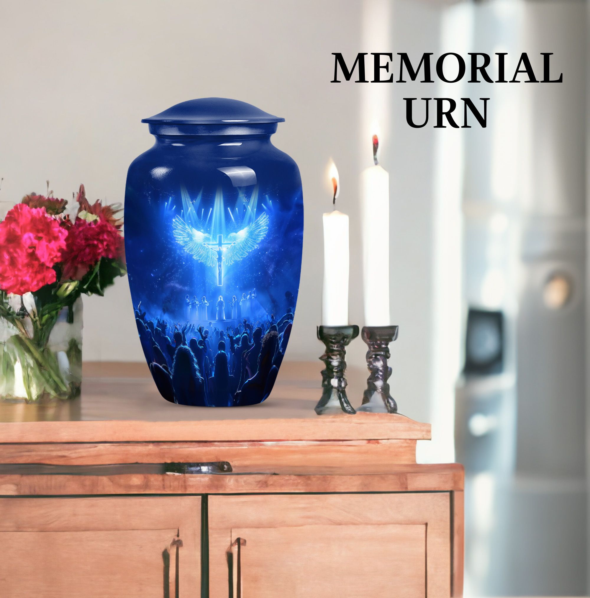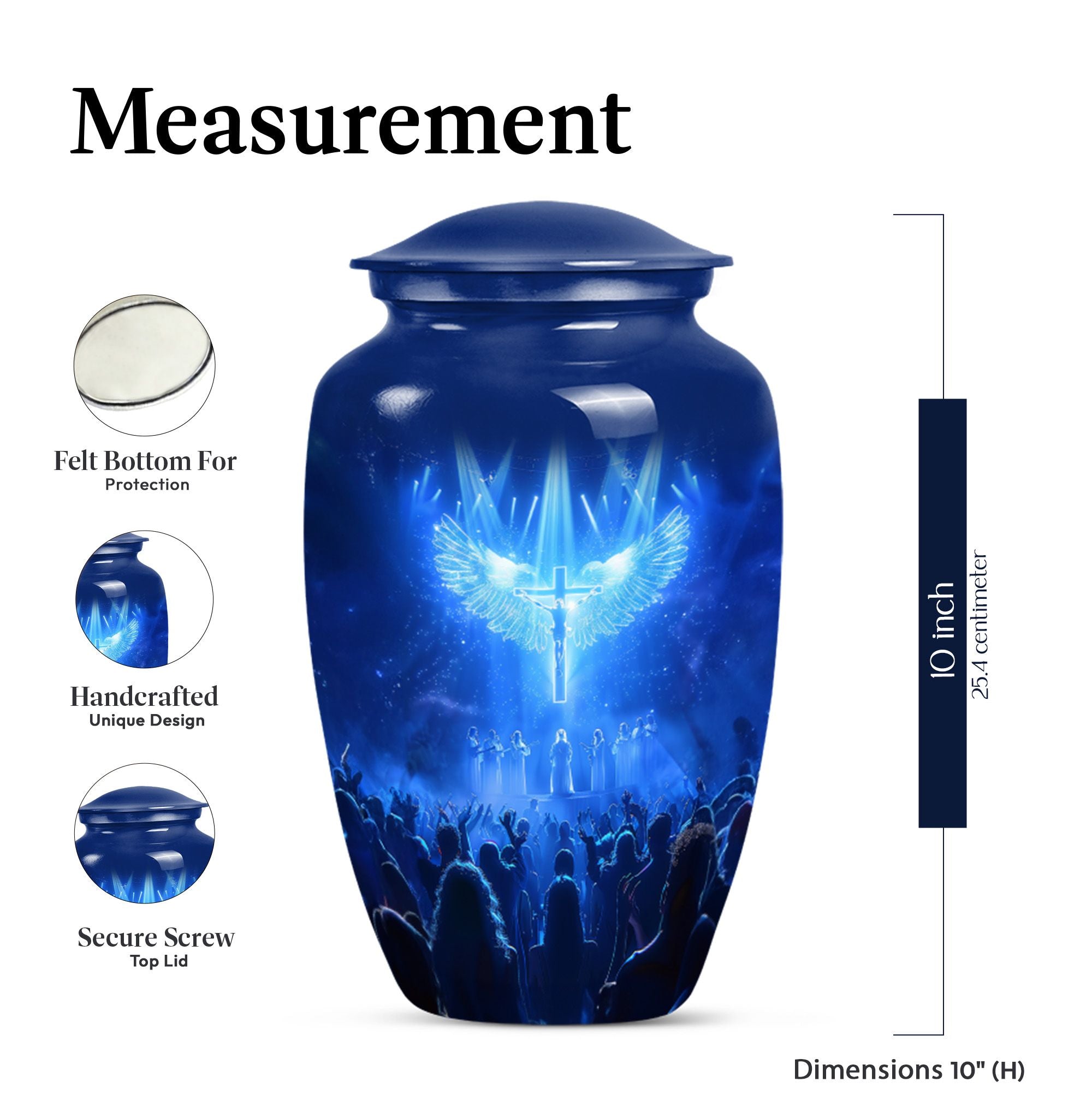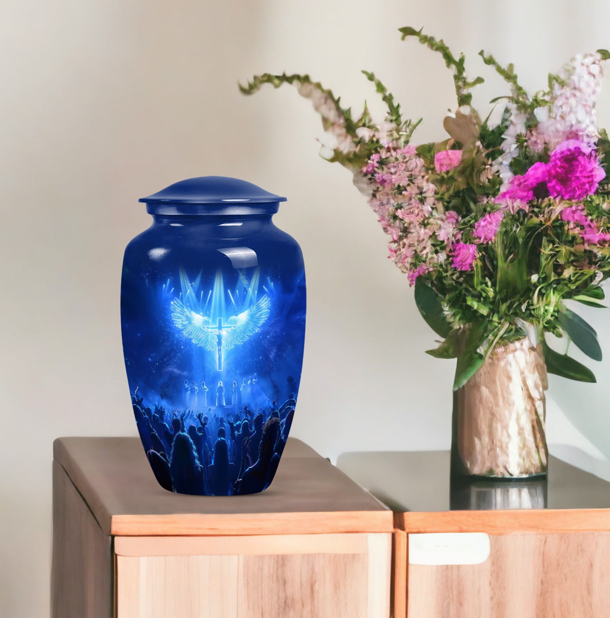 Cherish the memory of your loved ones with our premium Cross Urn, a significant piece from our Memorial Ceremony Supplies. This classic urn, beautifully accentuated by the awe-inspiring Aurora Borealis theme, serves as a perfect homage to your beloved. The sturdy, 10-inch aluminium urn is carefully designed to accommodate up to 200 cubic inches of ashes, making it an ideal choice for burial mediums. Weighing a comfortable 3.3 pounds, the burial medium size urn is easy to handle and manage. What makes this large urn even more priceless is its provision for customization - personalize it with engraved names to add a heart-touching note of remembrance. Each urn is tucked into a velvet pouch, ensuring dignified containment of ashes. From cremation urns for women to artistic metal urns for burial in the ground, this product brings an elegant blend of aesthetics and affection. Keywords likely to be searched by consumers in this category are included in the description to optimize search engine visibility.