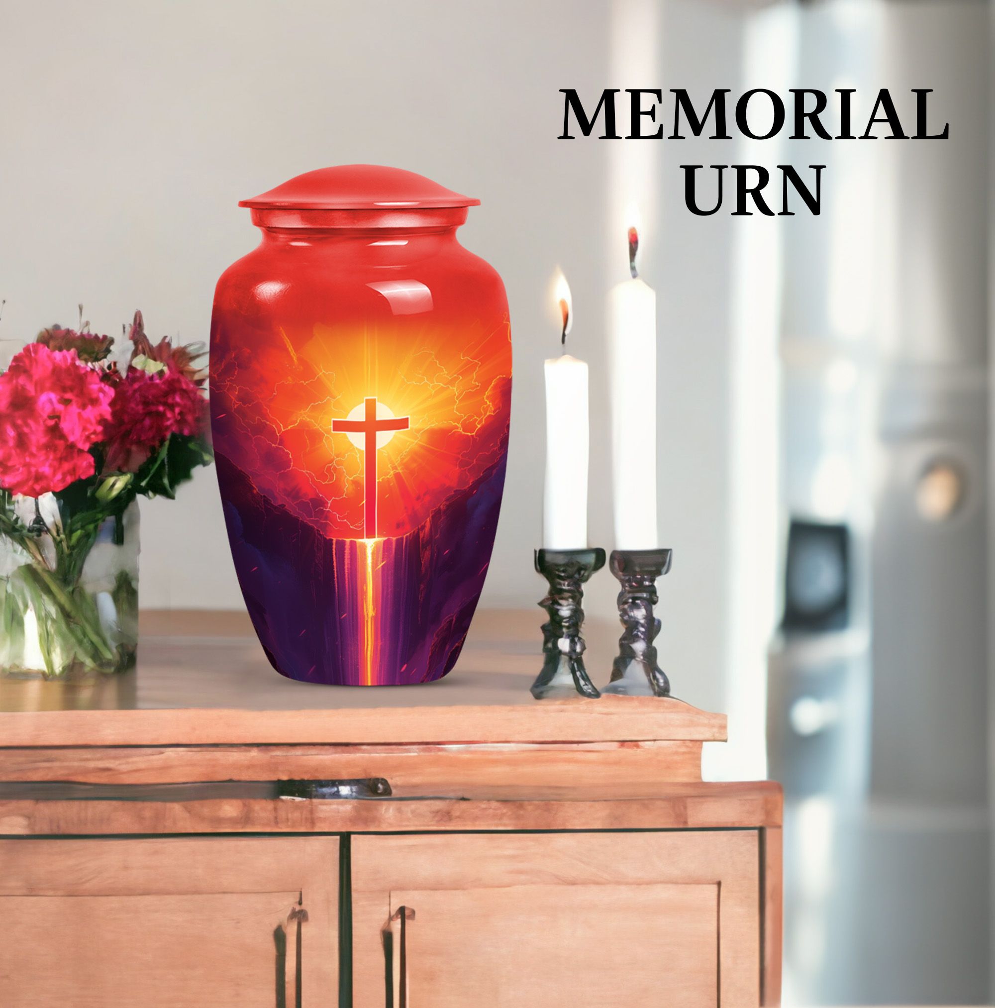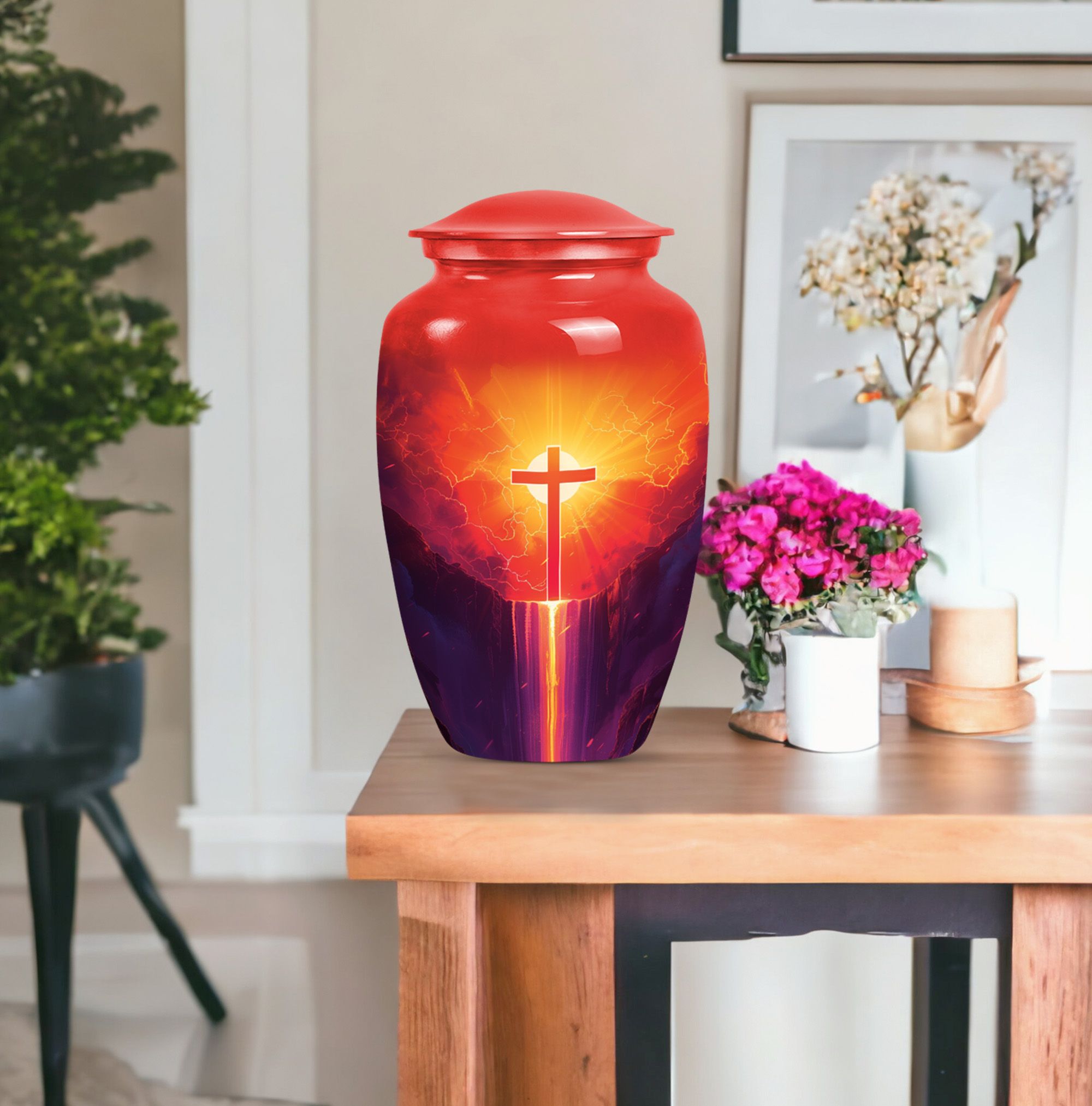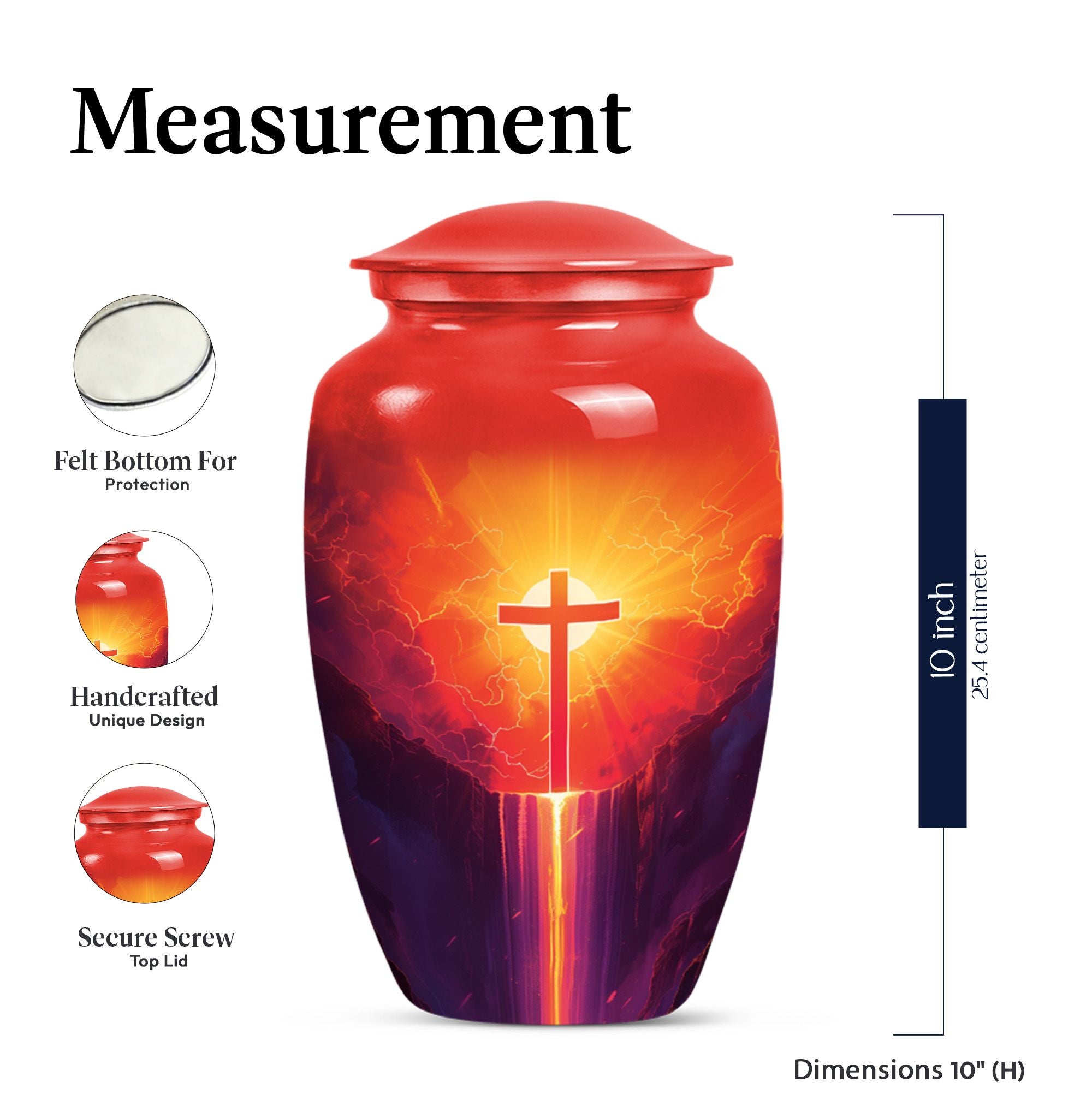 Our bespoke 10-inch Cross Urn is a dignified and respectful choice to preserve the memories of your departed loved ones. This large urn, weighing 3.3 pounds, has been intricately crafted from high-quality aluminum, ensuring longevity and durability. The aesthetic theme of Aurora Borealis provides an appealing celestial touch, commenced with a classic urn design that will seamlessly fit any decor. With a generous capacity, it can accommodate up to 200 cubic inches of cremains, sufficient for adult ashes. The urn is easily customizable, allowing for engraved names to add a personal touch. It comes coupled with a Velvet pouch intended for the safe containment of ashes, ensuring your cherished memories remain secure. This cremation urn beautifully encapsulates memorial burial essence, making it a significant artifact during periods of remembrance. Opt for this cross urn for a solemn, unique, and personal way to celebrate a life lived and loved. Ideal for funeral burials, it is a fitting tribute for adults and seniors.