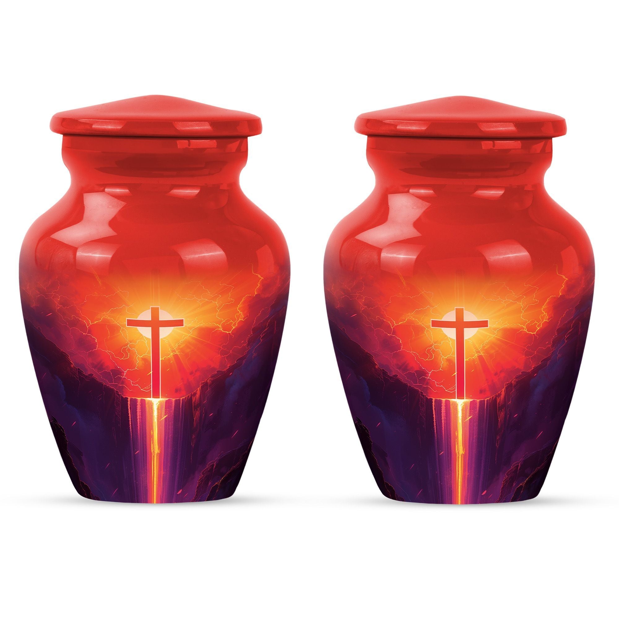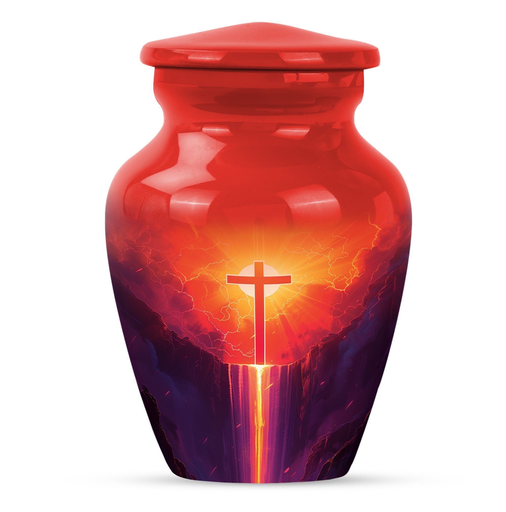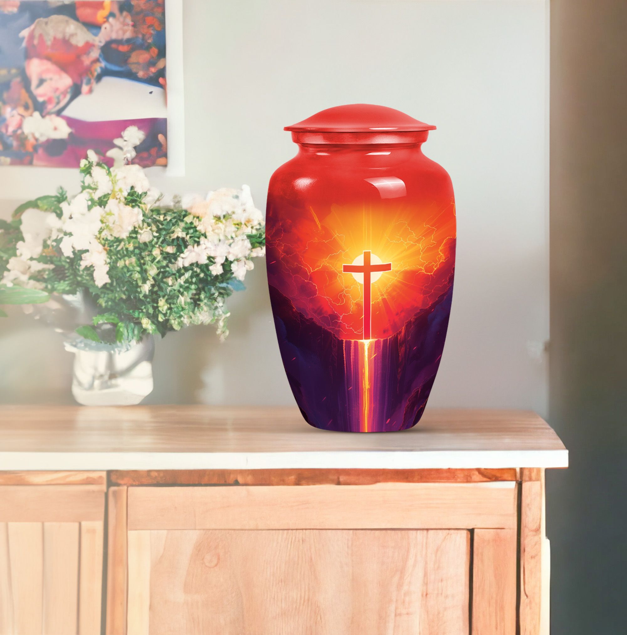 Our bespoke 10-inch Cross Urn is a dignified and respectful choice to preserve the memories of your departed loved ones. This large urn, weighing 3.3 pounds, has been intricately crafted from high-quality aluminum, ensuring longevity and durability. The aesthetic theme of Aurora Borealis provides an appealing celestial touch, commenced with a classic urn design that will seamlessly fit any decor. With a generous capacity, it can accommodate up to 200 cubic inches of cremains, sufficient for adult ashes. The urn is easily customizable, allowing for engraved names to add a personal touch. It comes coupled with a Velvet pouch intended for the safe containment of ashes, ensuring your cherished memories remain secure. This cremation urn beautifully encapsulates memorial burial essence, making it a significant artifact during periods of remembrance. Opt for this cross urn for a solemn, unique, and personal way to celebrate a life lived and loved. Ideal for funeral burials, it is a fitting tribute for adults and seniors.