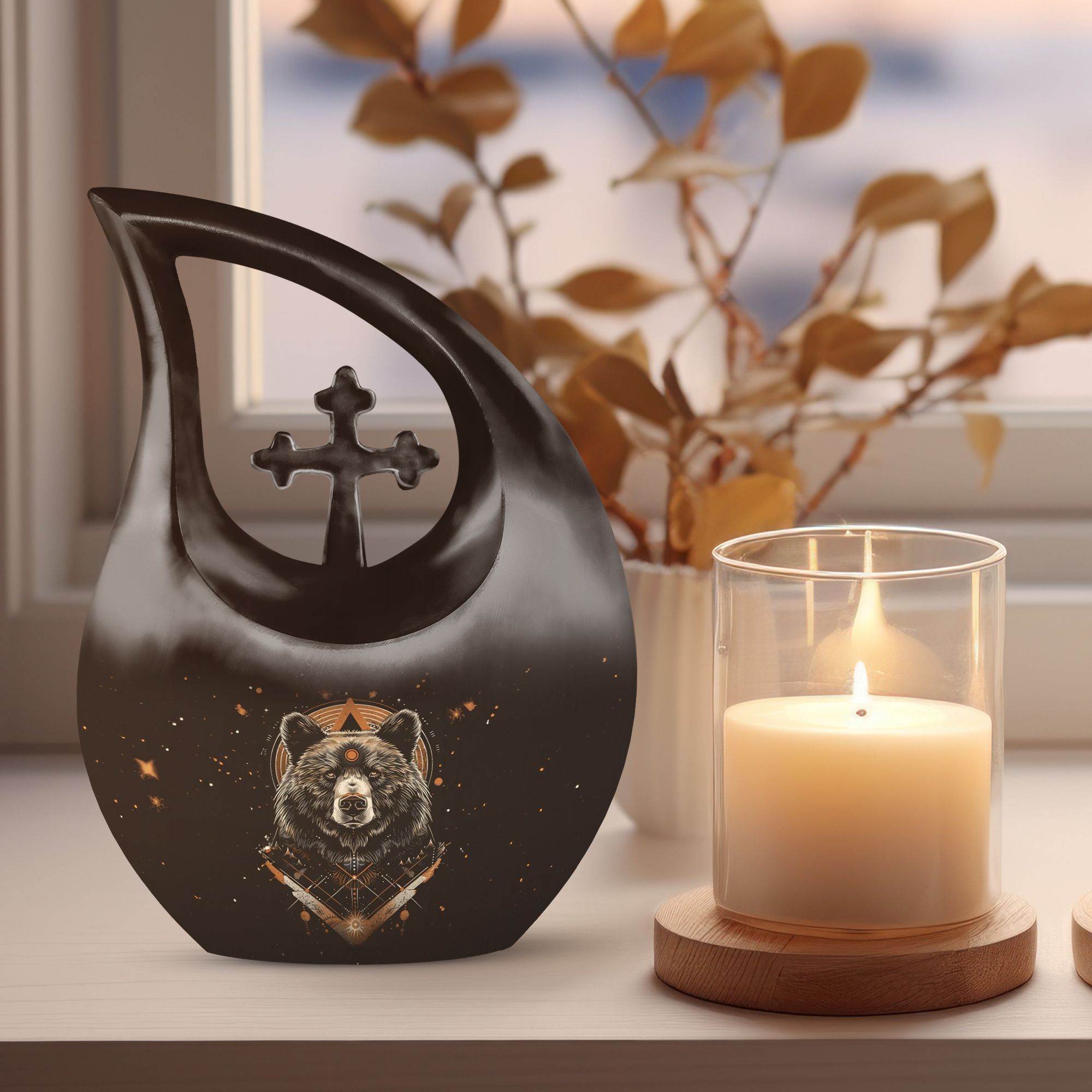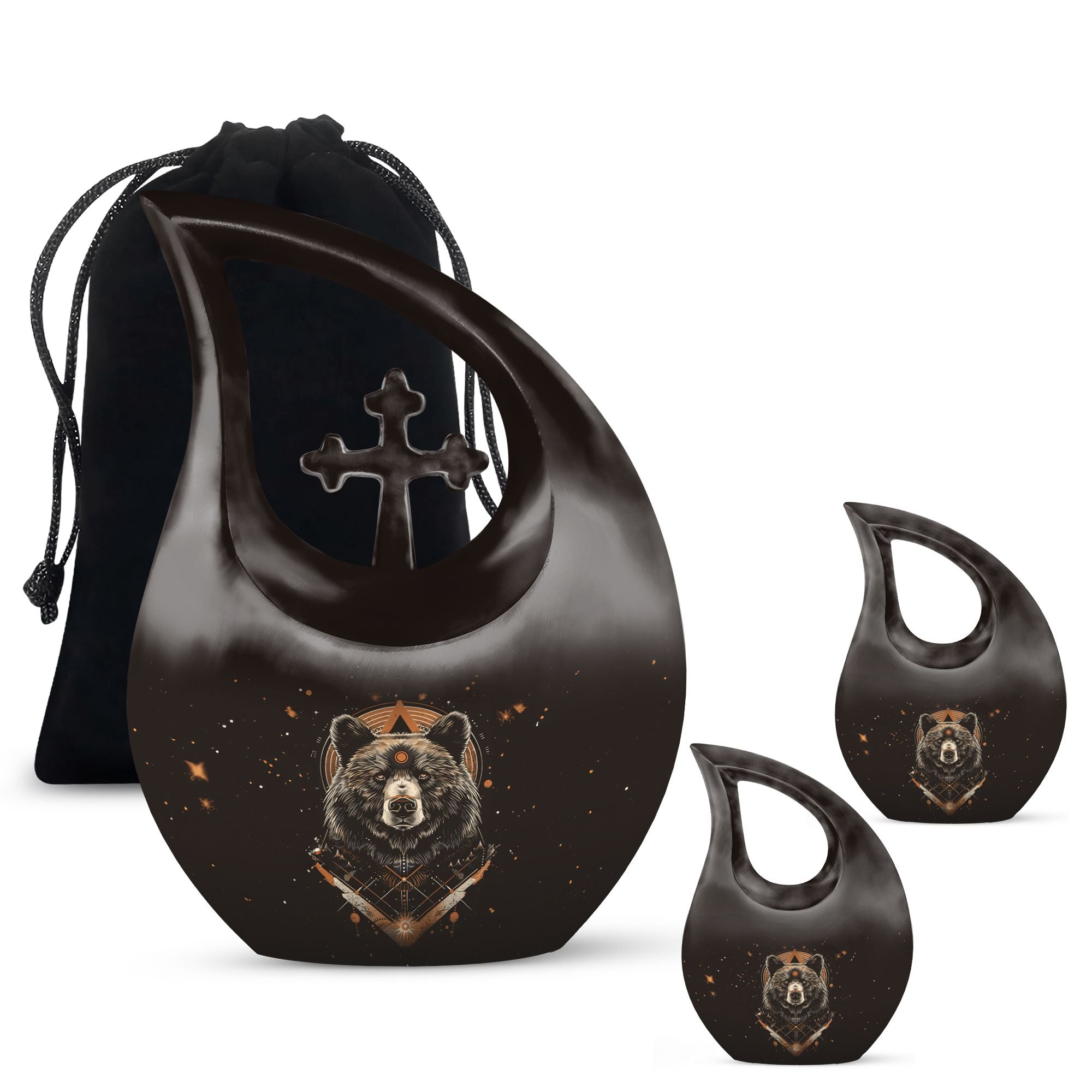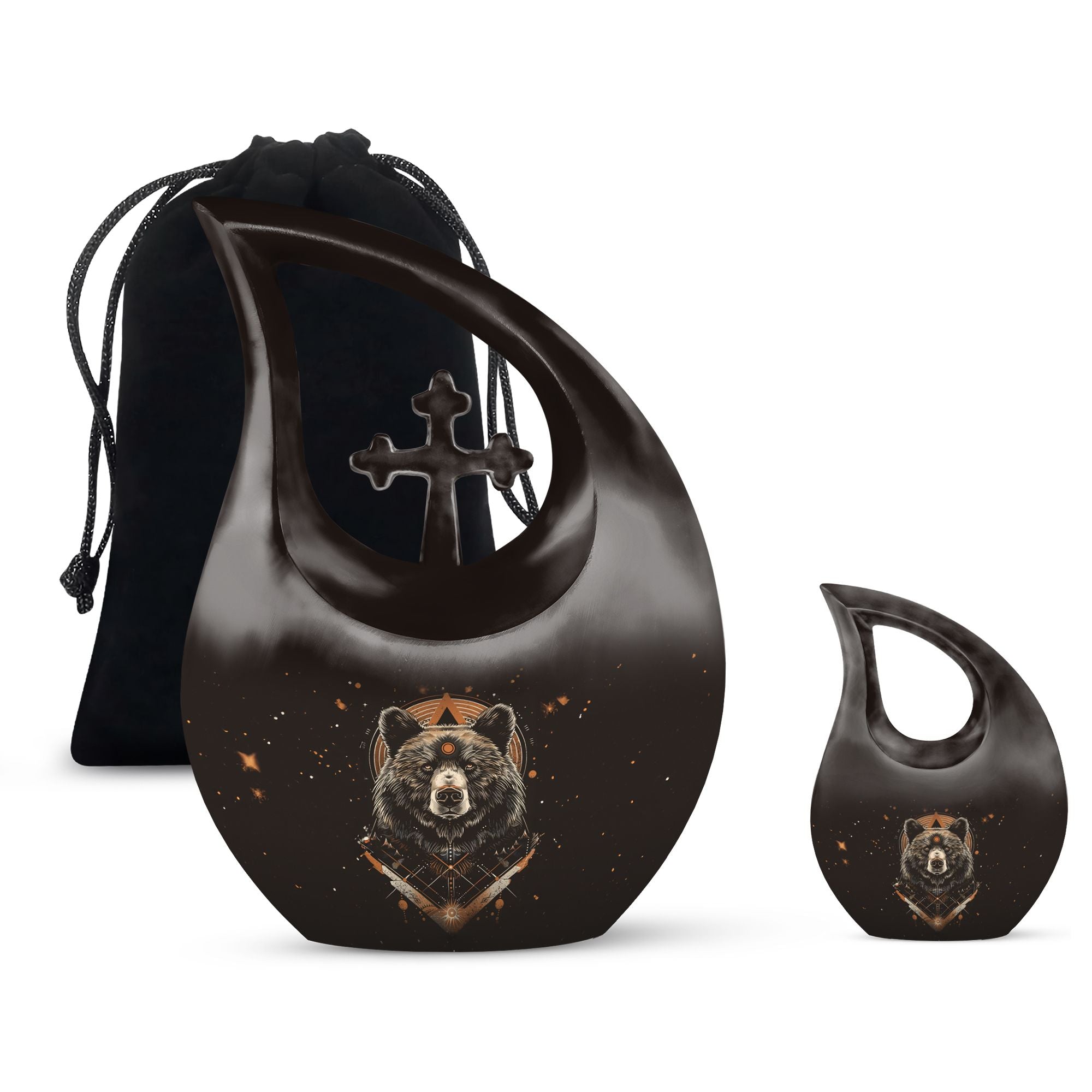 Introducing our distinguished Bear Urn, an exceptional selection when shopping for urns online. Fashioned from robust aluminium, this memorial urn measures 10 inches in height and weighs a sturdy 3.3 pounds. Its size not only adds to its exquisite presence but allows a substantial capacity of 200 cubic inches, making it one of our most popular large urns. Each package is complemented with a soft velvet pouch, a thoughtful containment for cherished ashes. This cremation box for adults boasts a unique 'Cross Drop' theme, evoking a sense of serenity and honor. You can make this urn truly reflective of your loved one by personalizing it with engraved names. This urn is not only a respectful resting place but a keepsake memory box. Popular search queries by adults and seniors in this category include 'cool urns' and 'metal urns for ashes'. So why search further when you can commemorate your treasured one with our Bear themed urn.