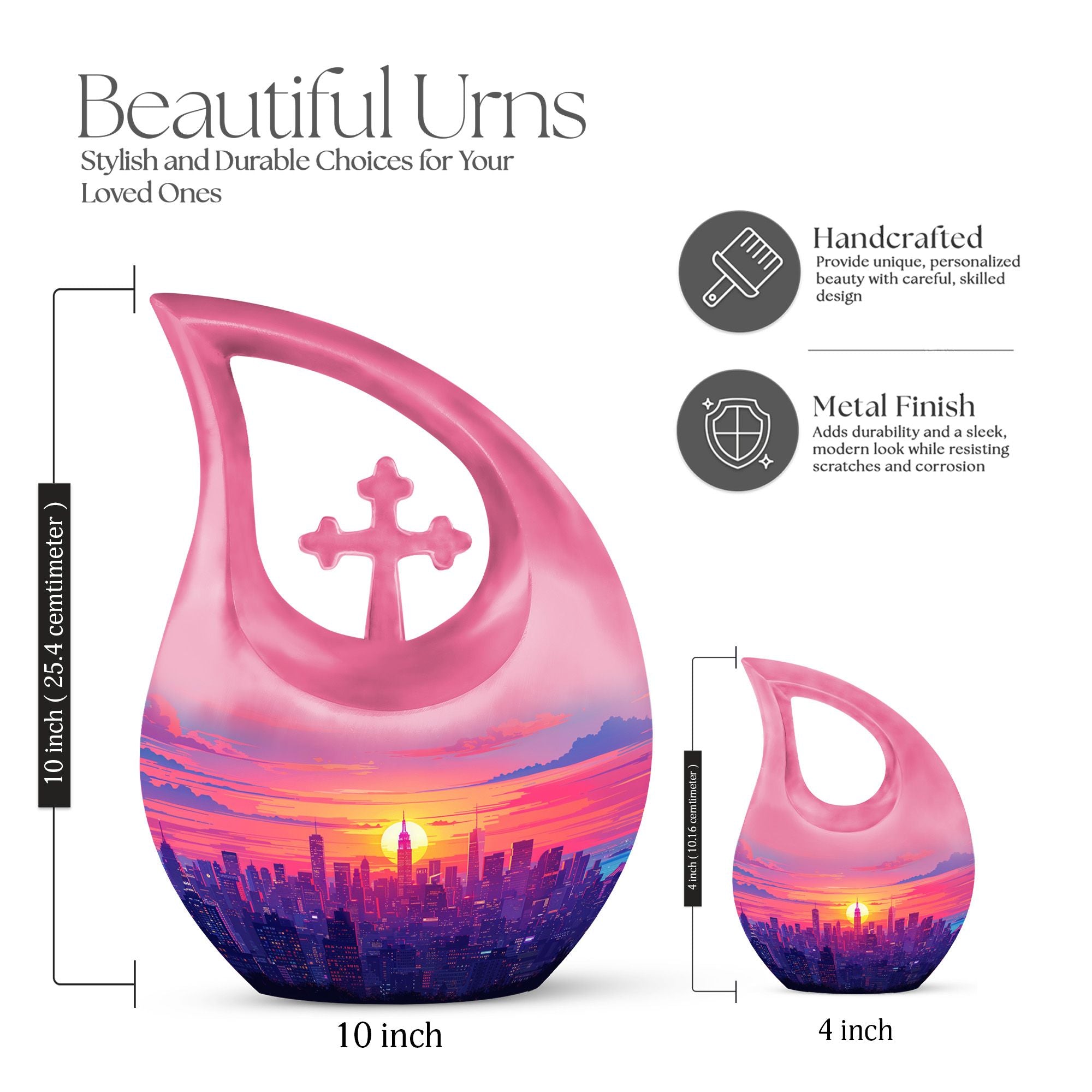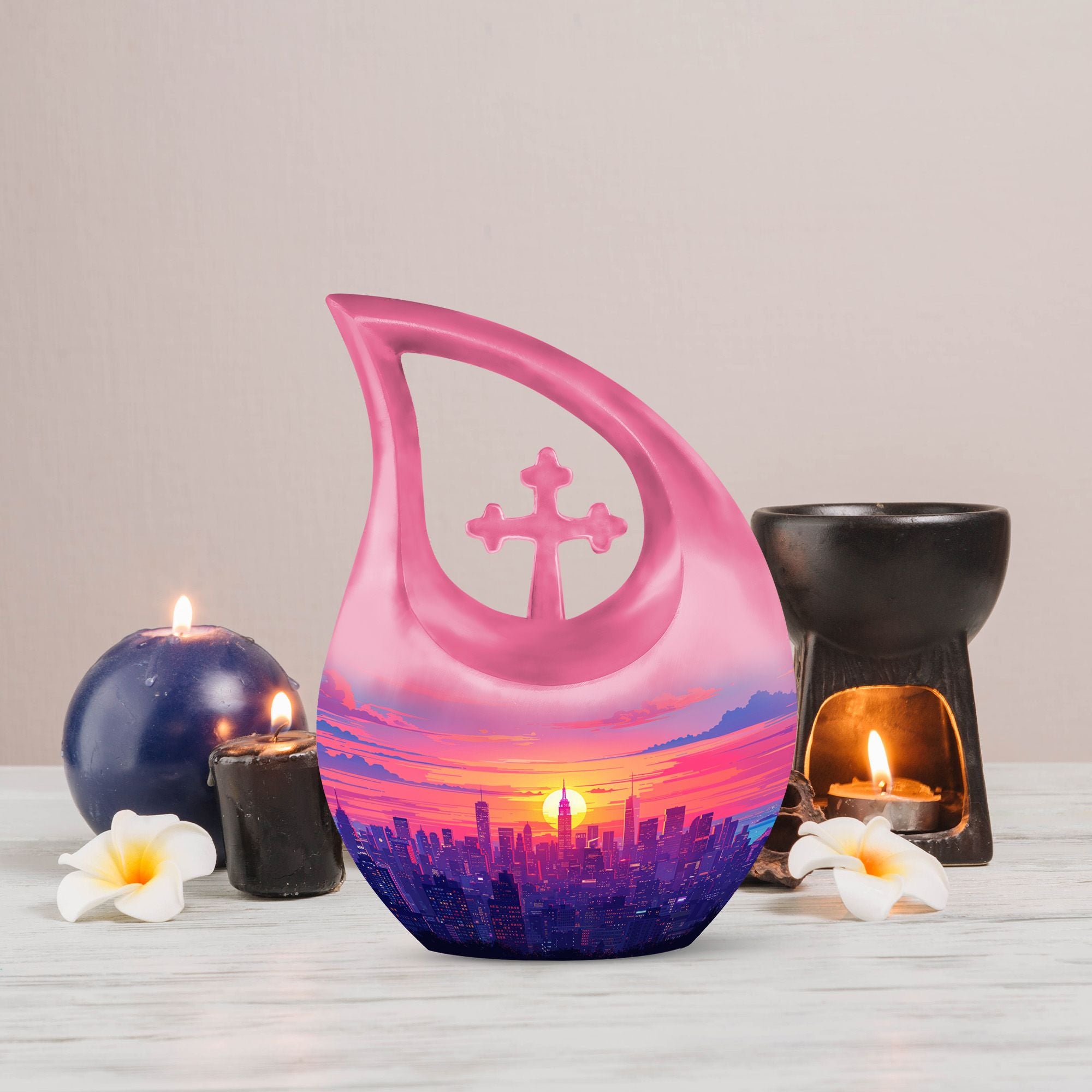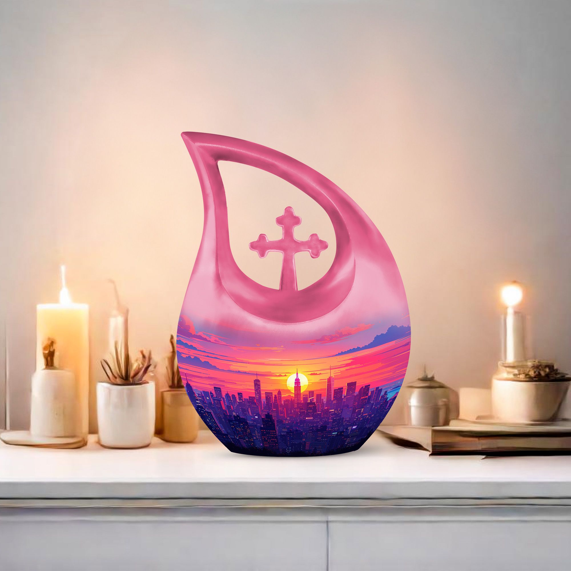 The Pink Sunset Cityscape Urn with Cross Design is a touching tribute to a cherished soul, created to hold memories as beautifully as it holds ashes. Its gentle pink tones and serene cityscape pattern evoke calmness, while the delicate cross signifies faith and everlasting love. This large urn for adult ashes serves as a meaningful way to honor a life well-lived and deeply loved.
