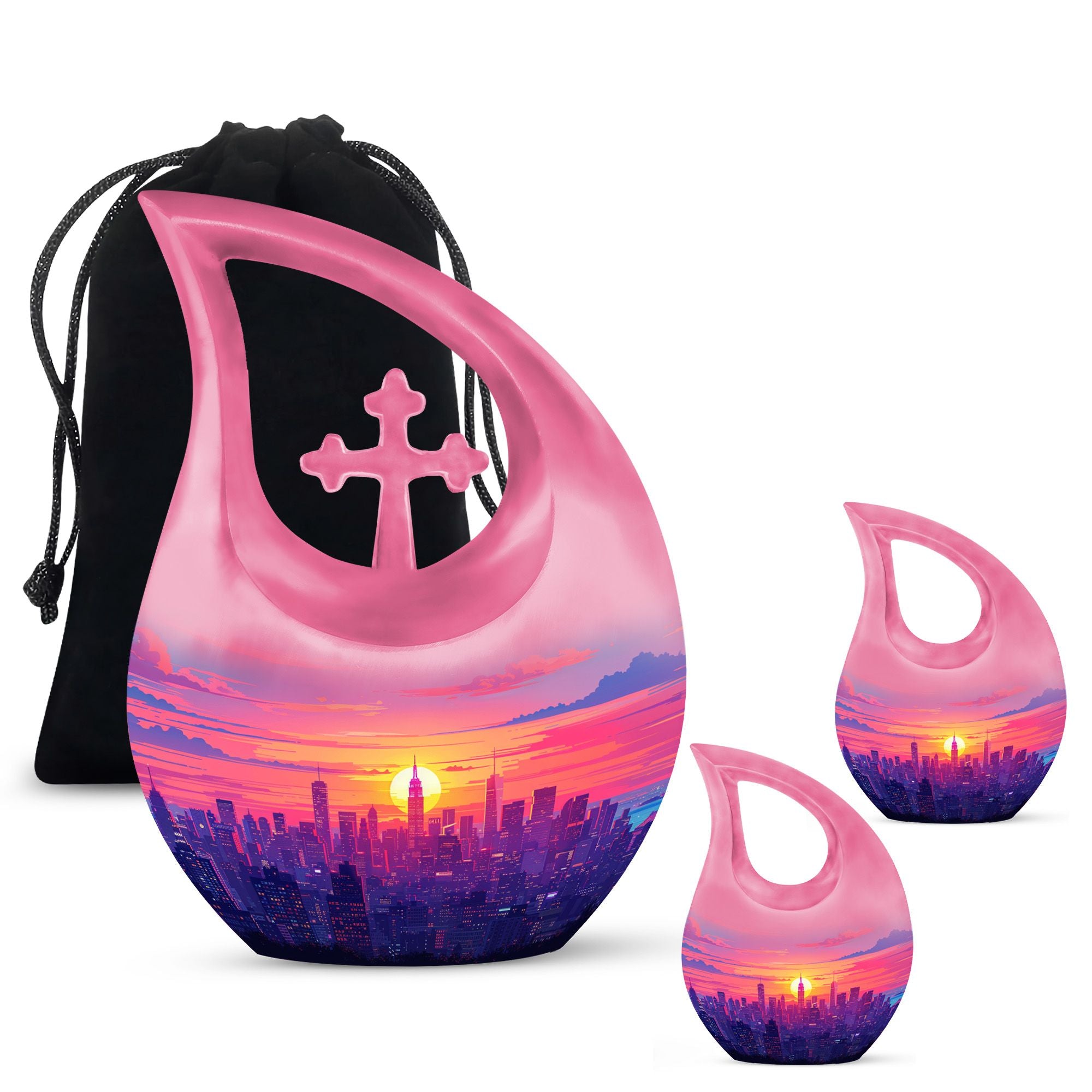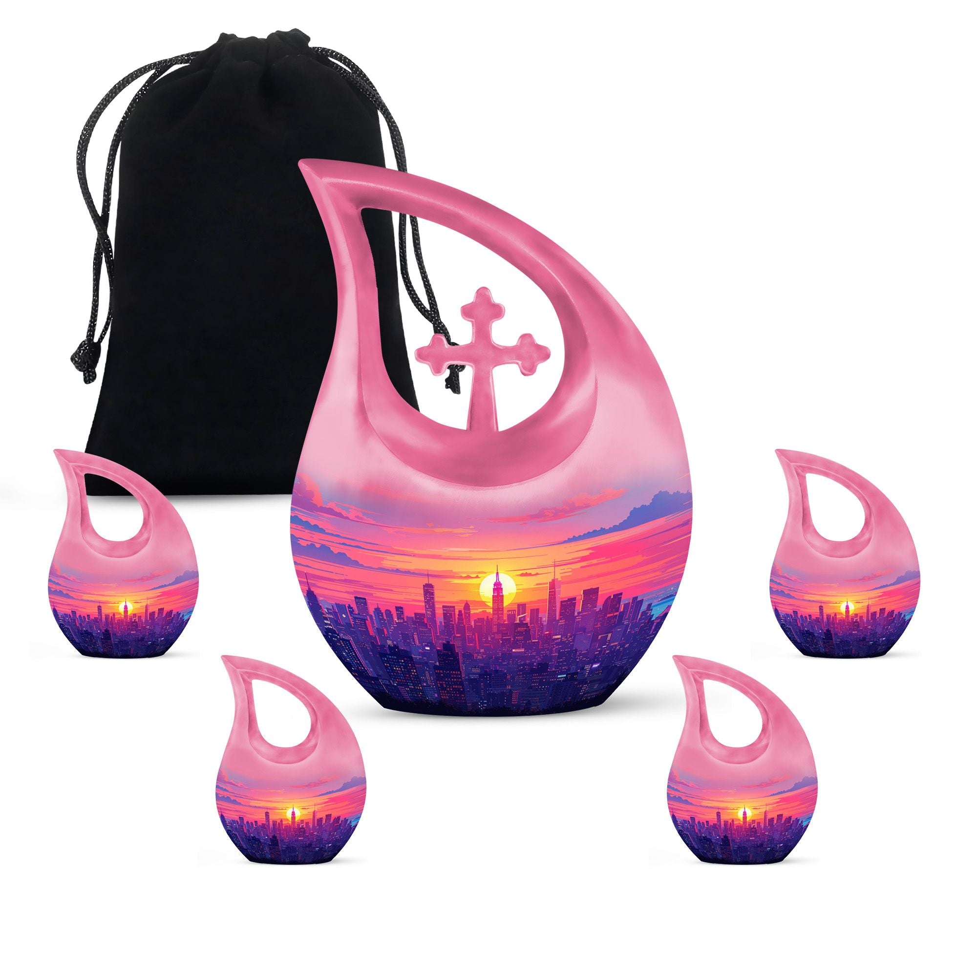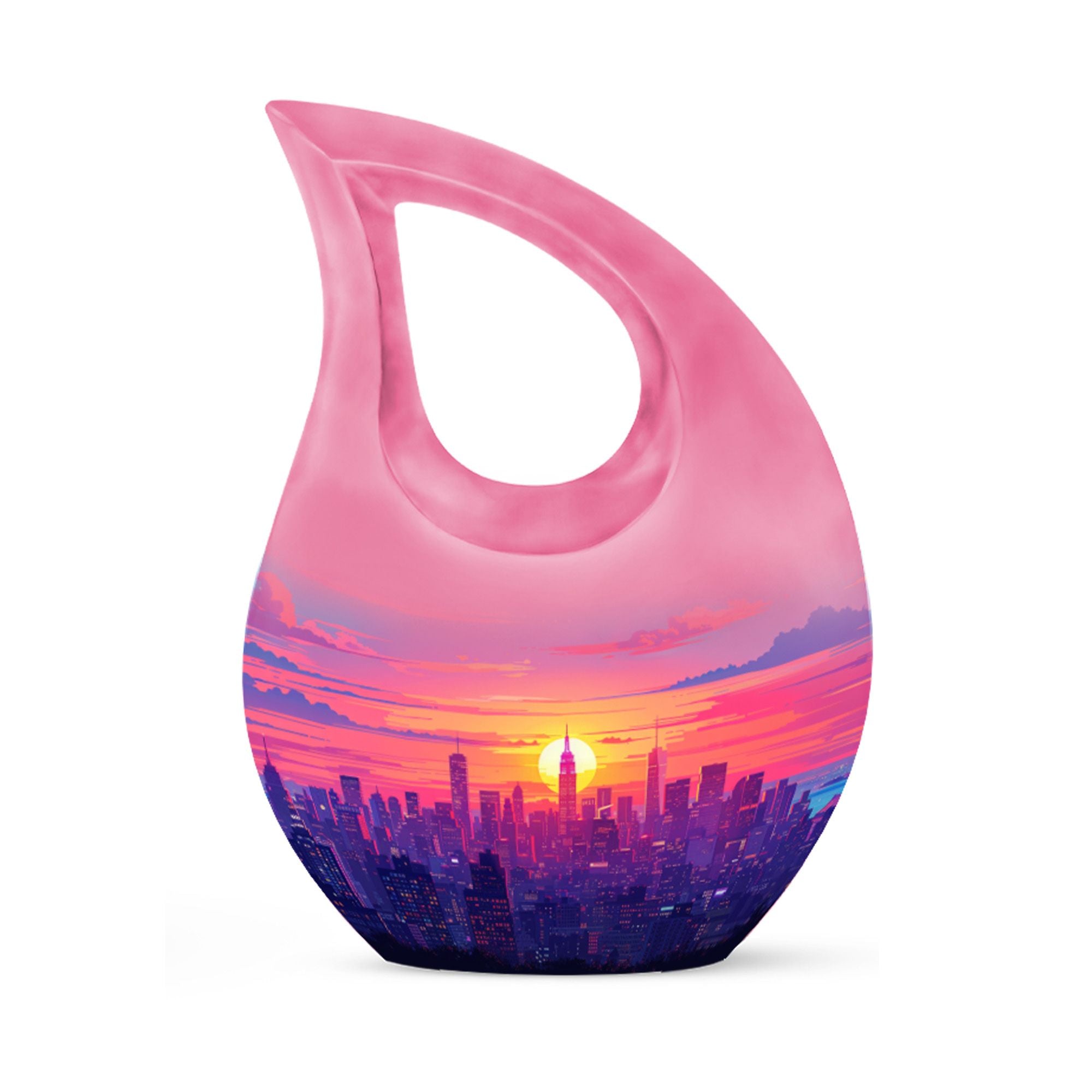 The Pink Sunset Cityscape Urn with Cross Design is a touching tribute to a cherished soul, created to hold memories as beautifully as it holds ashes. Its gentle pink tones and serene cityscape pattern evoke calmness, while the delicate cross signifies faith and everlasting love. This large urn for adult ashes serves as a meaningful way to honor a life well-lived and deeply loved.