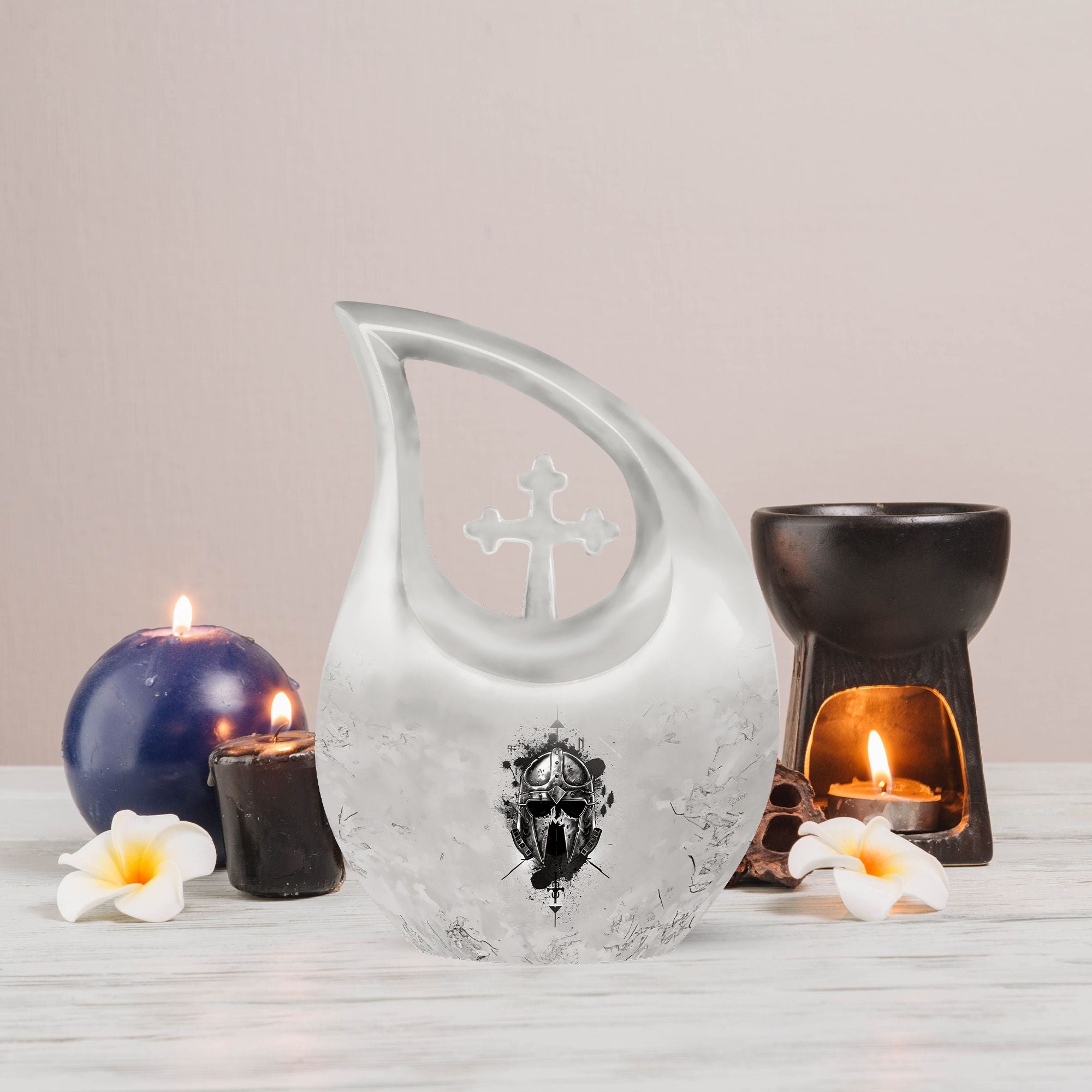 Honor the cherished memories of your departed loved ones with this beautifully crafted 10-inch Catholic Urn. Precision manufactured from high-quality aluminium, this substantial urn vase weighs 3.3 pounds and is compatible with a capacity of 200 cubic inches - ample space for commemorating our departed plurality. The theme resonates a Catholic aura, specifically featuring a Cross Drop design that shows respect and profound love for your passed beloved. Along with the urn, a velvet pouch is included in the package for containment of ashes, offering a discreet and respectful storage solution. The urn also allows for personalization; engrave the names of your beloved onto it, making it an enduring symbol of remembrance. Perfectly balancing the notions of temporary and timeless, this urn is a poignant choice that seamlessly integrates into the memorial ceremonies. Relevant searches: memorial urns, keepsake urns for human ashes, small urns for human ashes, biodegradable urn, cremation urns for burial, large urns.