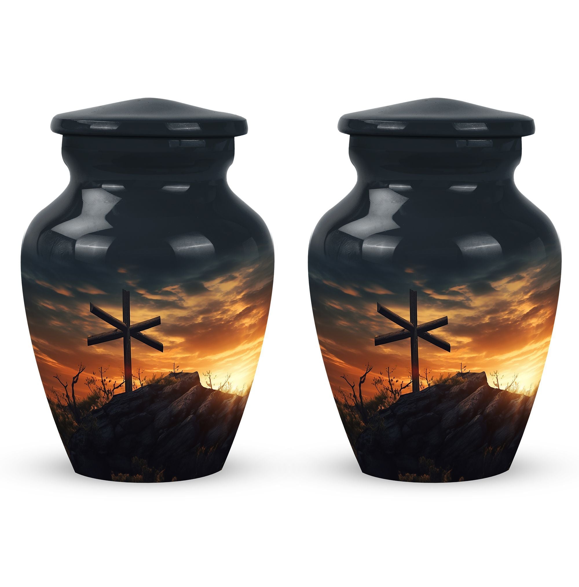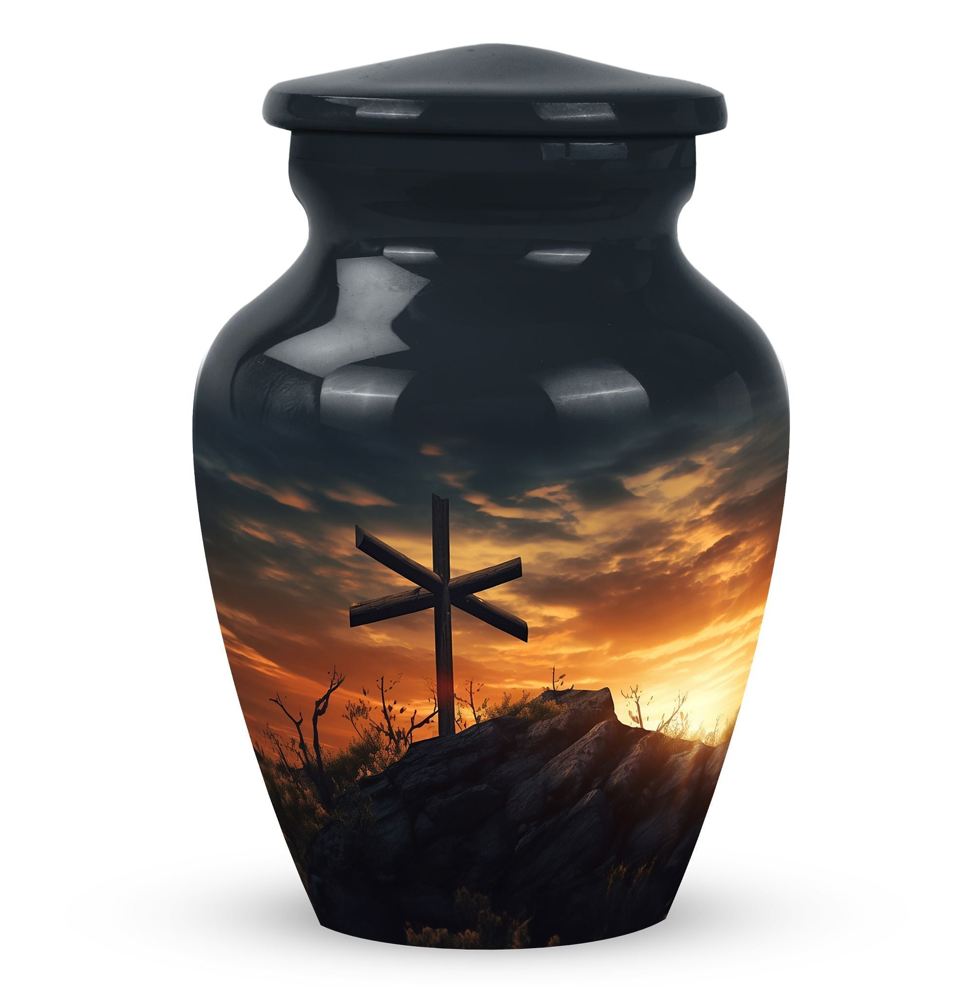 Pay a soulful tribute to a loved one with this 'Christ Cross Large Urn', an elegantly crafted memorial element. Exclusively designed for adults and seniors, this imposing aluminium urn is perfect for modern inurnment practices. The 3.3-pound, solid aluminium piece stands at 10 inches in height, with an imposing presence in any indoor or outdoor space. With a capacity of 200 cubic inches, it's an essential component for the post-ceremony storage. This Urn comes with a tastefully arranged velvet pouch perfect for the containment of ashes. It offers a personalized touch too – have the names of the departed engraved on the urn, celebrating their memory. Its robust design, combining weight and dimensions, ensures steady placement during memento display. This Cremation Urn serves as a respectful and meaningful way to remember your loved ones. Highly searchable in regards to 'Cremation Urns for Burial', 'Urns for Dad', 'Decorative Urns for Human Ashes', and 'Modern Urn'. Still searching 'sorry for your loss'? Consider this Classic Urn – a meaningful choice.