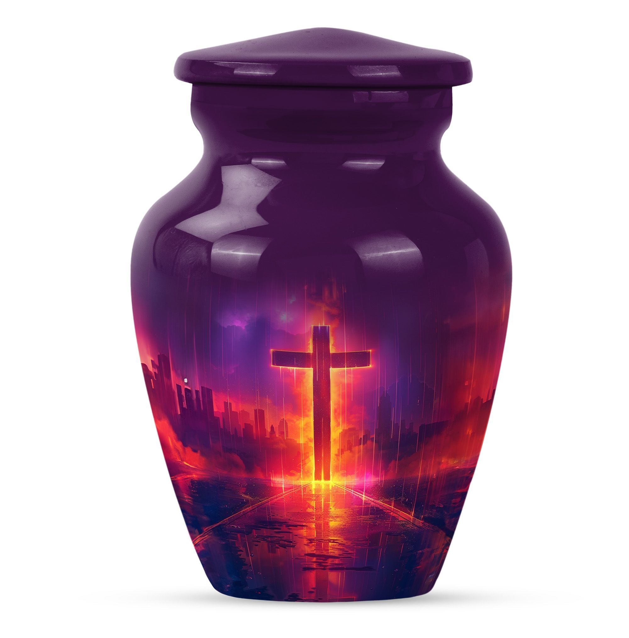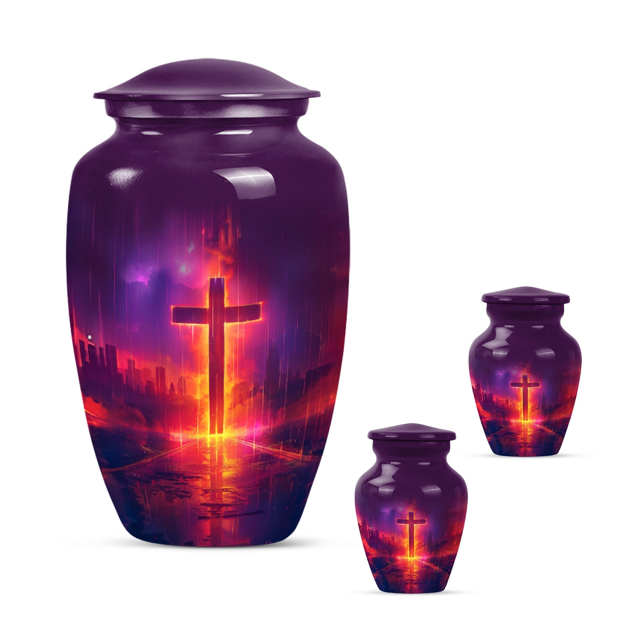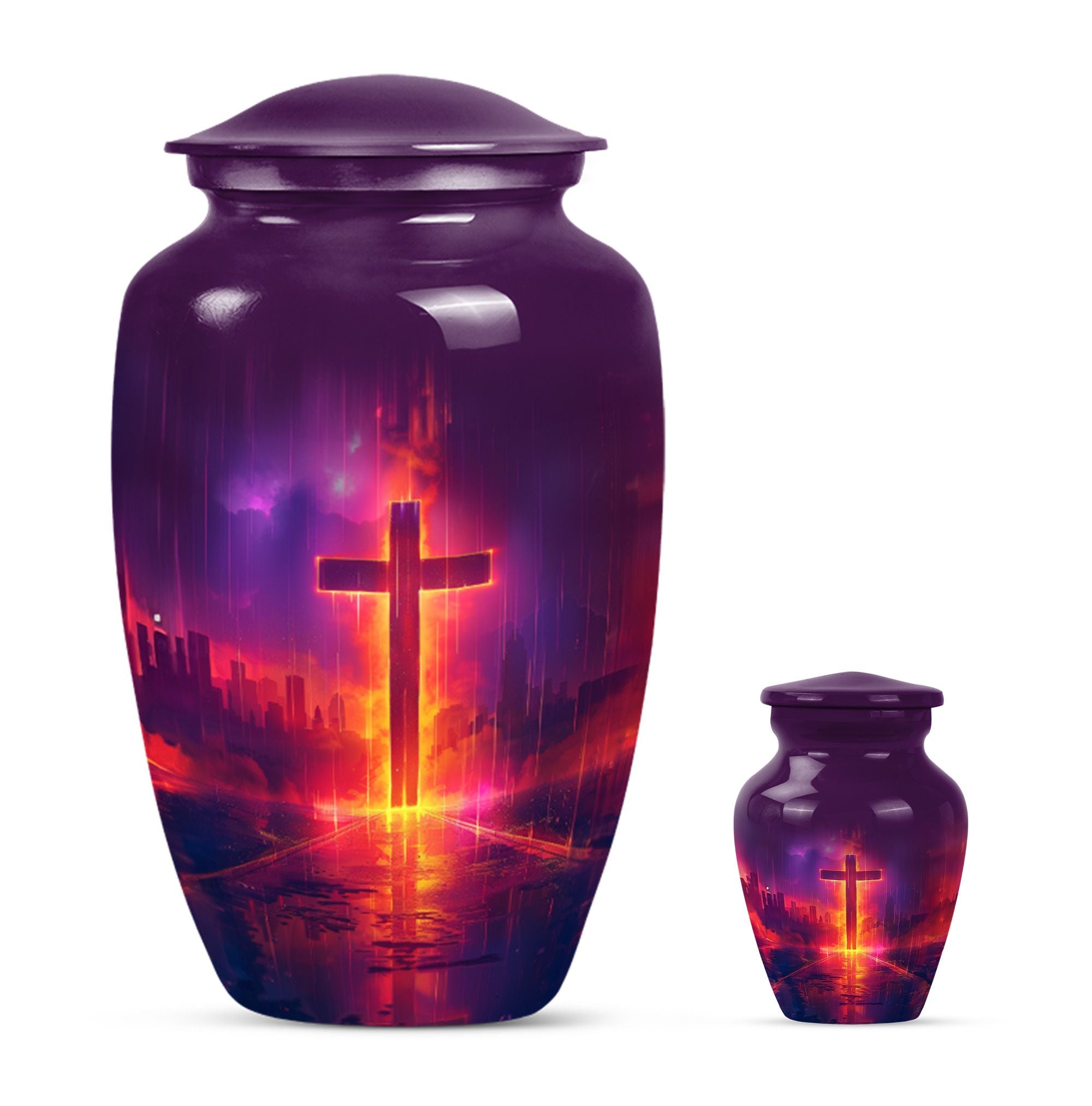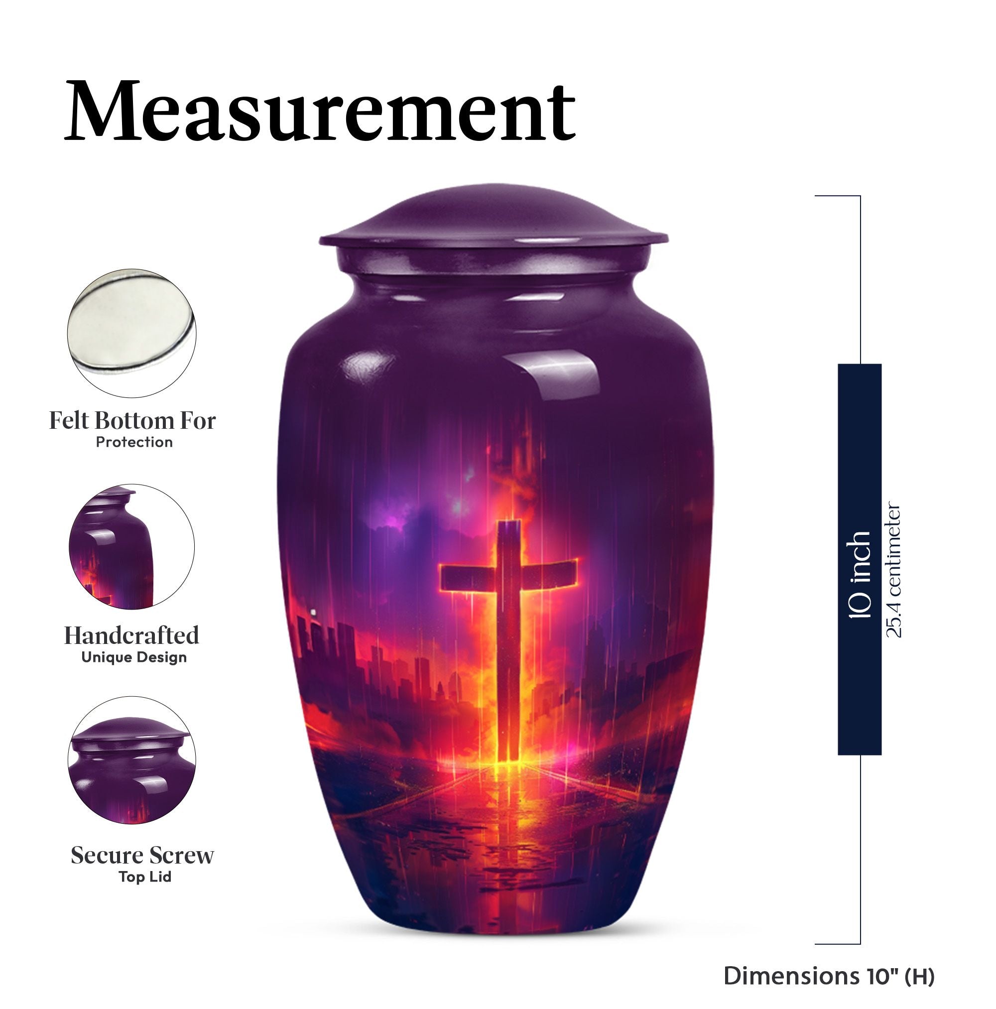 Honoring your loved one's memory becomes a serene affair with our 10 inch Aurora Borealis Themed Cross Urn. Crafted from high-quality aluminium, this cremation urn is designed to endure, weighing a substantial 3.3 pounds. Its capacity to hold 200 cubic inches of ashes makes it an ideal burial urn for adult males, though it supports the remains of men and women alike. With its classical urn design, it fits well in any memorial setting. The urn arrives with a soft velvet pouch for ash containment, ensuring dignity and grace in your process of remembrance. Personalize this large-sized urn with engraved names to make it uniquely yours. It's not just a cremation urn, but also can be used for burial in the ground. Our funeral metal urn provides you a meaningful way to celebrate your loved one's journey, making their memory an everlasting part of your life.