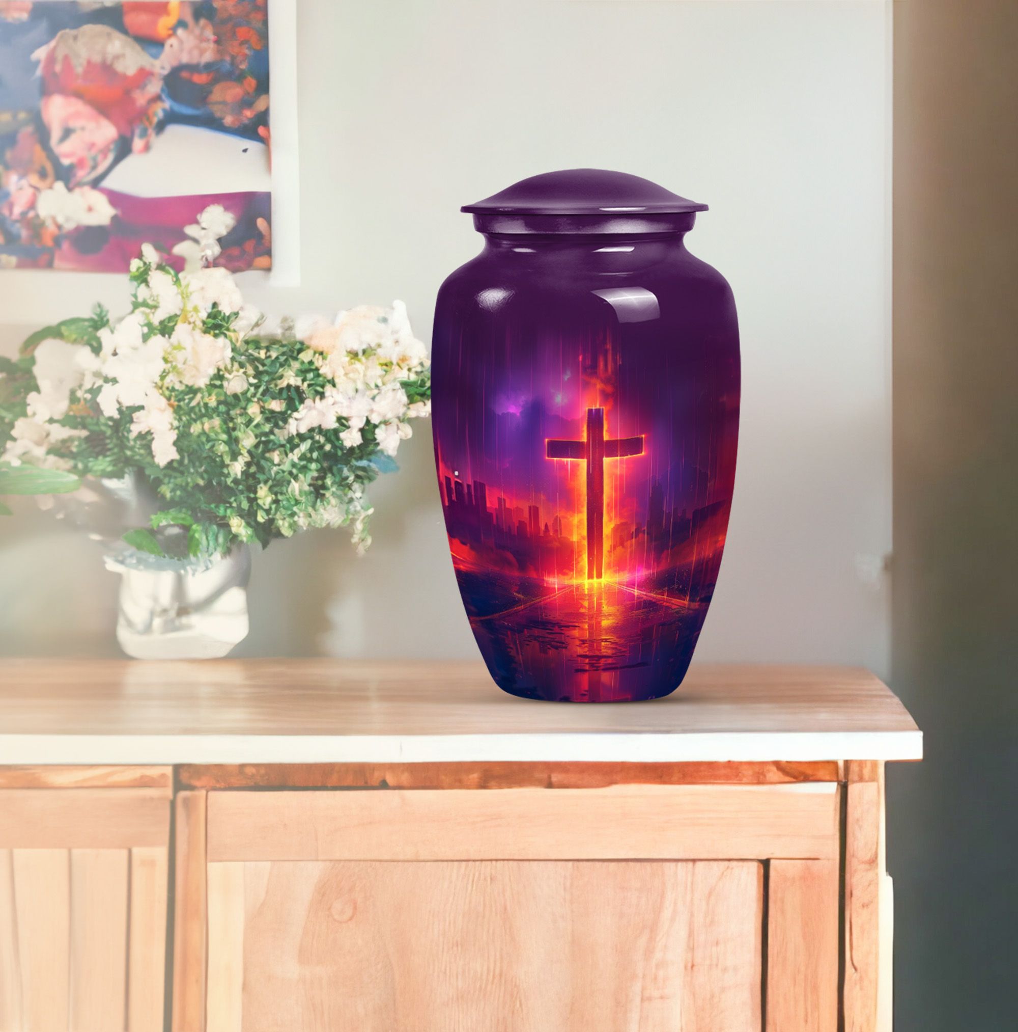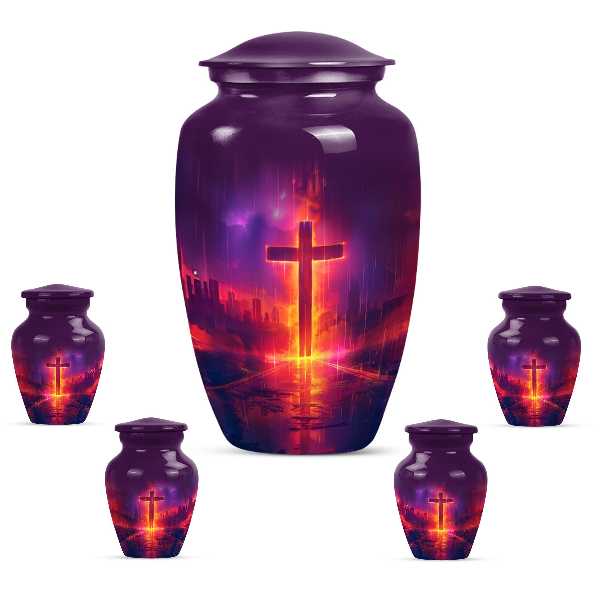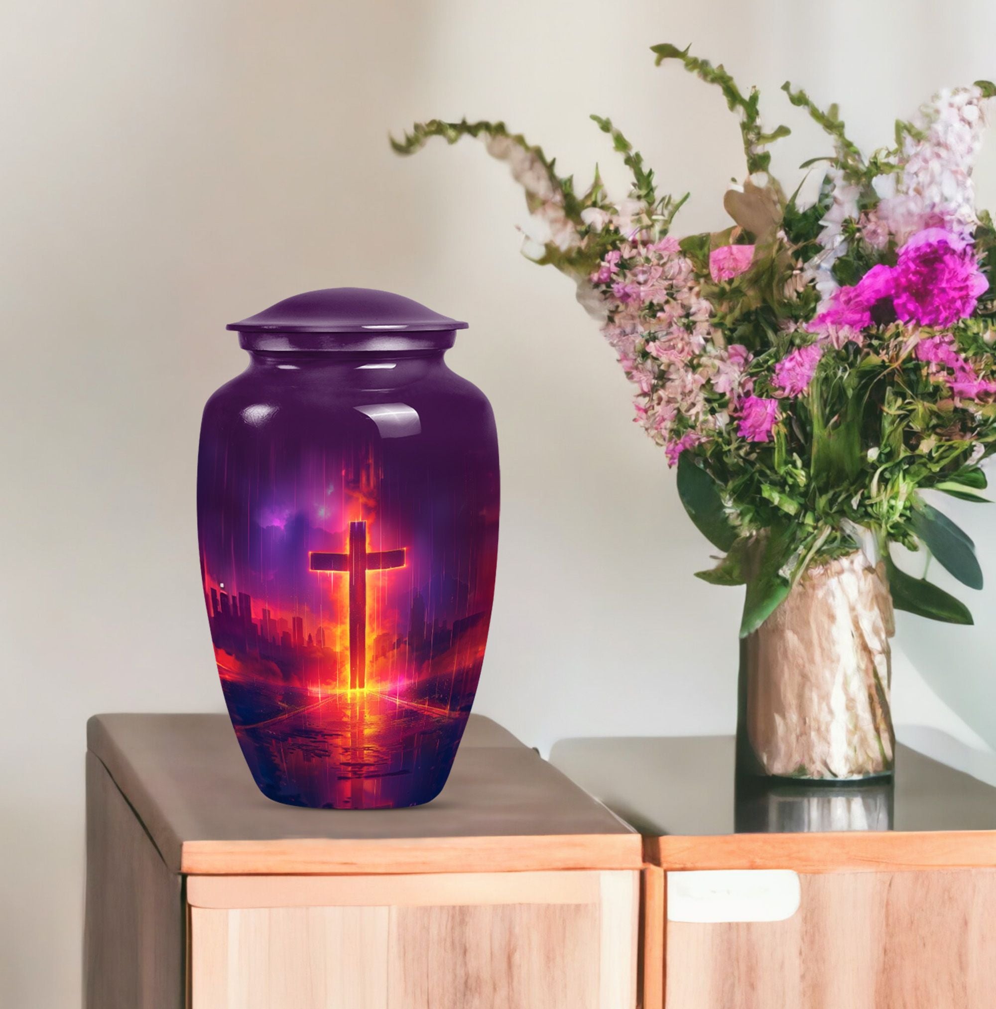Honoring your loved one's memory becomes a serene affair with our 10 inch Aurora Borealis Themed Cross Urn. Crafted from high-quality aluminium, this cremation urn is designed to endure, weighing a substantial 3.3 pounds. Its capacity to hold 200 cubic inches of ashes makes it an ideal burial urn for adult males, though it supports the remains of men and women alike. With its classical urn design, it fits well in any memorial setting. The urn arrives with a soft velvet pouch for ash containment, ensuring dignity and grace in your process of remembrance. Personalize this large-sized urn with engraved names to make it uniquely yours. It's not just a cremation urn, but also can be used for burial in the ground. Our funeral metal urn provides you a meaningful way to celebrate your loved one's journey, making their memory an everlasting part of your life.