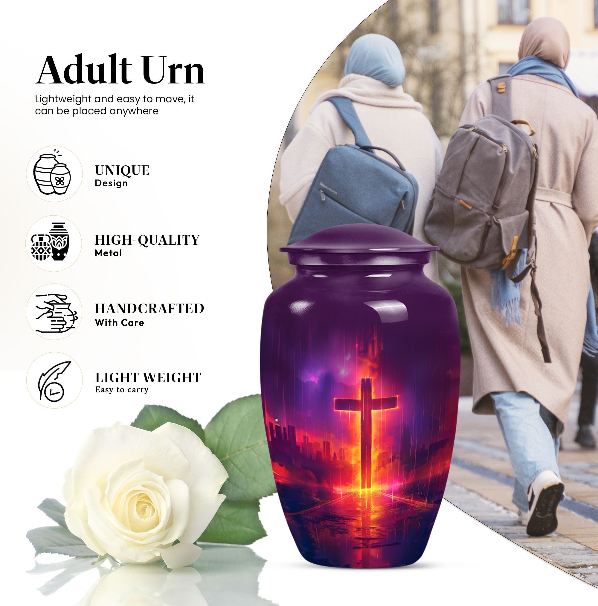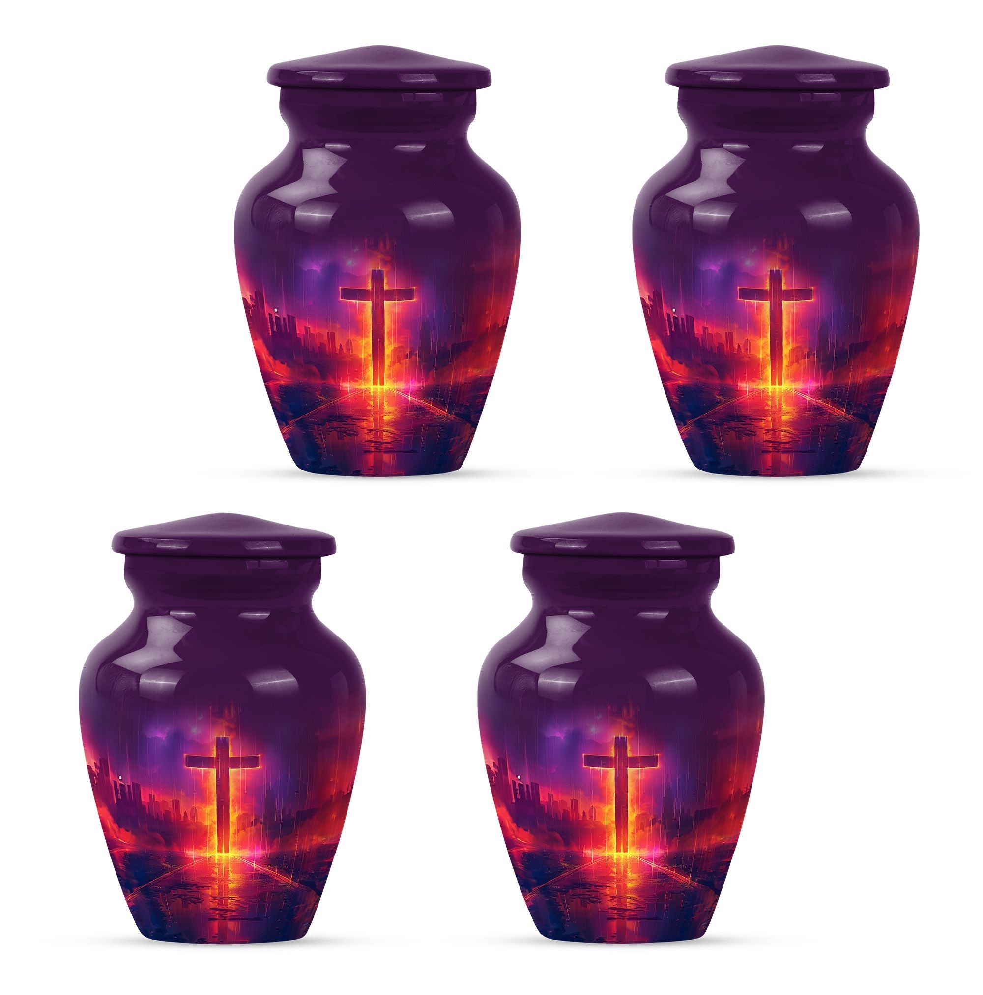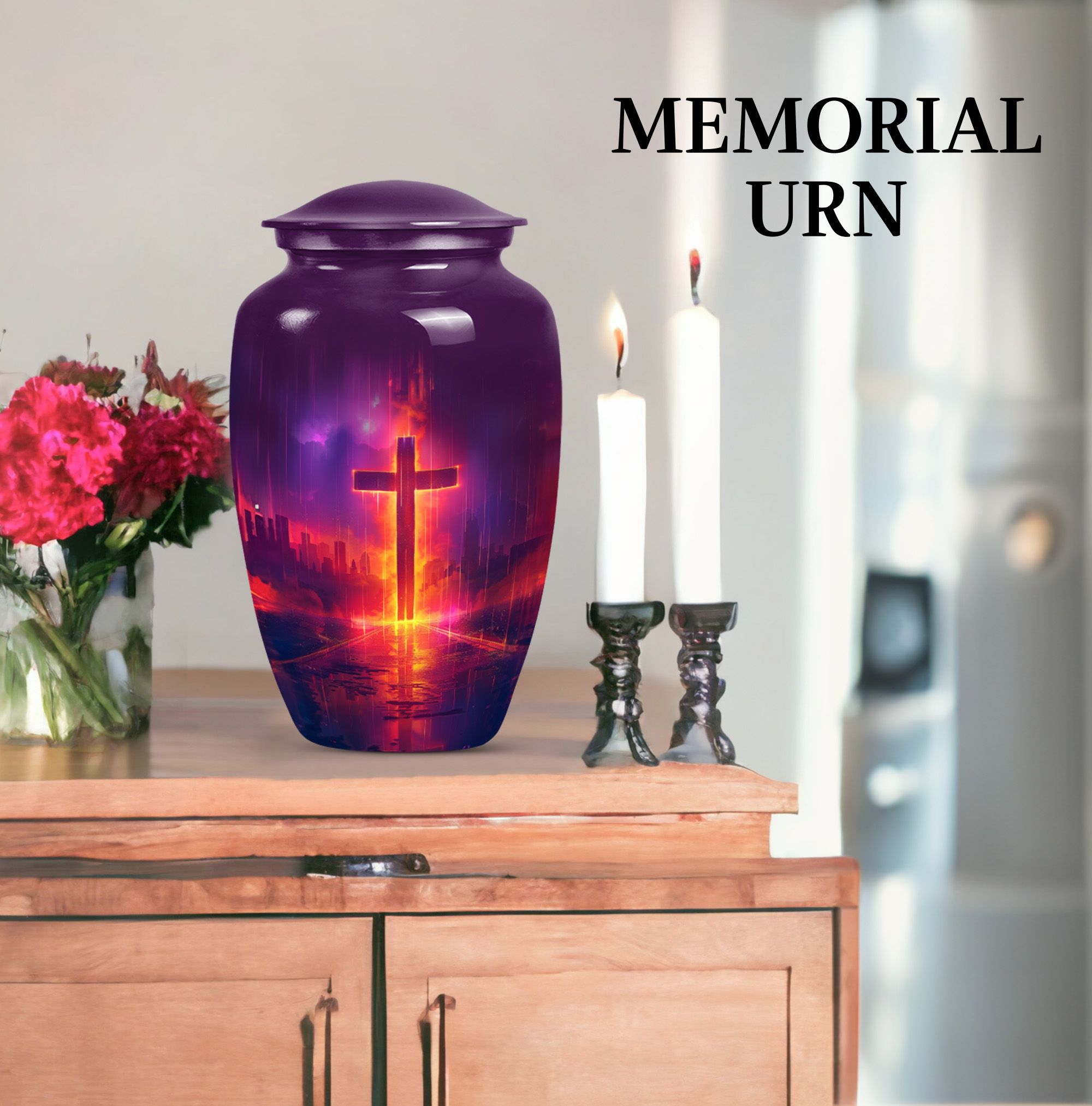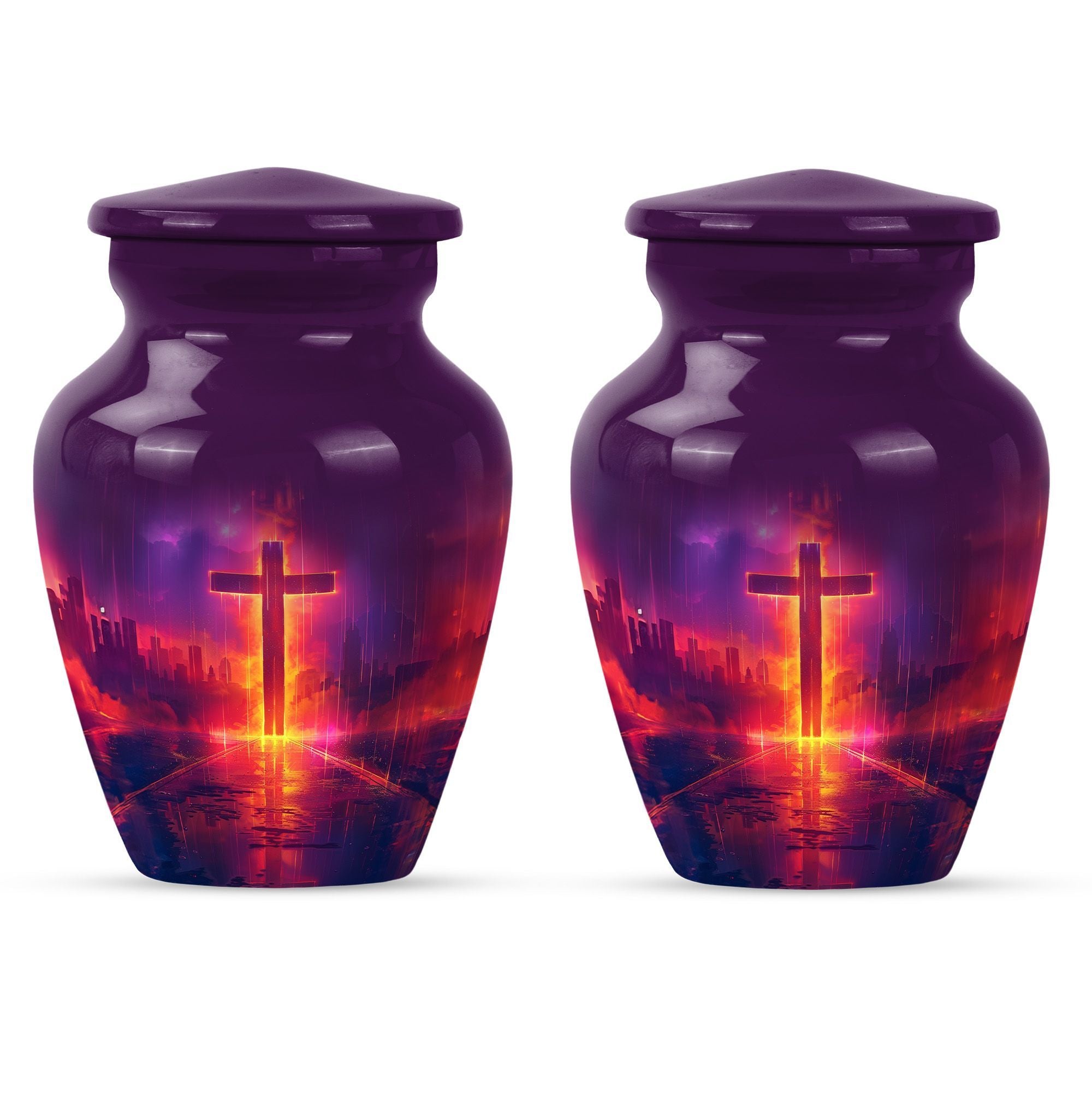 Honoring your loved one's memory becomes a serene affair with our 10 inch Aurora Borealis Themed Cross Urn. Crafted from high-quality aluminium, this cremation urn is designed to endure, weighing a substantial 3.3 pounds. Its capacity to hold 200 cubic inches of ashes makes it an ideal burial urn for adult males, though it supports the remains of men and women alike. With its classical urn design, it fits well in any memorial setting. The urn arrives with a soft velvet pouch for ash containment, ensuring dignity and grace in your process of remembrance. Personalize this large-sized urn with engraved names to make it uniquely yours. It's not just a cremation urn, but also can be used for burial in the ground. Our funeral metal urn provides you a meaningful way to celebrate your loved one's journey, making their memory an everlasting part of your life.
