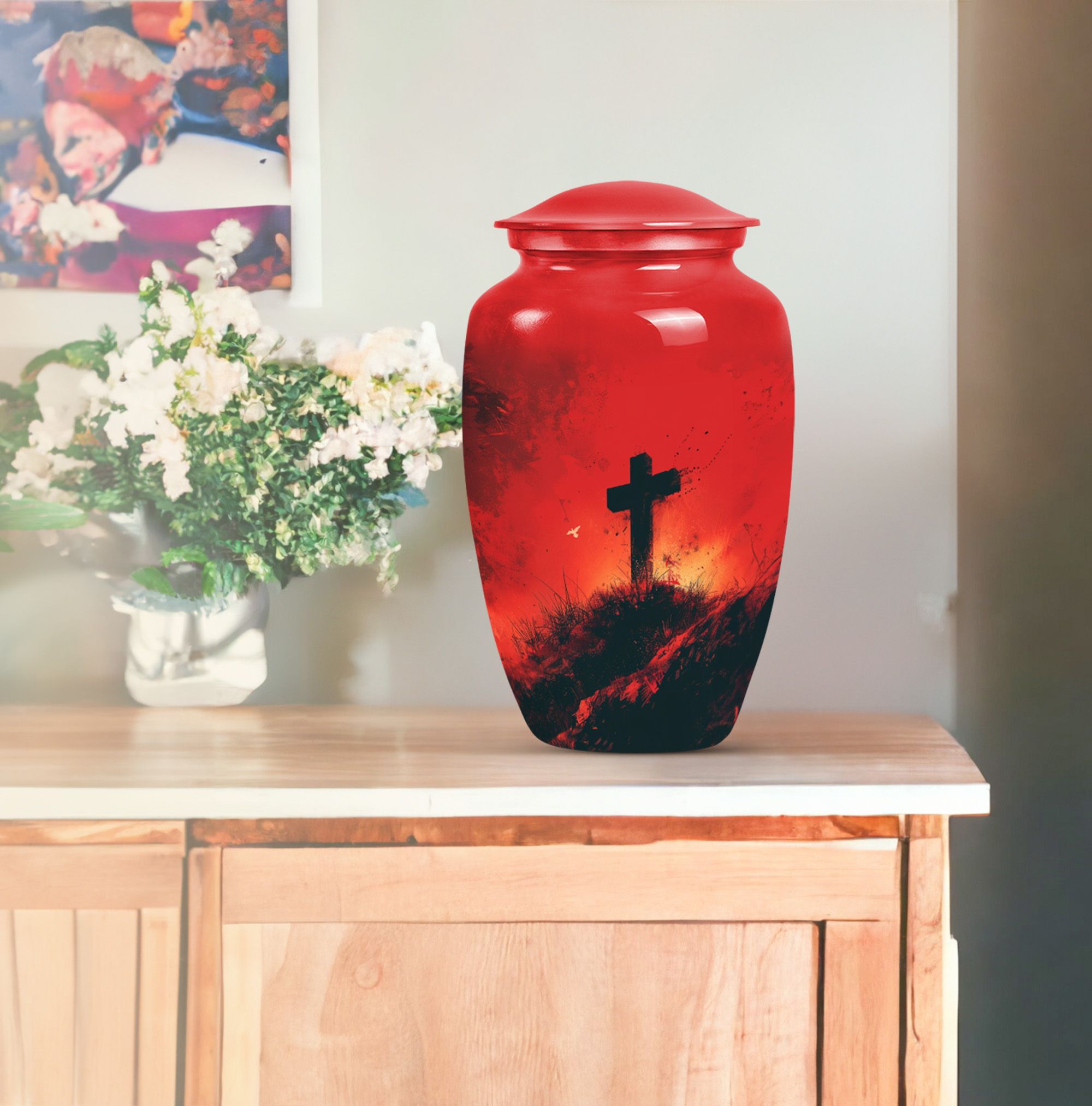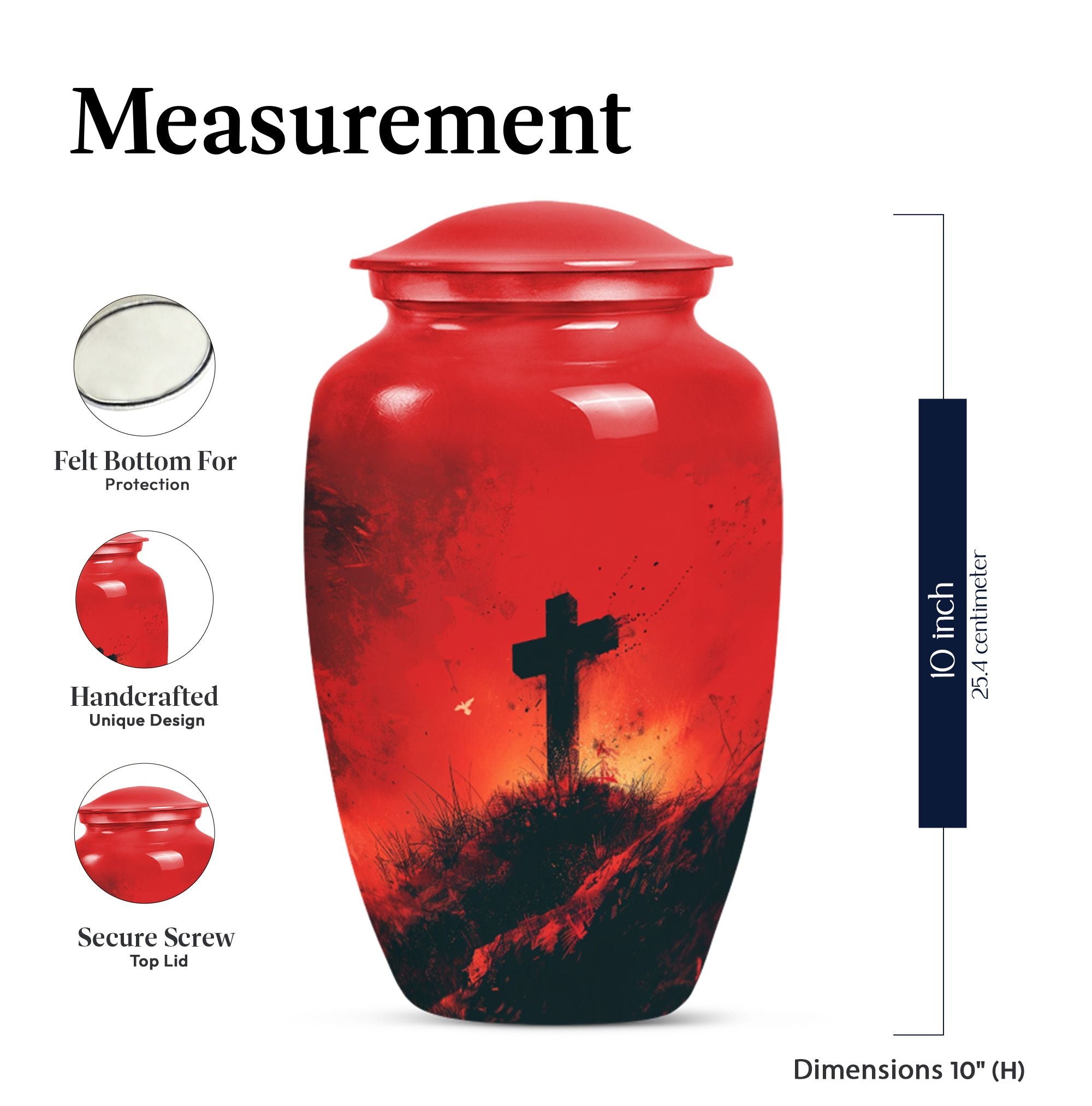Introducing our 'Cross Urn,' a 10-inch, large aluminium urn crafted for those seeking a burial custom urn or a cremation urn. The urn possesses an impressive space capacity of 200 cubic inches and weighs just 3.3 pounds, showcasing remarkable craftsmanship that locks the ashes securely. The Aurora Borealis theme brings a sense of peace, comfort, and beauty to this fascinating urn. To make it more personal, you can further engrave names or memorable messages. This cremation dad urn or urn for human ash women can become a special, honored space in your home. You'll also find a velvet pouch within the package, where one can keep the cherished ashes of your loved ones. A tastefully aesthetic and profoundly meaningful urn for human ashes adult that embodies love, respect, and memory. Perfect for memorial ceremonies, symbolizing eternal peace and tranquillity for departed souls.