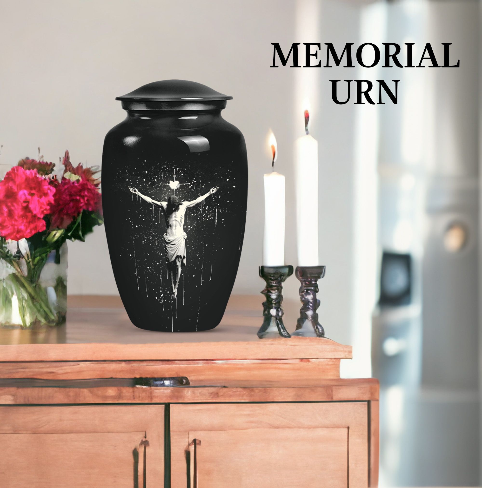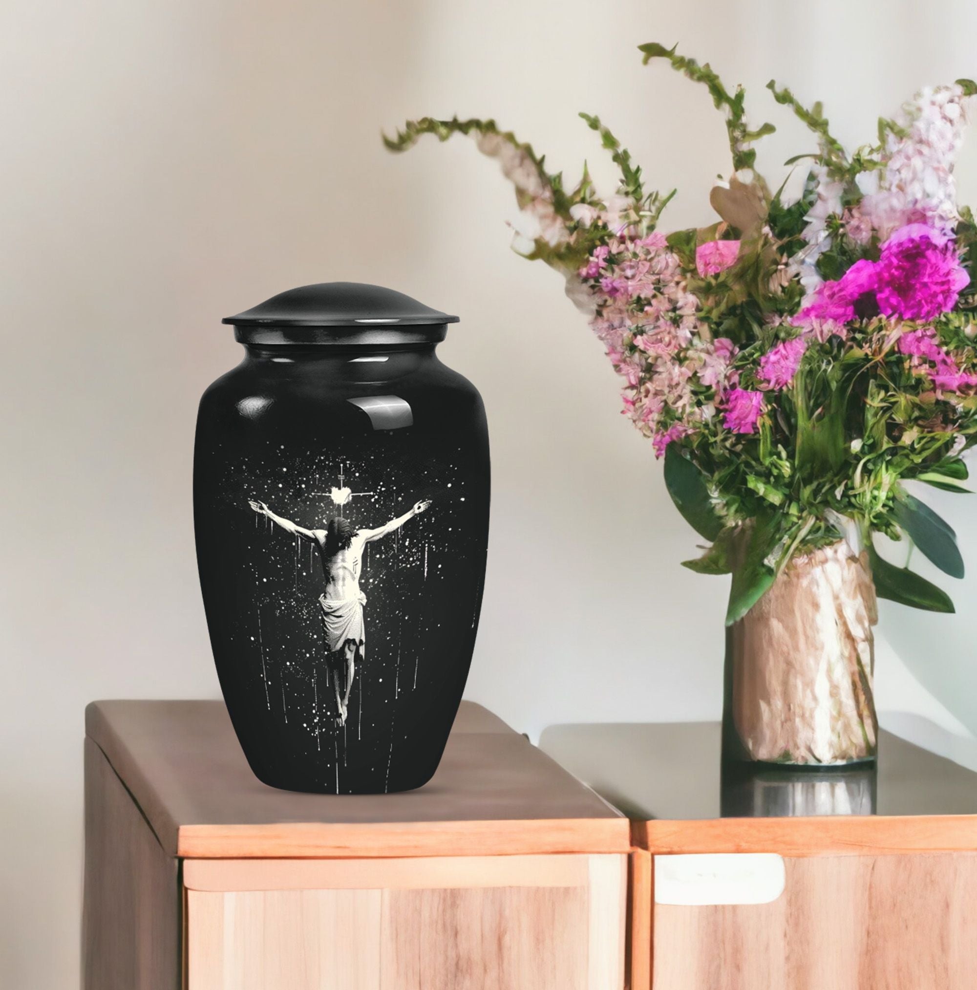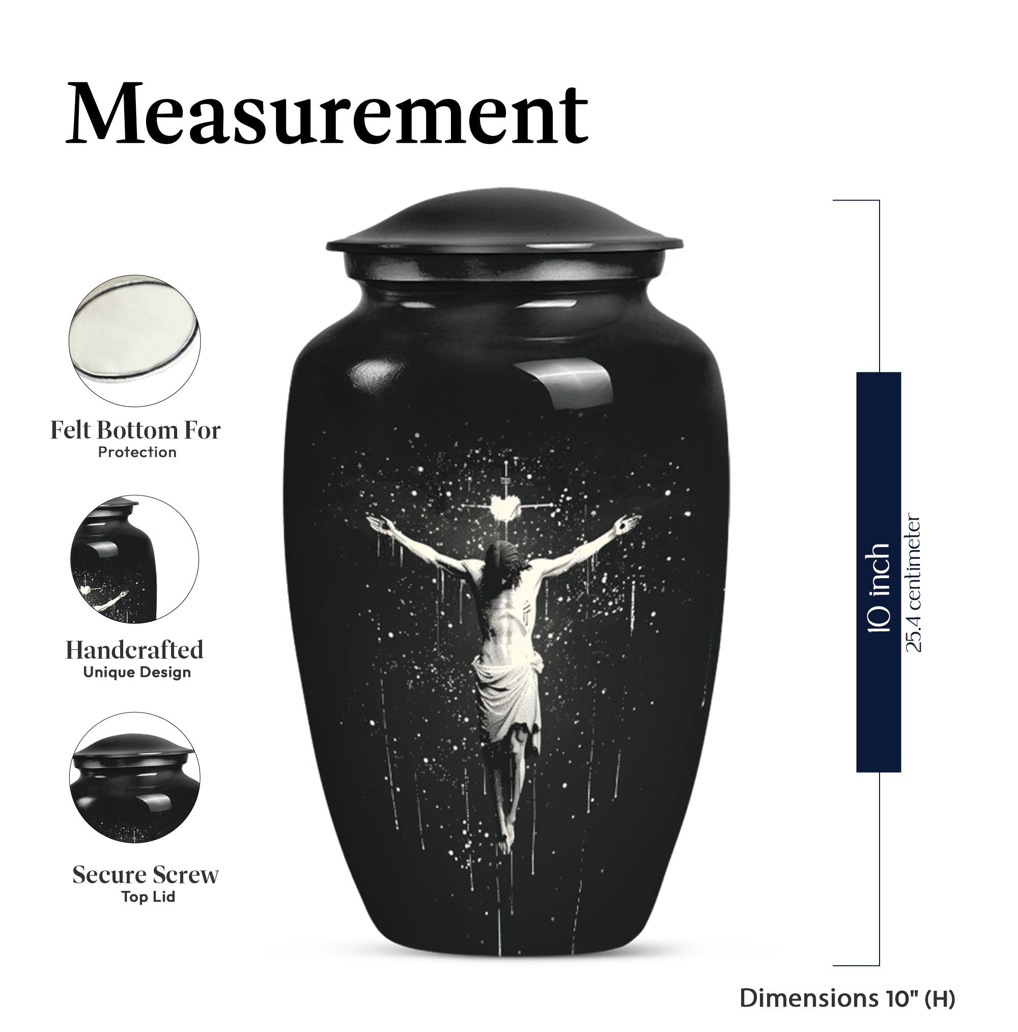 Revere the memory of a cherished person in an extraordinary and compelling way with our 10-inch classic cross urn, an exquisite part of our ceremonial supplies collection. Made from high-quality aluminium, this large urn weighs 3.3 pounds and has a generously spacious capacity of 200 cubic inches. It comes with a velvet pouch for securing the ashes, adding a touch of elegance and respect. This funeral urn for ashes for women or an adult male captures the essence of the past while promising solace for those left behind. With options to personalize through engraved names, this urn becomes a thoughtful and enduring testament to a lifetime of unforgettable memories. This memorial urn, embodying a gramophone theme, showcases a timeless tribute that can be passed down through generations. Whether you're finding burial urns or a box to hold precious stories, discover the unique alternative in our impressive, tastefully designed cross urn.