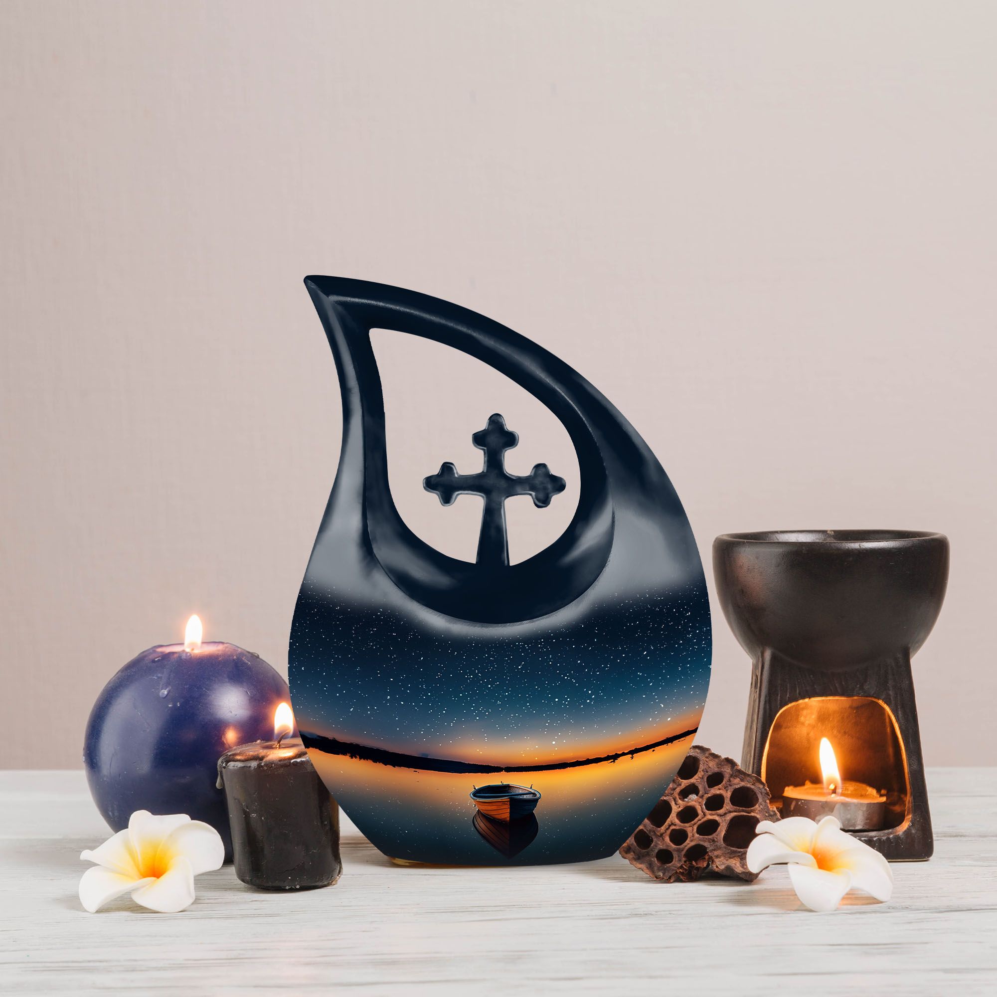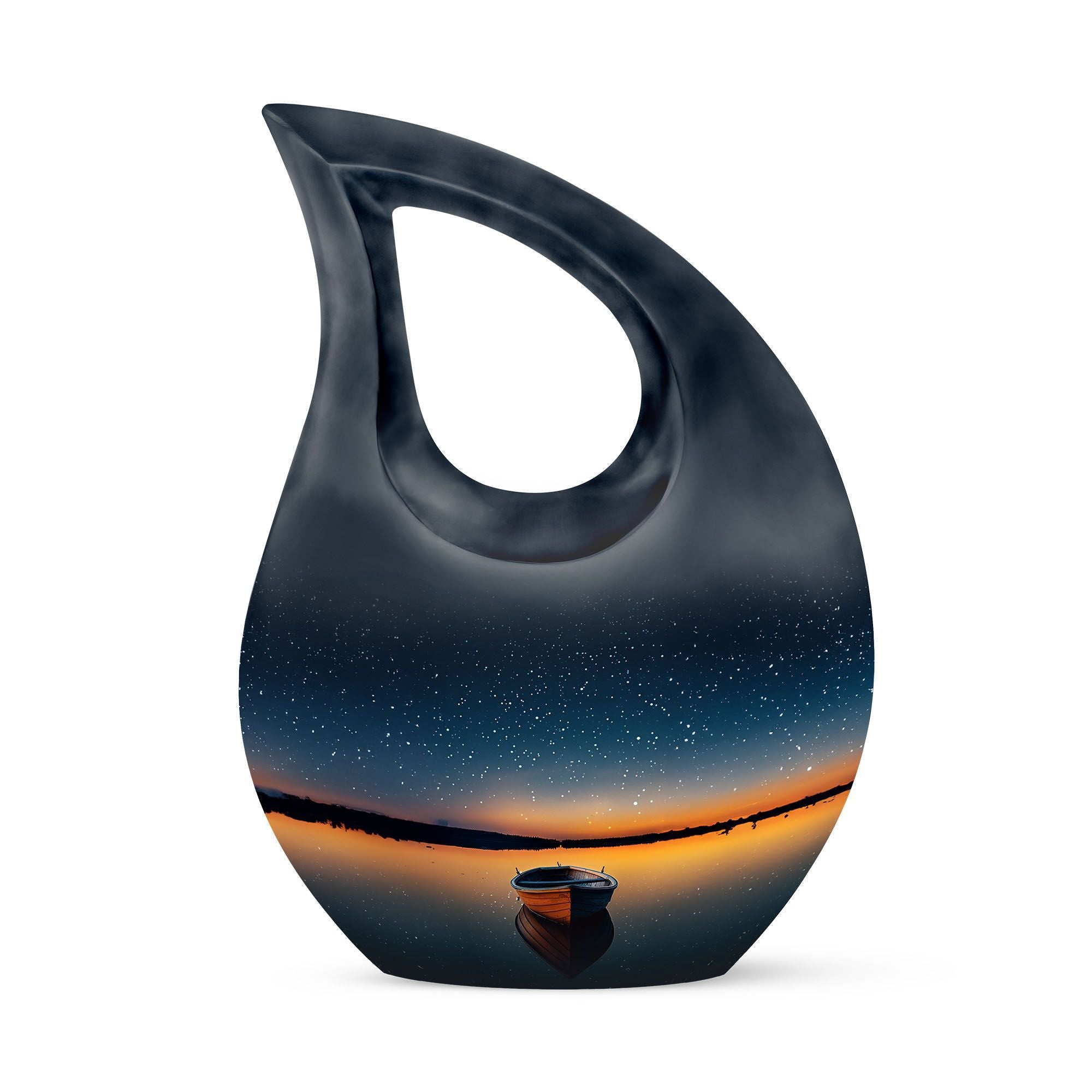 An honor fitting for a treasured loved one, our Boat Urn is a dignified and unique resting place. Crafted from robust aluminium, this piece bears the heartwarming theme of a boat, subtly infusing the symbol of journeying into the eternal serenity. With an imposing height of 10 inches, it's large enough to contain 200 cubic inches of ash, making it a perfect choice among the 'Large Urns' category. For added convenience, the package includes a velvet pouch for the containment of ashes. The Customized Urns For Ashes For Adults weighs only 3.3 pounds, enabling easy positioning or transporting. Increasing the urn's sentimental value, we offer an opportunity to personalize with engraved names. A blend of artistry and function, this Cross Drop Boat Urn encapsulates the spirit of memorial urns authentically and distinctively. It's not just an urn, but a cherished Cremation Monument for your loved one. Pay homage to the departed with our uniquely designed urns, a serene beacon of countless memories and heartfelt feelings.