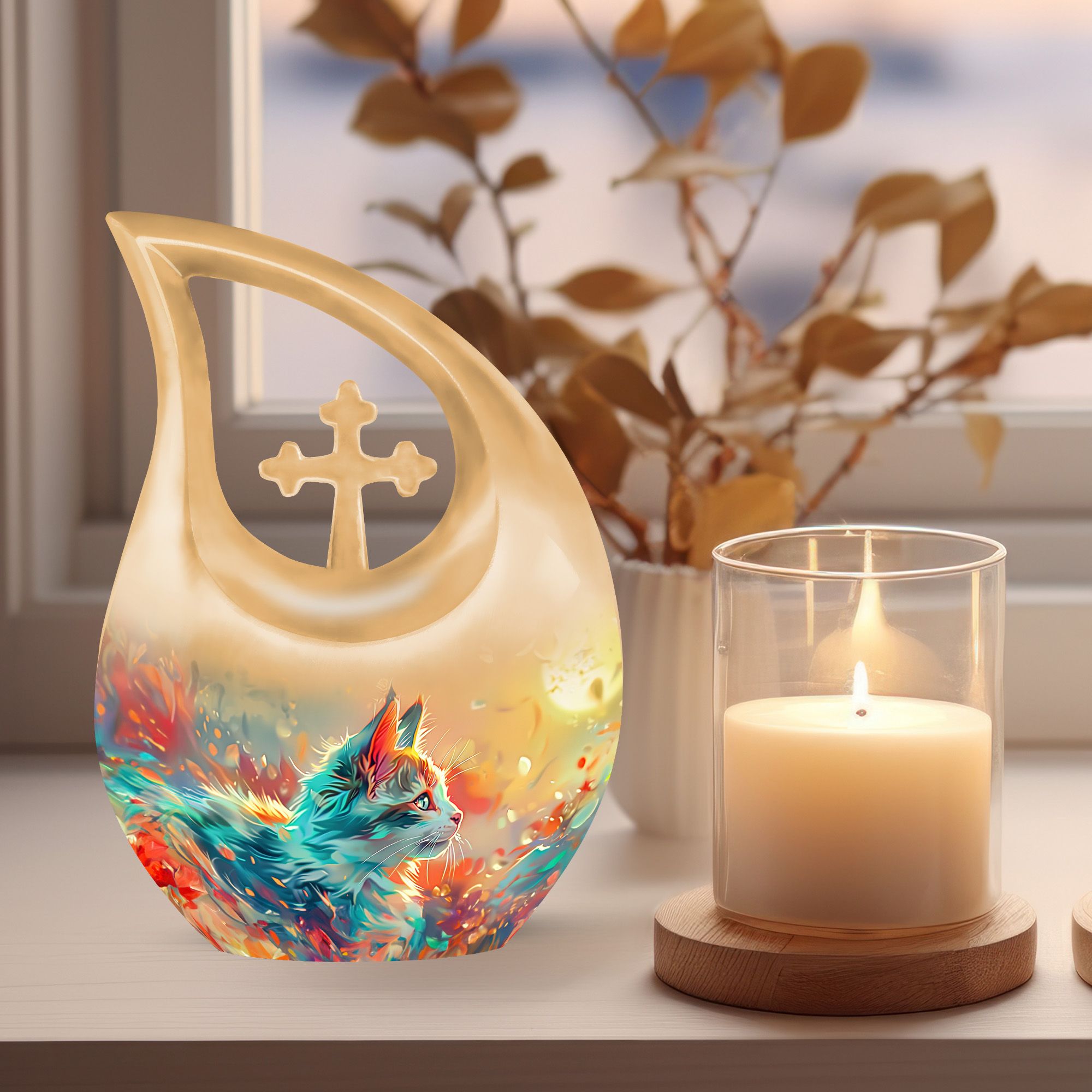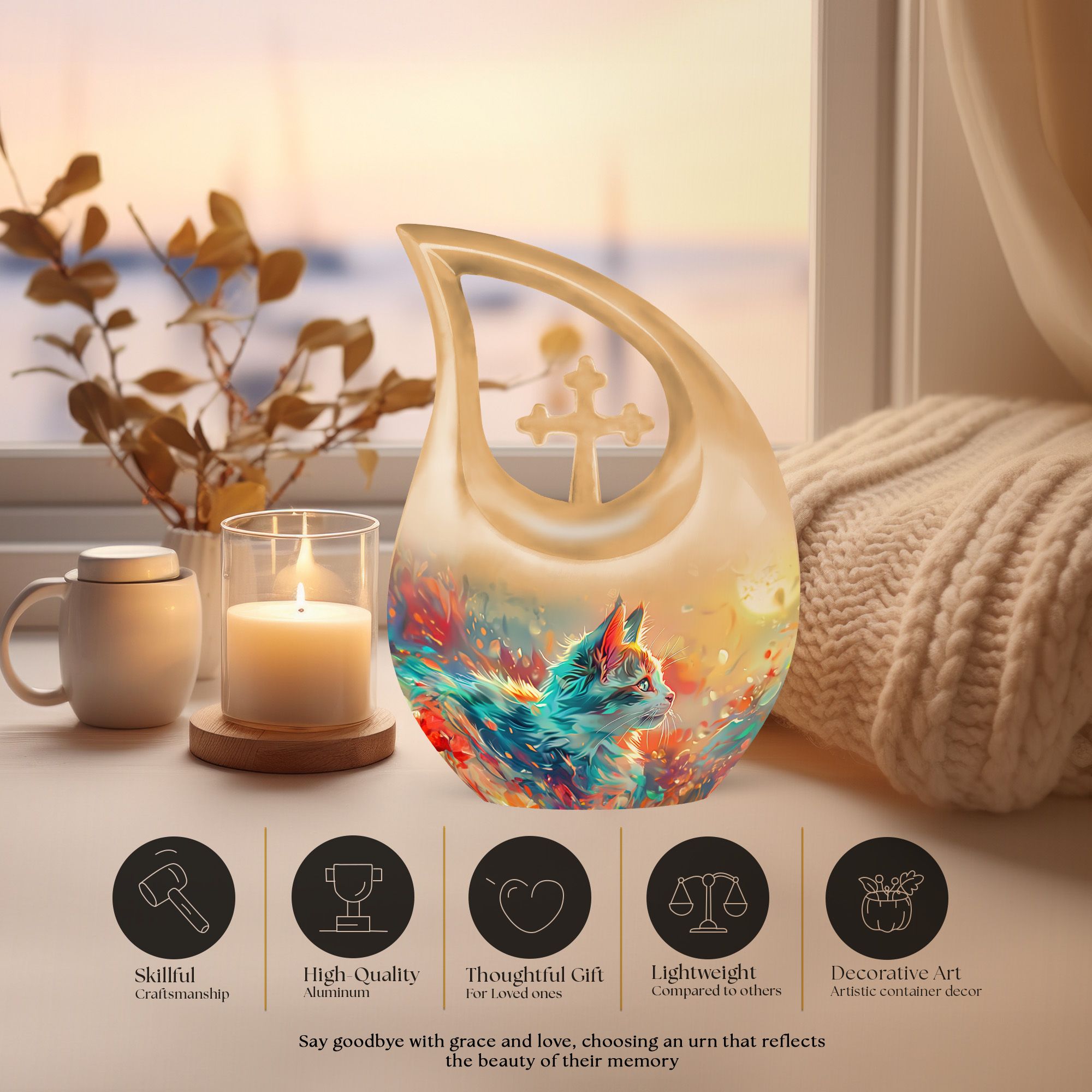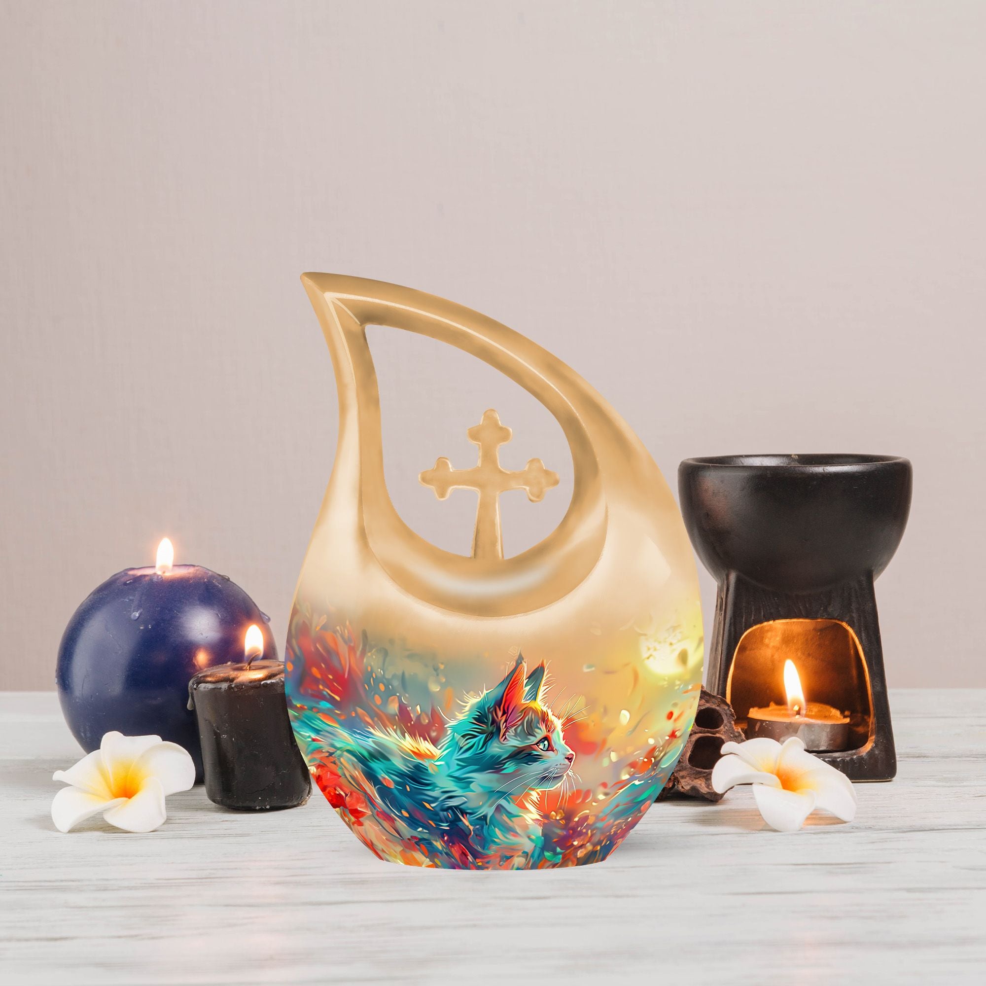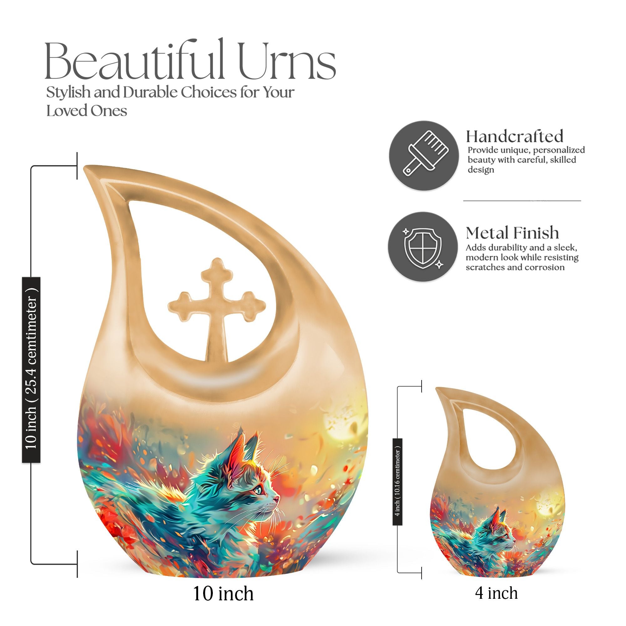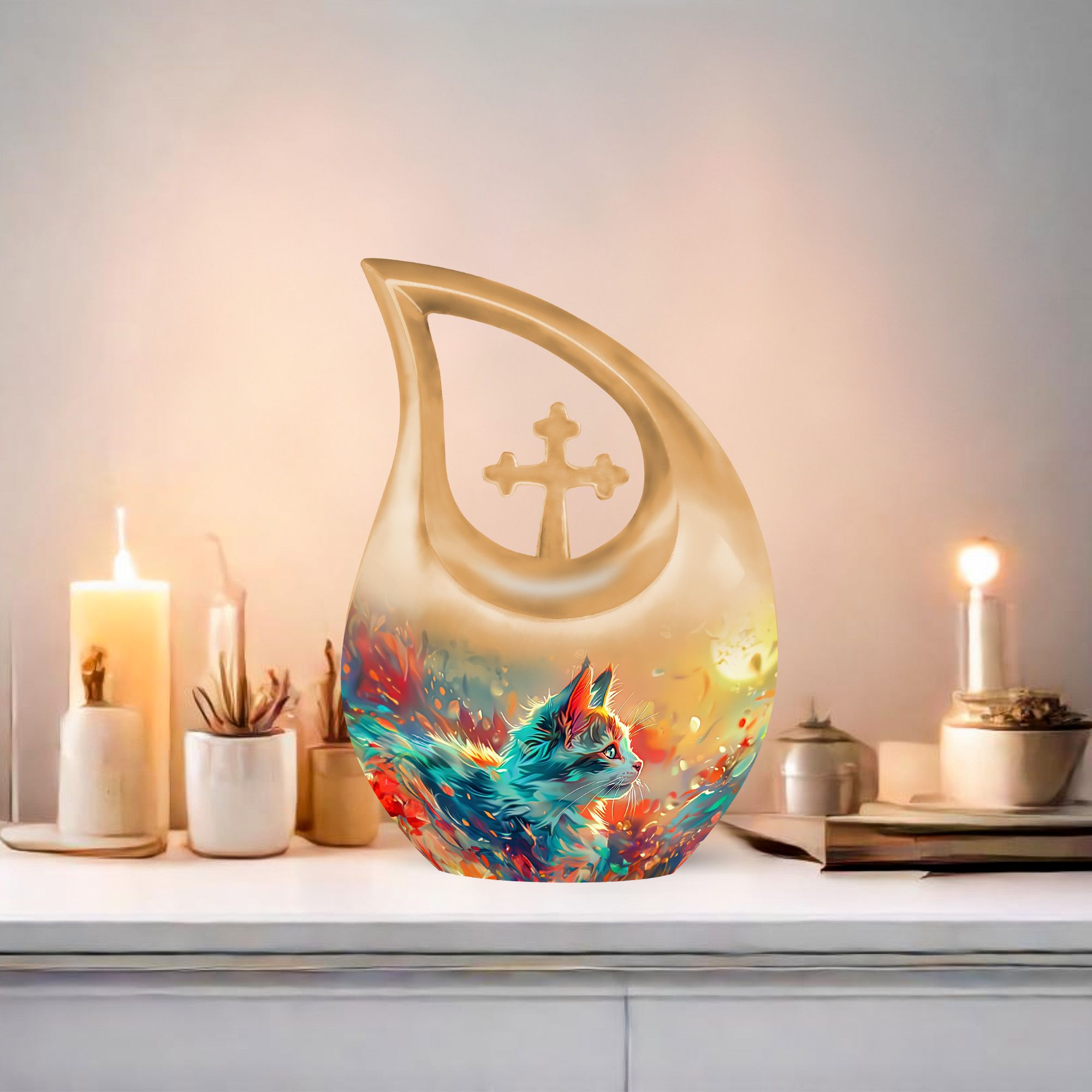 Commemorate your beloved feline's life with our meticulously crafted 10-inch cat urn. The cross drop detailing on our large urn, weighs a sturdy 3.3 pounds and stands 10 inches in height, providing an elegant tribute to your lost companion. Constructed from durable aluminium, this memorial urn for ashes has been designed to last, providing a long-lasting remembrance. The urn's generous capacity of 200 cubic inches ensures it can sufficiently accommodate the ashes of your cherished pet. To add a personal touch, we offer customization such as engraved names. Accompanying the urn is a velvet pouch, providing a dignified containment for your pet's ashes. This memorial urn seamlessly merges functionality and aesthetics, reflecting the significant place your pet holds in your heart. Search phrases such as 'Urns For Ashes', 'Custom Urns', 'Keepsake Urns', 'Custom Urns For Ashes' are recommended for anyone needing similar memorial urns.