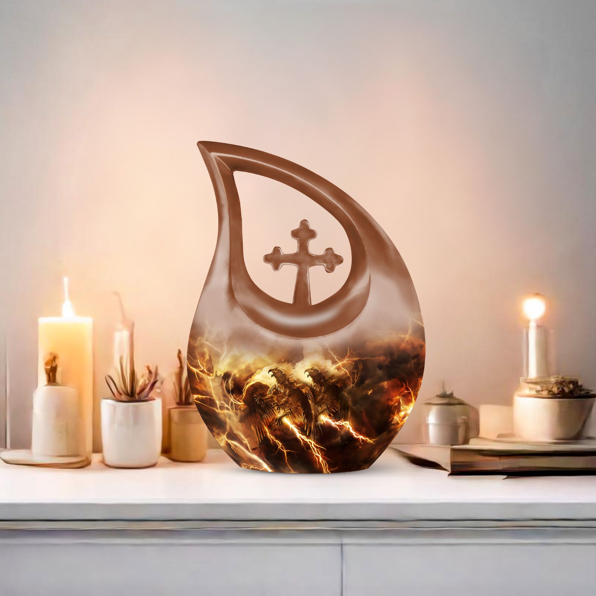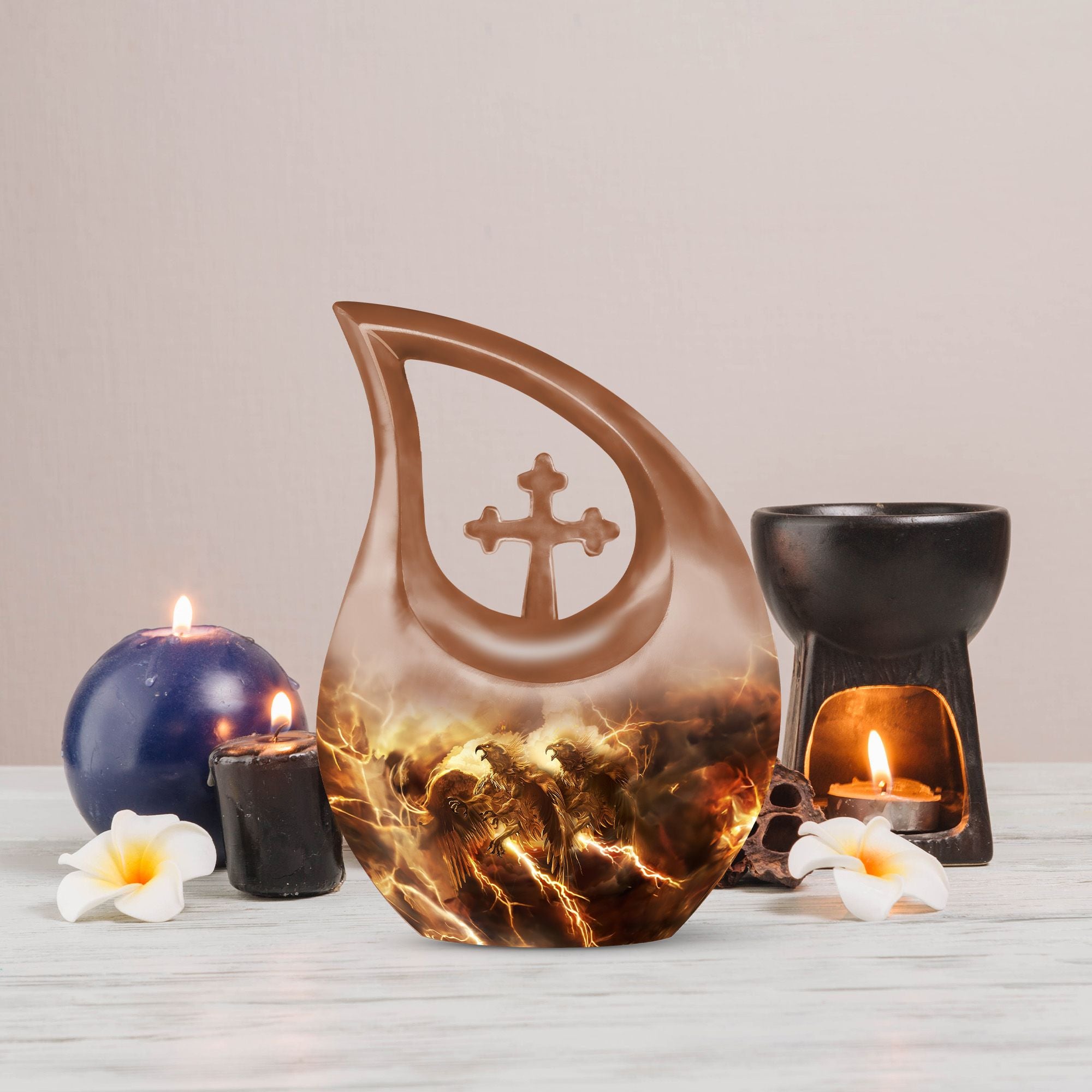 Explore your spiritual connection with our Catholic Cross Drop Urn, a definitive choice for individuals looking for catholic urns or large urns. Our exclusively crafted memorial urns, sized at 10 inches, allow you peace and tranquility as they honor your loved ones. Made from resilient aluminium, these urns ensure lasting durability. They exhibit a soothing theme with a Catholic Cross Drop that resonates with faith and hope. These urns are not just symbols of remembrance but also a testament of a spiritual journey. Our product package comes inclusive of a velvet pouch, an elegant containment for ashes. Moreover, the capacity stands at 200 cubic inches, sufficient to hold the ashes diligently. Weighing just 3.3 pounds, the urn is quite manageable. We also offer customization options to engrave names, making our keepsake cremation urns a personal treasure. So, whether you're in search of garden urns or personalized urns for human ashes, our product stands as an optimal choice.