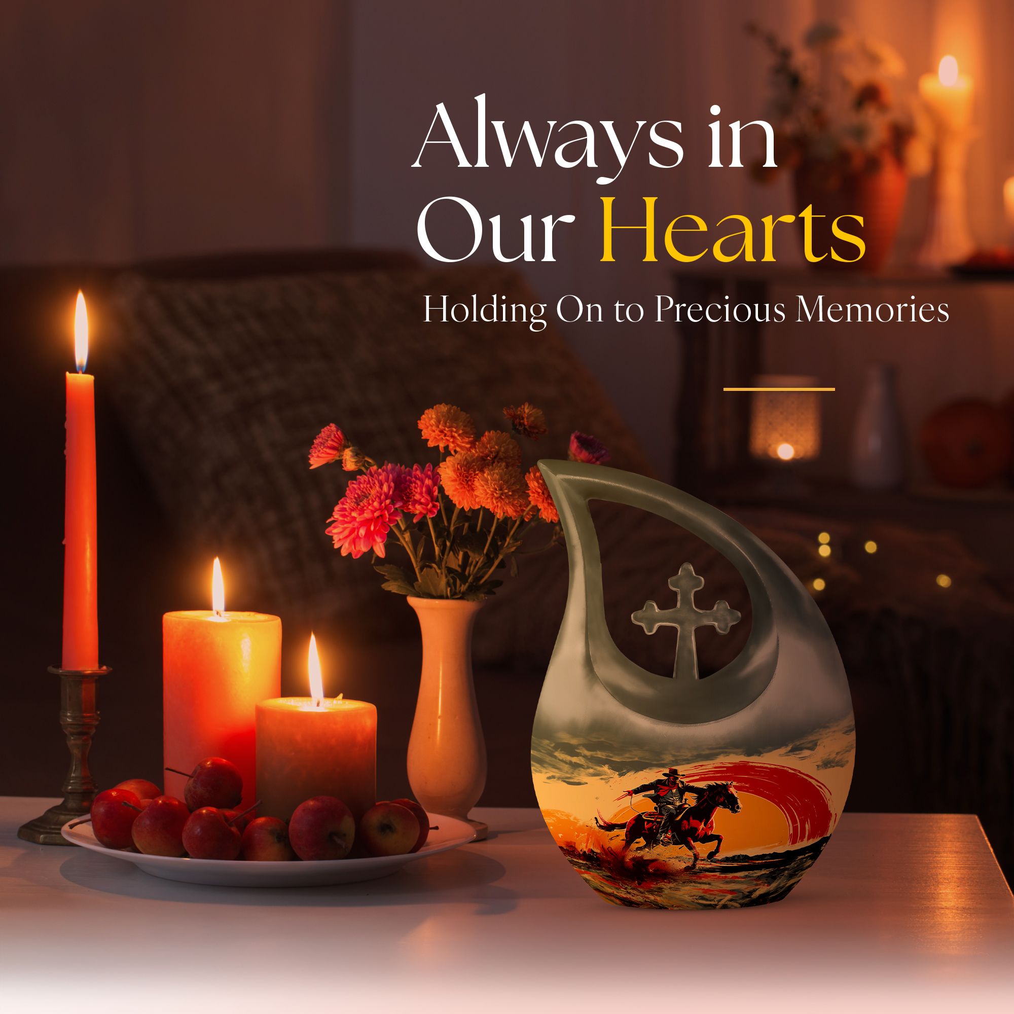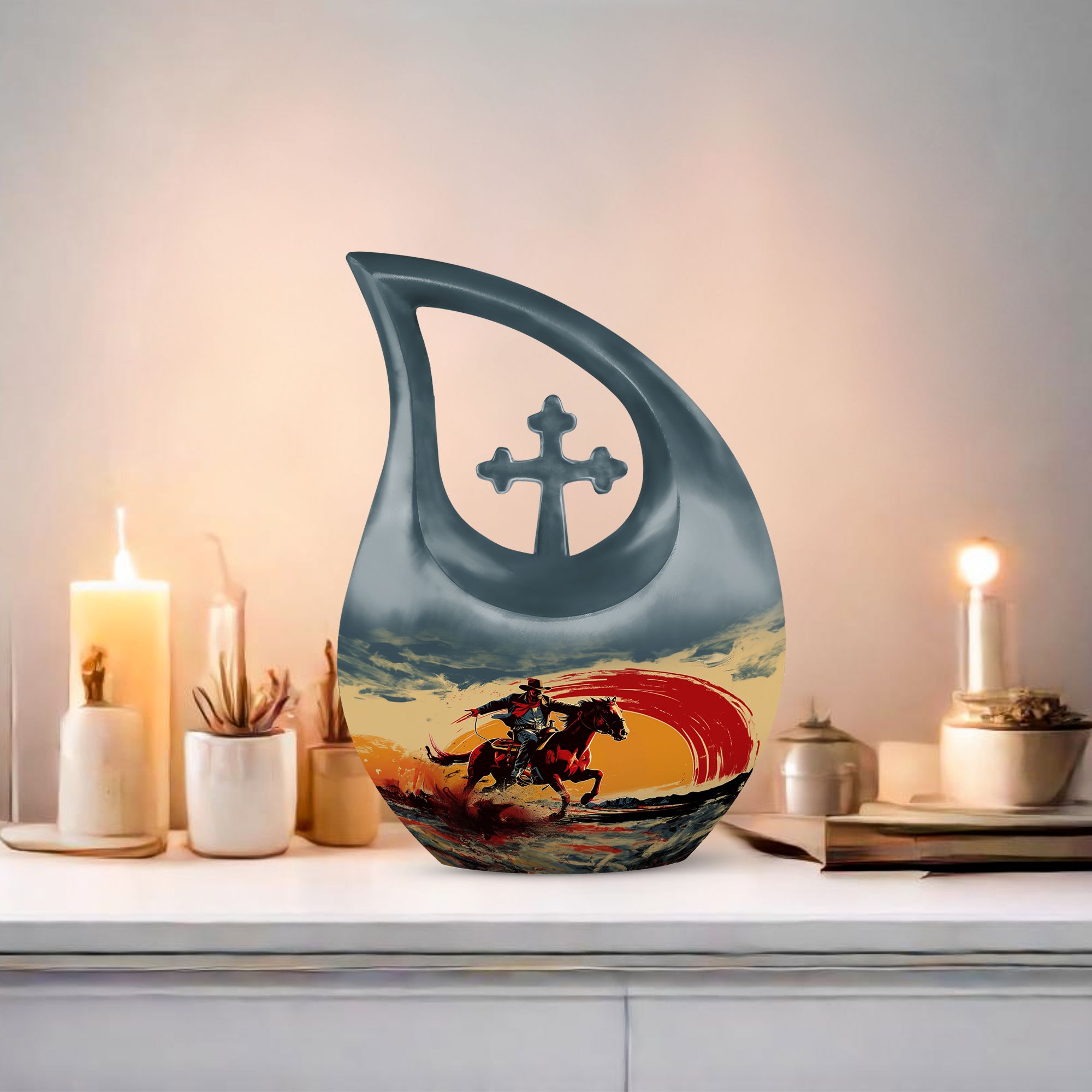 Encapsulate your treasured memories with our exquisitely crafted 'Cowboy Urn', a quintessential choice in our large urns' collection, purposefully designed for memorial ceremonies. Made from enduring aluminium, this urn exudes a sturdiness that is as perpetual as the memories it safeguards. Measuring 10 inches in height, it weighs 3.3 pounds and holds a capacity of 200 cubic inches - giving ample space while maintaining a compact form. It effectively serves as an expansive repository for cremation ashes, which can be easily contained in a plush velvet pouch included in the package for added security and style. Break away from the mundane with our 'Cross Drop' urn design, a symbol of belief and solace, invoking spiritual comfort at the times when you need it the most. For an extra touch of sentiment, utilize our customization option to engrave the names of your loved ones, personalizing your urn and providing a unique tribute. Embark on a journey of remembrance with our cowboy-themed urn, a perfect way to memorialize your loved ones' unique stories. Whether your search includes burial urns, urns for ashes,or urns for human ashes, our affordable urns are an excellent choice, blending superior quality with emotional significance.