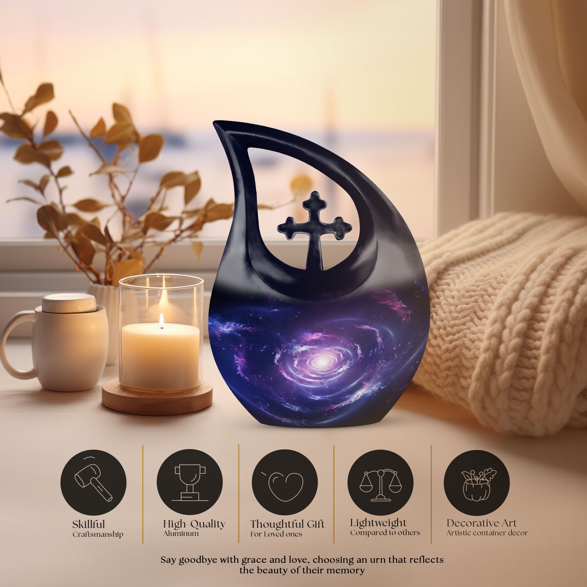 Immerse in the infinite universe of remembrance with our captivating Galaxy Urn. Thoughtfully constructed, this affordable cremation and burial urn offers a profound way to honor your cherished ones. Sized at a substantial 10 inches, the urn showcases a weight of 3.3 pounds and can encapsulate up to 200 cubic inches of cherished remnants, allowing ample room for treasured remembrances. The Cross Drop design on the Aluminium build elevates its ethereal 'Galaxy' theme. In addition, the urn comes with a plush velvet pouch for the discrete containment of ashes. Further add sentiment by personalizing it with engraved names. This is more than a mere keepsake for ashes; it's a certified, biodegradable vessel of endearing memories. Whether you're browsing for large urns or seeking memorial urns that reflect profound respect and love, this urn is a dignified selection.