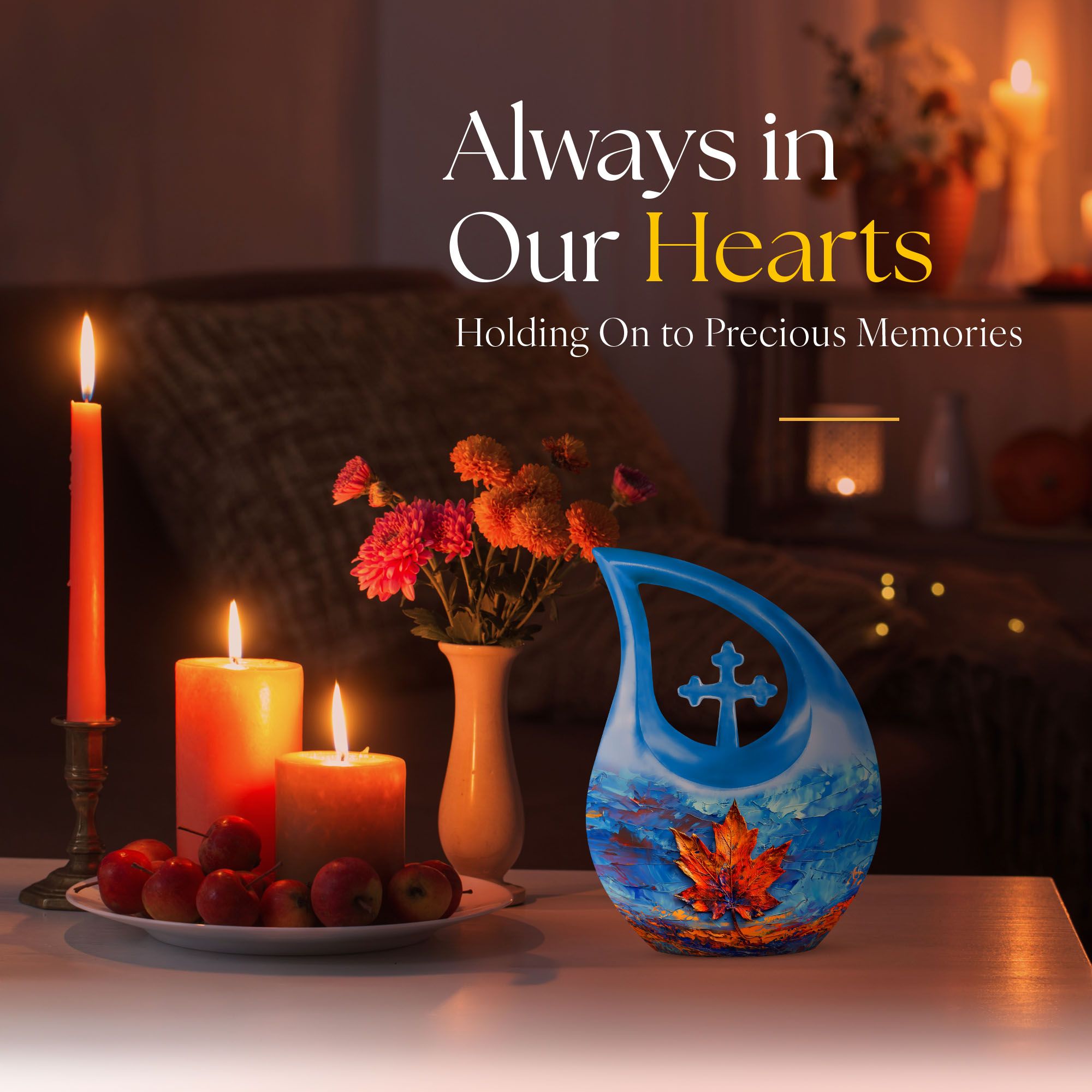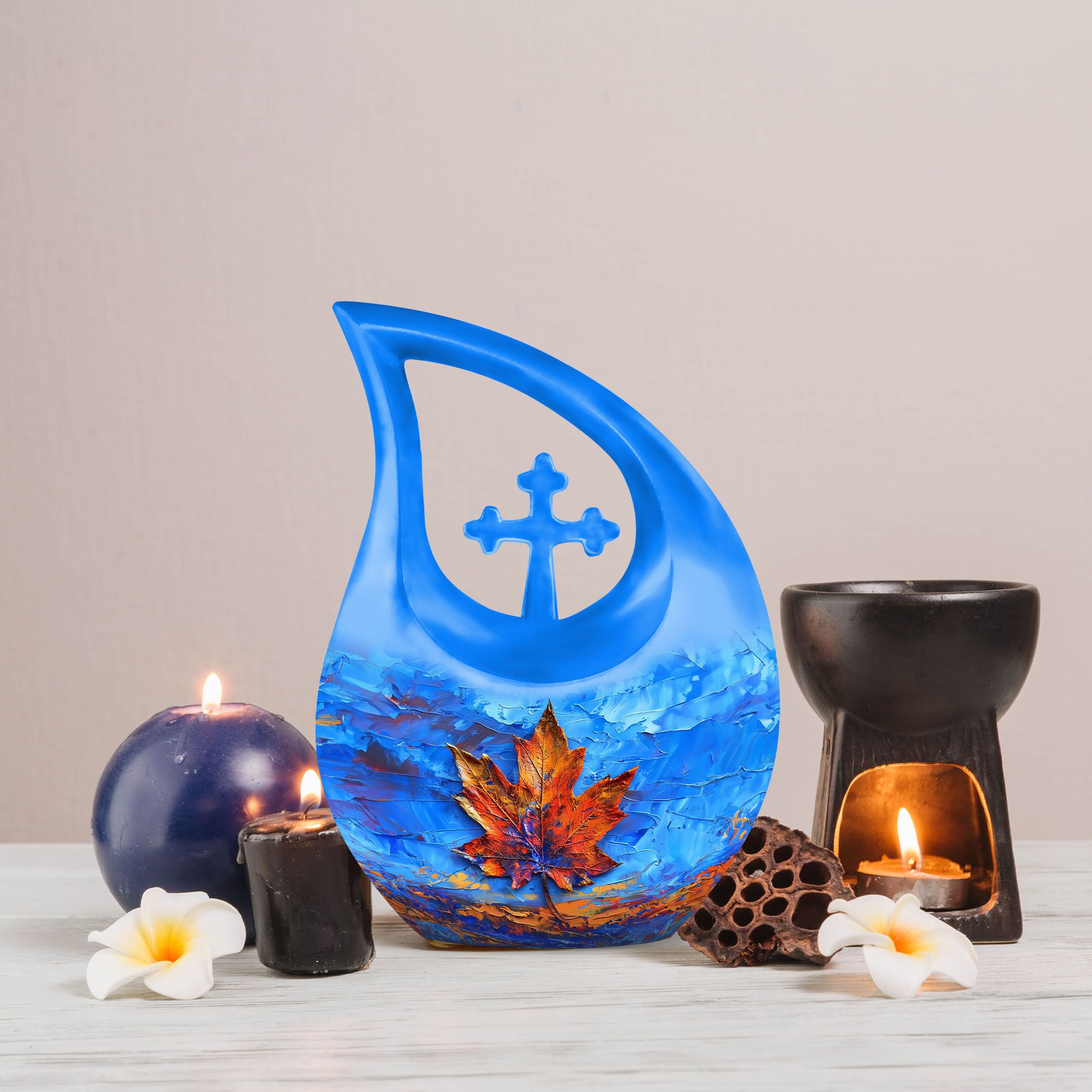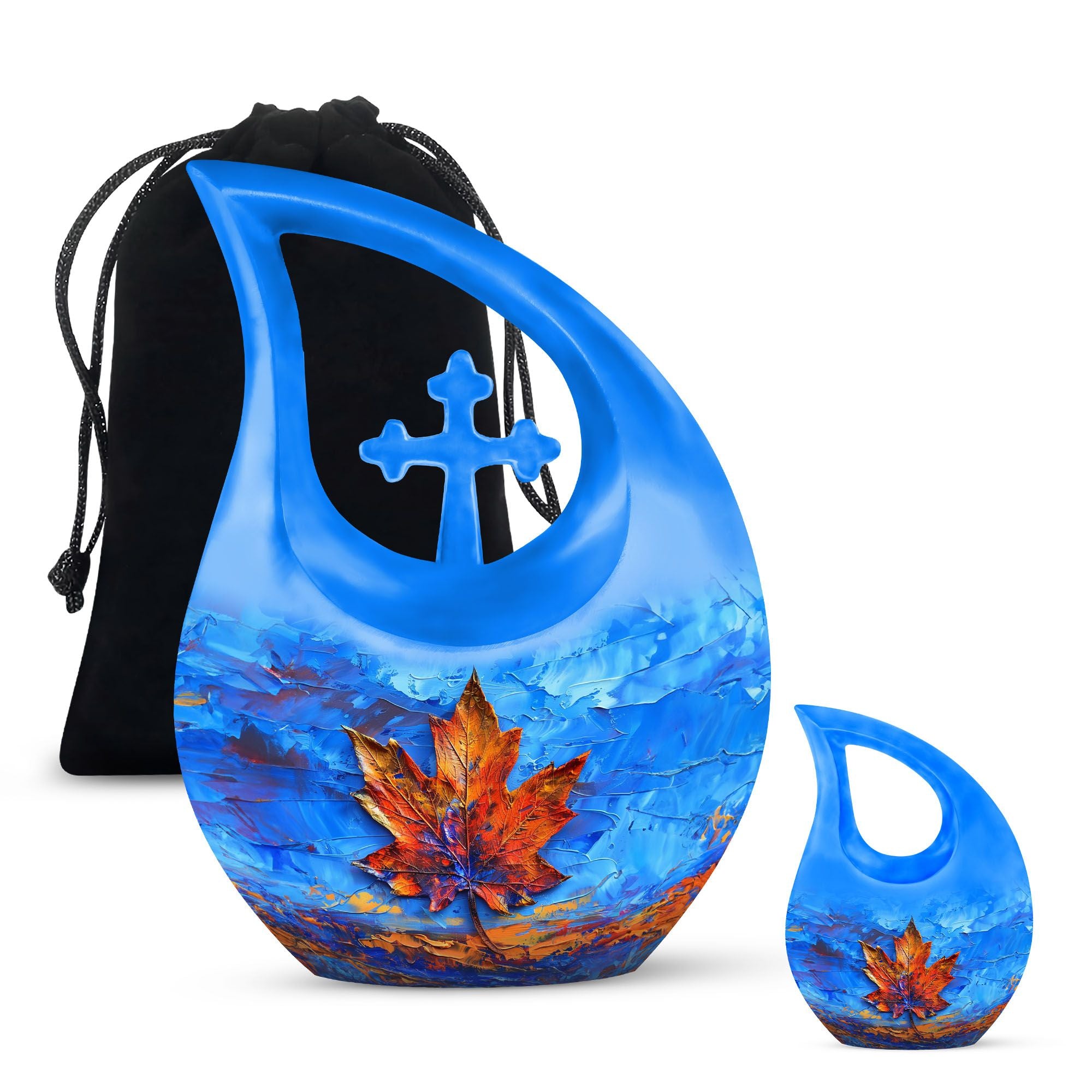 Preserve the memory of your loved one in a dignified way with our elegantly designed Mapple Leaf Urn. This large-sized urn, crafted from enduring aluminium, sports the symbolic cross drop model on a mapple leaf theme. It stands majestically tall at 10 inches and has a set weight of 3.3 pounds. Intelligently shaped, it comfortably accommodates upto 200 cubic inches of ashes. Equipping this memorial urn with your personal touch, it permits customization with engraved names, converting it into a heartfelt monument. The package furnishes a classy velvet pouch for the containment of ashes, further enhancing its value. Whether you're seeking personalized urns for adults or medium urns for human ashes, this Mapple Leaf Urn unites sumptuousness and sentiment, perfect to pay tribute to a cherished life. Note: This product comfortably fits into most common garden urn spaces, making it versatile for both indoor and outdoor commemorations.