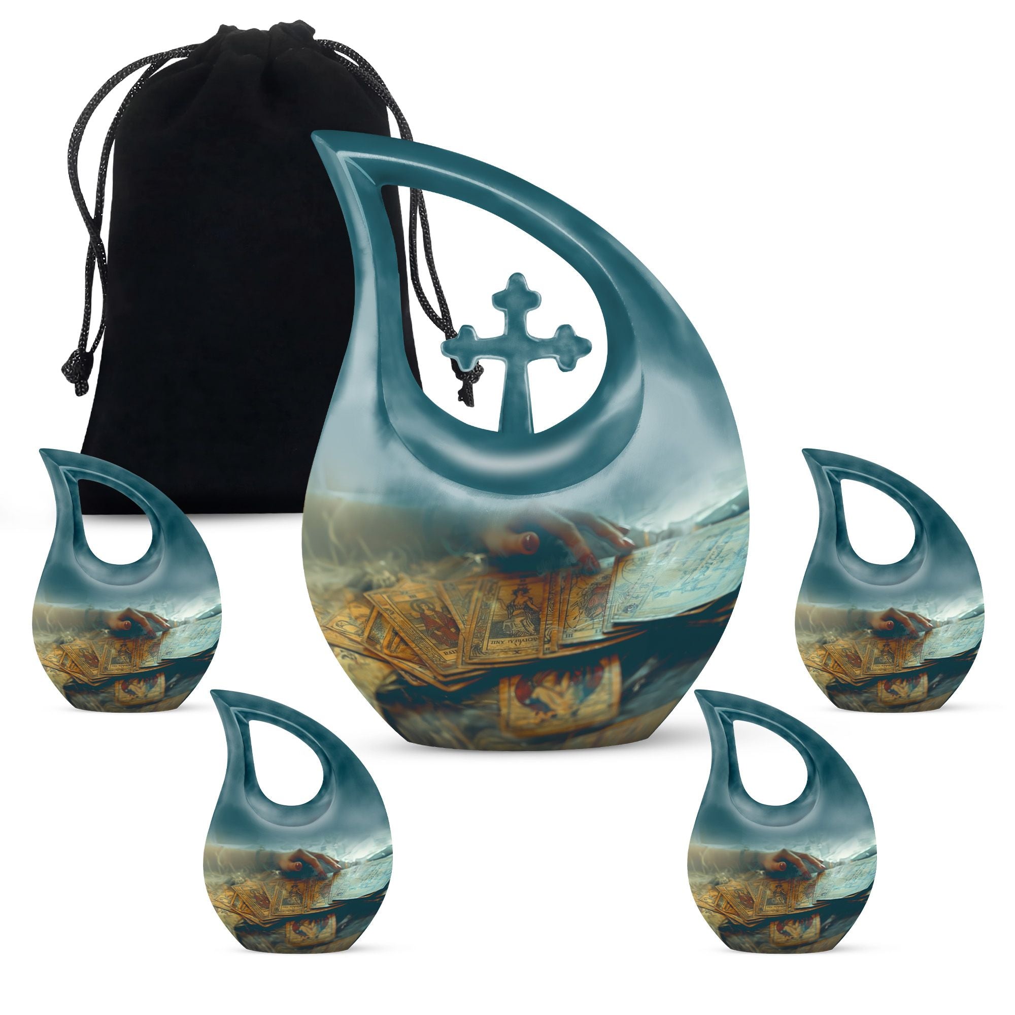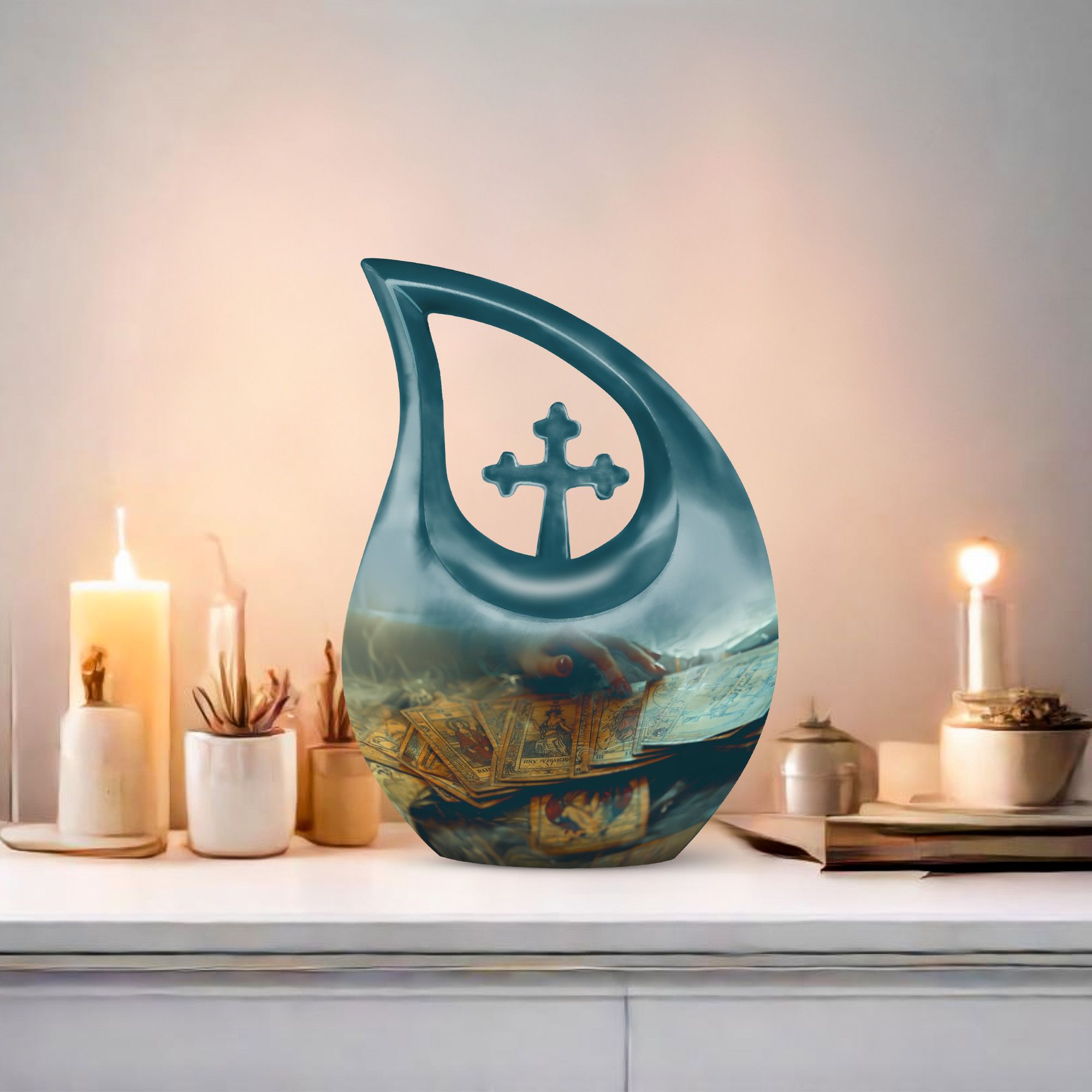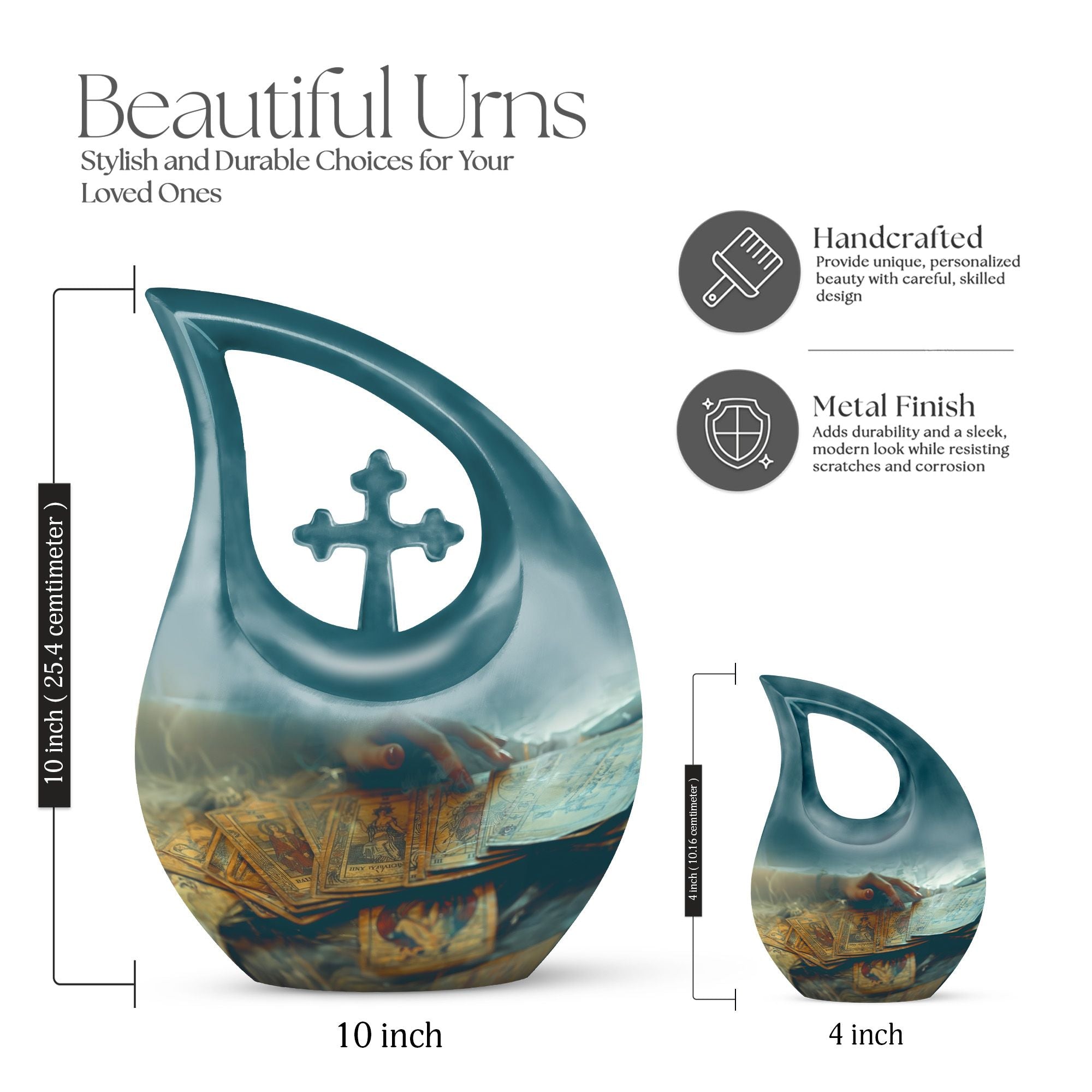 Exude tranquility and serenity with this Tarot urn, a perfect choice for memorial urns. Crafted from durable aluminium, this 10-inch large urn weighing 3.3 pounds, boasts a unique Cross Drop design that adds a spiritual undertone to its appearance. It has a capacity of 200 cubic inches, ample enough to secure the ashes of your loved ones. Customization is a beautiful touch that we offer. Personalize your Tarot Urn by engraving the names as a timeless tribute to the departed soul. This purchase also includes a soft velvet pouch for tasteful containment of the ashes, adding to the respectful handling of the said remains. Whether you're searching for 'Best Cremation Urn,' 'Companion Urns For 2 Adults,' or 'Burial Urns For Sale,' this Tarot Urn ticks all boxes, offering a tasteful blend of modern aesthetics and tradition.