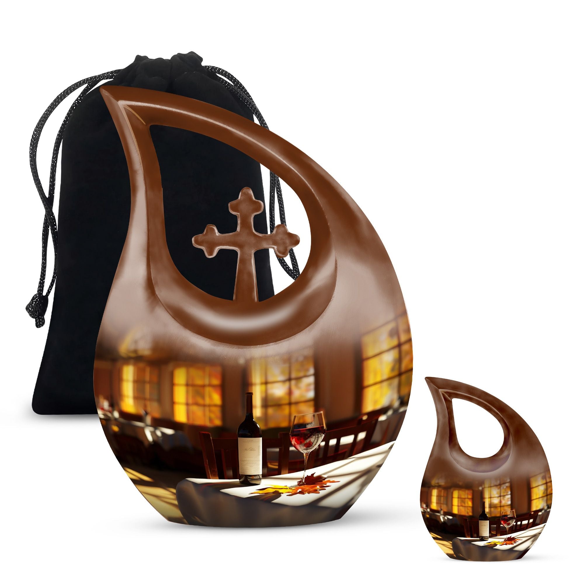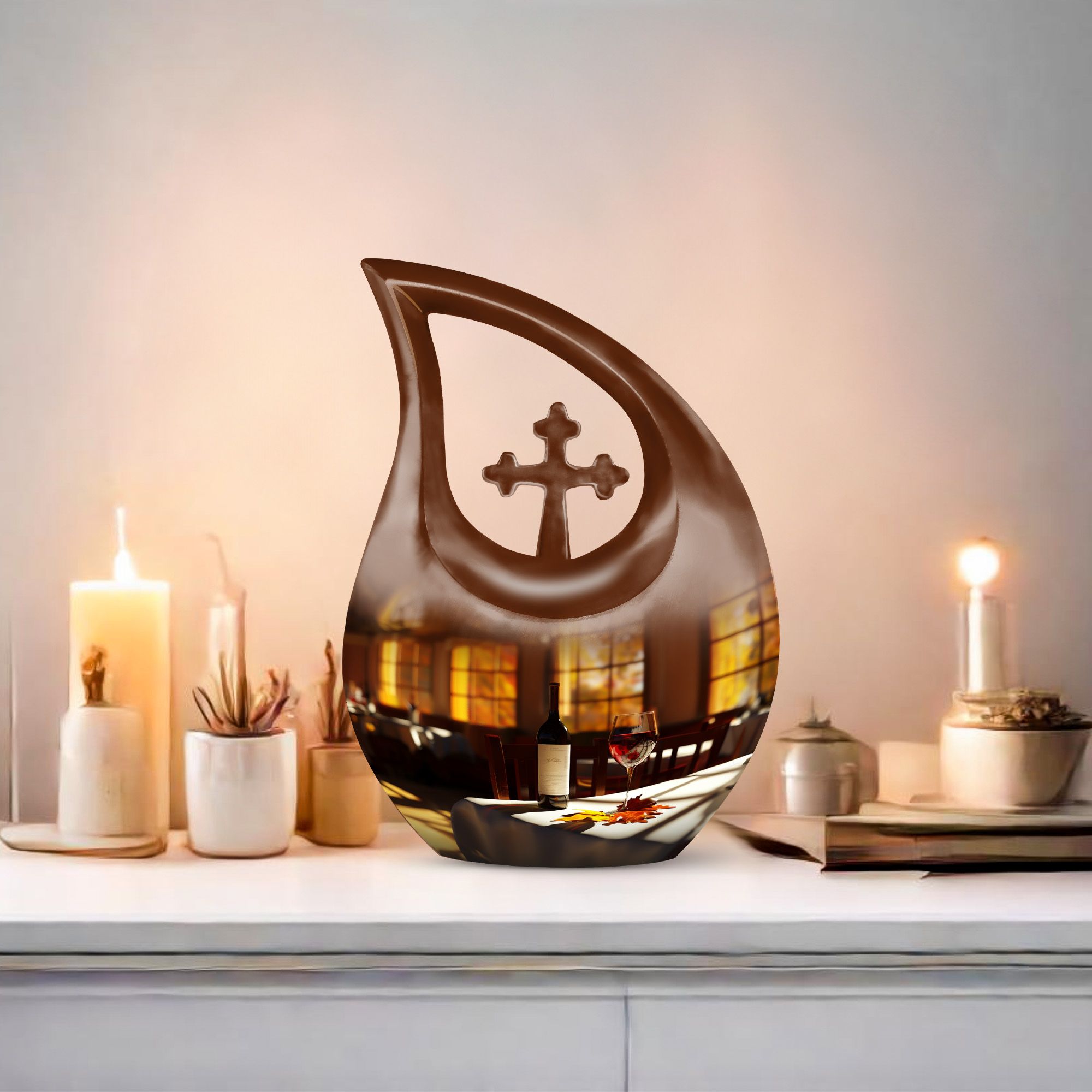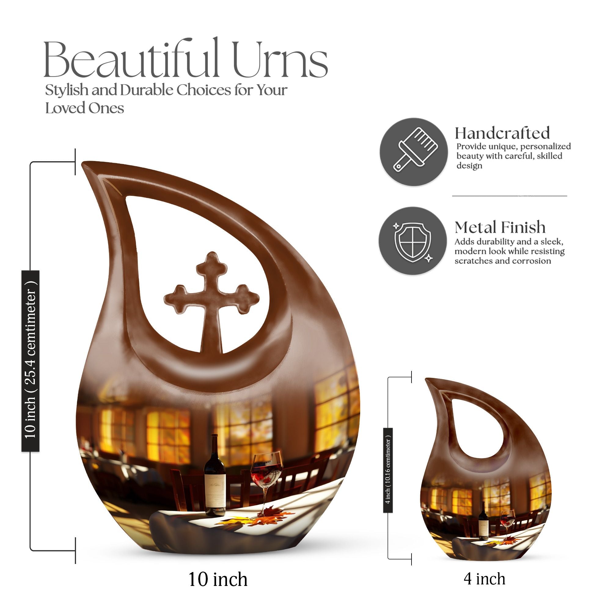 Experience a renewed sense of comfort and peace with our premium, 10-inch 'Cross Drop' Wine Urn. Crafted meticulously with high-quality aluminium, this large urn weighs a modest 3.3 pounds, ensuring stability and durability. It exhibits a capacity of 200 cubic inches to safely hold the ashes of your loved ones. Dressed in a rich wine theme, this urn transcends conventional designs with its unique 'Cross Drop' pattern. Each purchase includes an elegant velvet pouch intended to contain the ashes discreetly. Catering to your individual needs, this affordable cremation urn allows personalization - you can engrave names to imbibe a touch of love and personal touch. Whether you're looking for funeral urns for sale or small urns for ashes, this piece serves as a fitting homage to departed souls. Purchase it today, as memorial urns and cheap funeral urns of such high-grade material and artistry are rare to find.