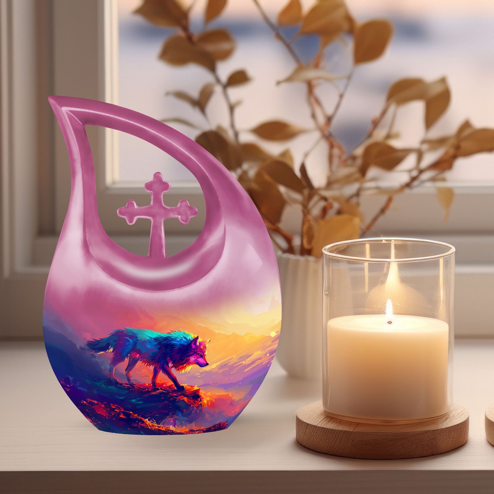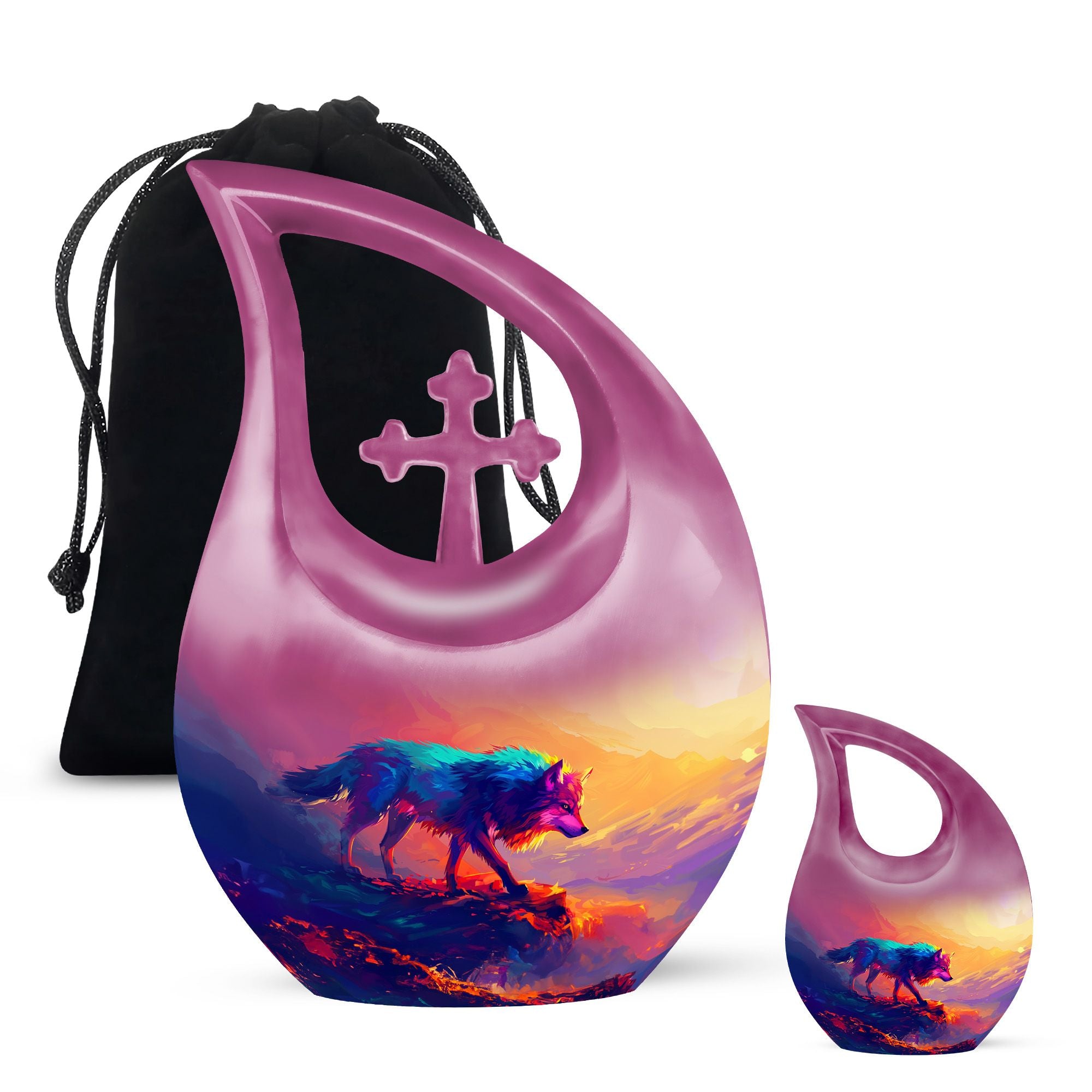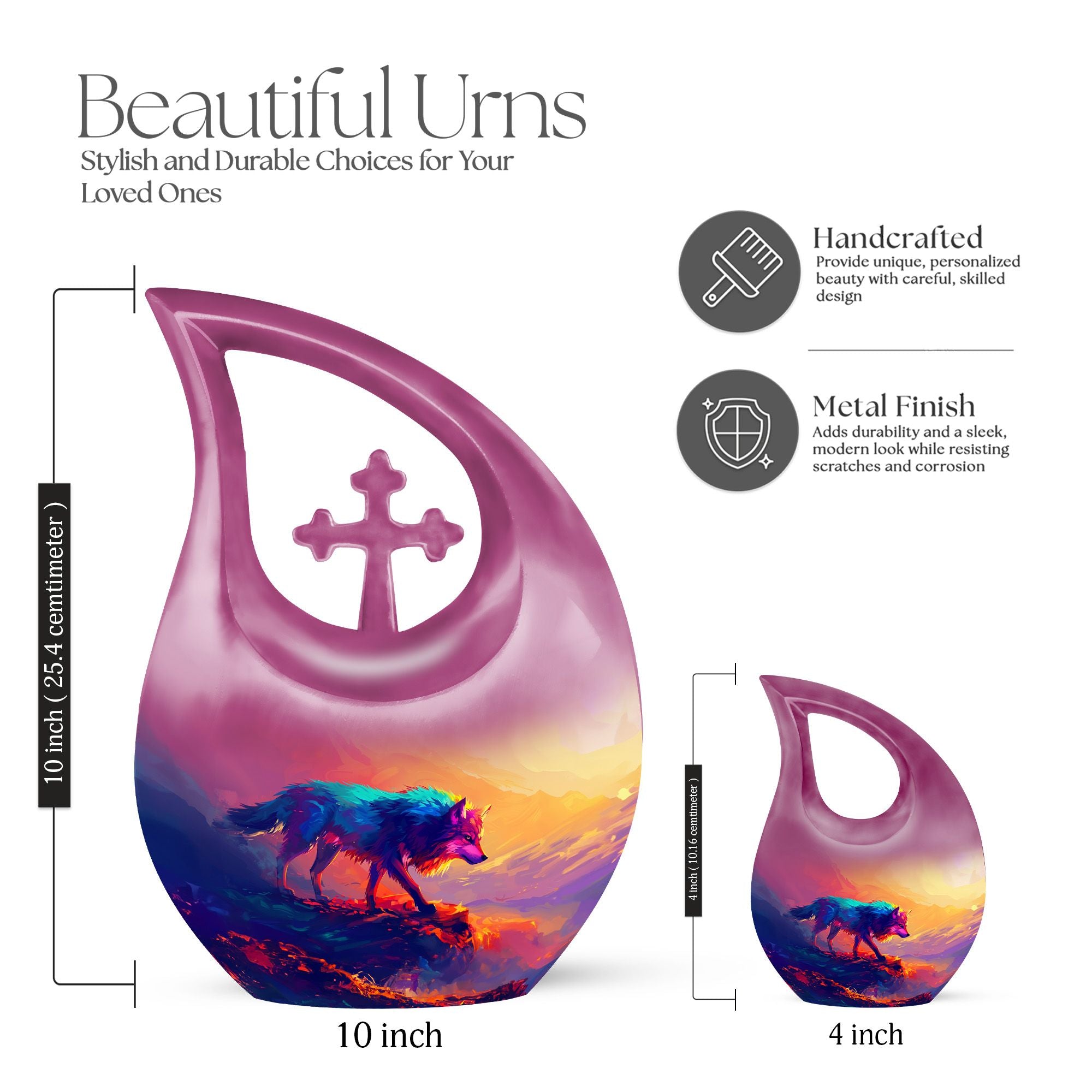 Cherish the memory of your departed loved one with our distinguished Wolf Urn. This notable 10-inch tall memorial urn is a perfect tribute, uniquely blending the Sacred Cross Drop design with a striking Wolf theme. Made from robust and time-resistant aluminium, it weighs a considerate 3.3 pounds, making it not too heavy but sturdy enough to protect its precious contents. With a 200 cubic-inch capacity, this urn provides ample space to securely hold the ashes. Furthermore, we offer you an additional velvet pouch for an extra layer of embracement to the ashes. One specialty of our Wolf Urn lies in its personalization; you can get the names of your loved ones professionally engraved on it, making the urn less of a product and more of a precious keepsake. Versatile and seemingly timeless, these affordable urns remain unaffected both in a garden setting or indoors. They also serve as captivating cremation boxes to display in your home. Our Wolf urn constitutes tasteful respect to your cherished memories, reflecting your affection for your loved ones, thereby, allowing their legacy to thrive.