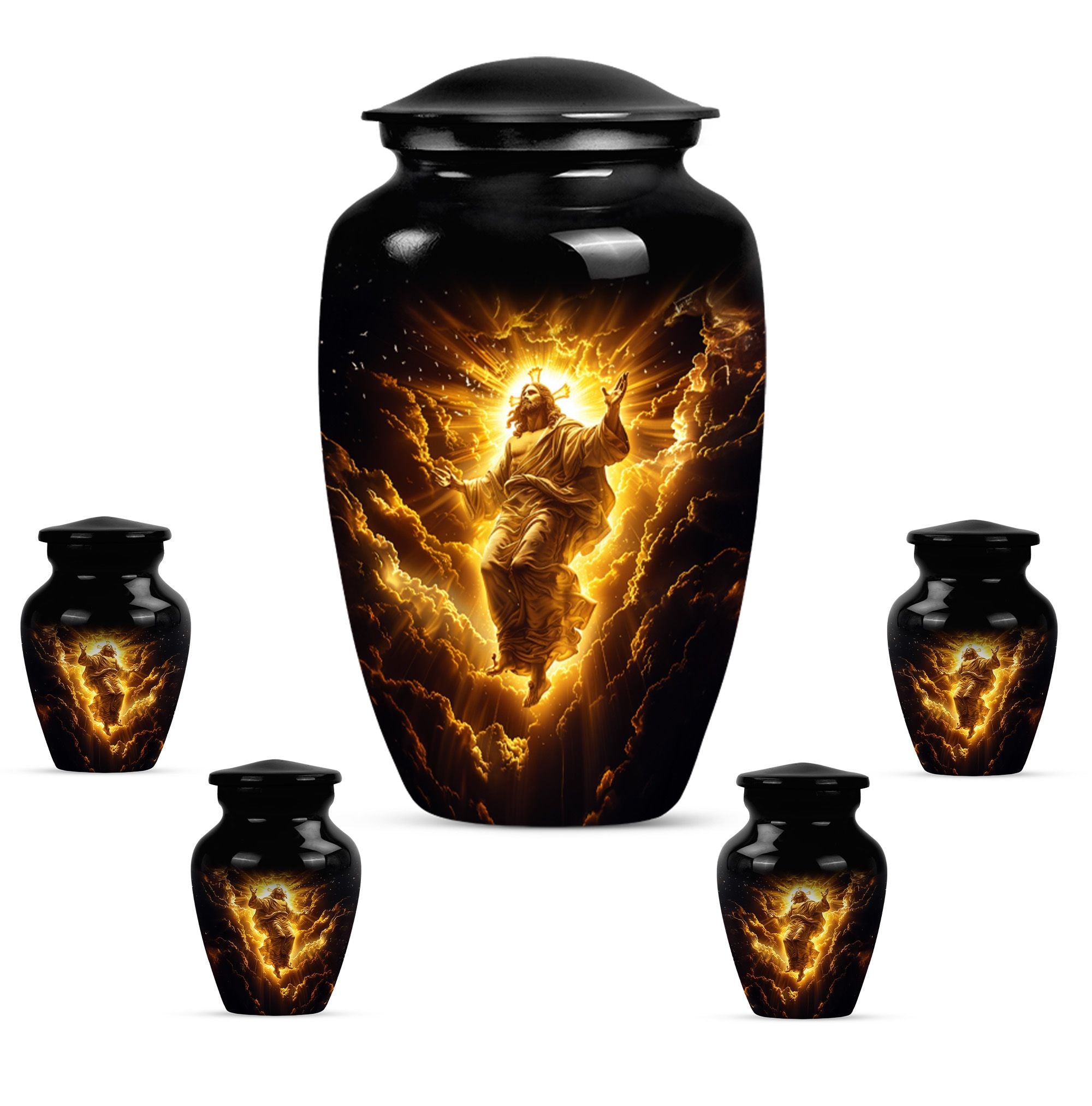 Honor the memory of your loved one with our distinguished Cross Urn, a perfect sanctuary for ashes exuding both respect and reverence. Crafted from robust aluminium, this large urn boasts of a captivating 10-inch size, weighing a substantial 3.3 pounds that reflects its quality. The grandeur of the urn further carries through its 200 cubic inches capacity, ample enough to enshrine the memorials of your cherished one. What differentiates this cremation urn is its unique theme: the gramophone, a symbol of timeless elegance and a reminiscent of comforting melodies. It comes along with a velvet pouch, promoting careful containment and respectful handling of the ashes. Add a touch of personal sentiment with our customization feature and engrave the names of your beloved. When it comes to memorial urns for ashes or funeral metal urns for burial, our Cross Urn stands apart in terms of its presence and purpose. Commemorate their unforgettable legacy with this urn for ashes, a symbol of your love steeped in respect and remembrance.