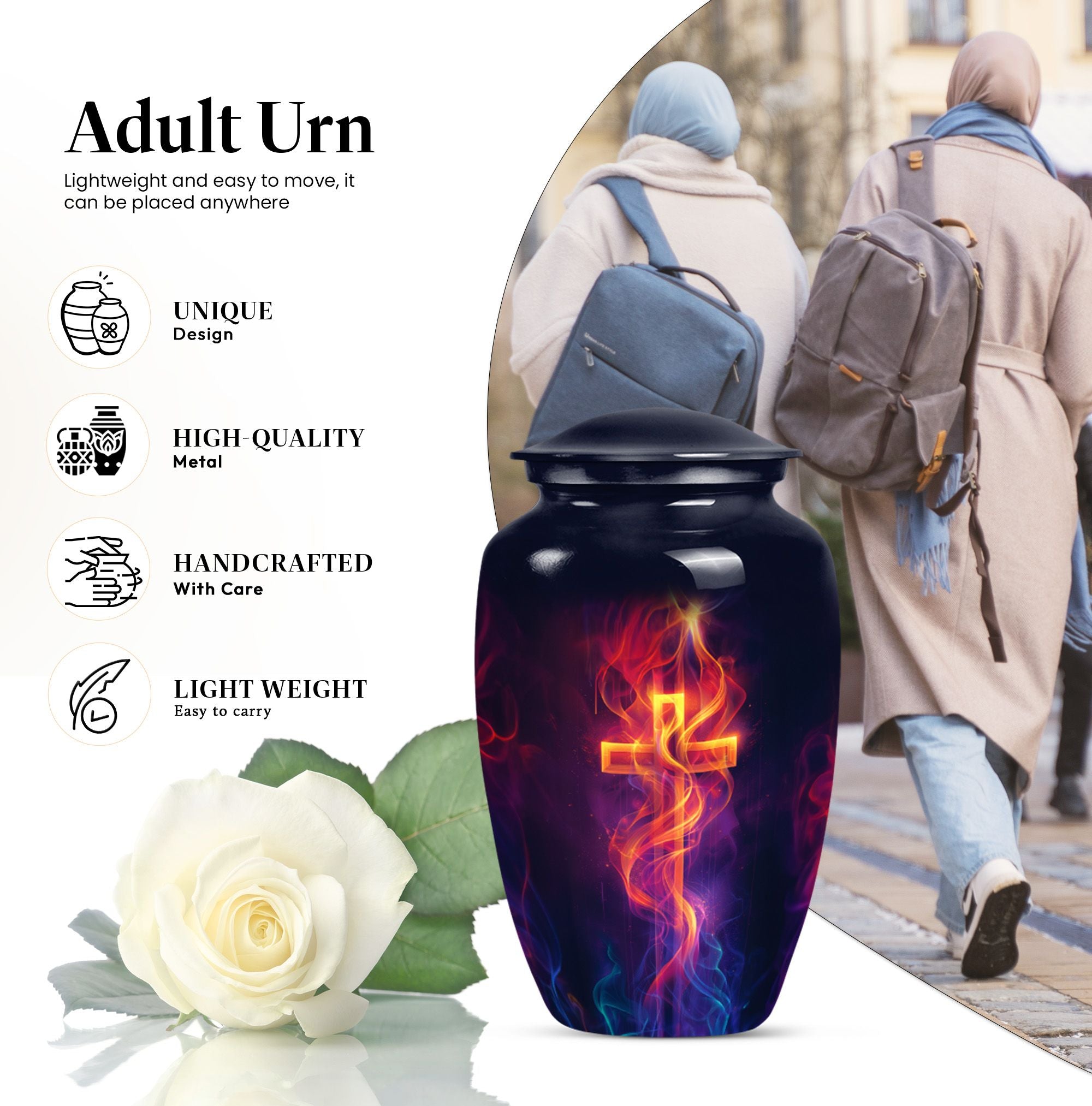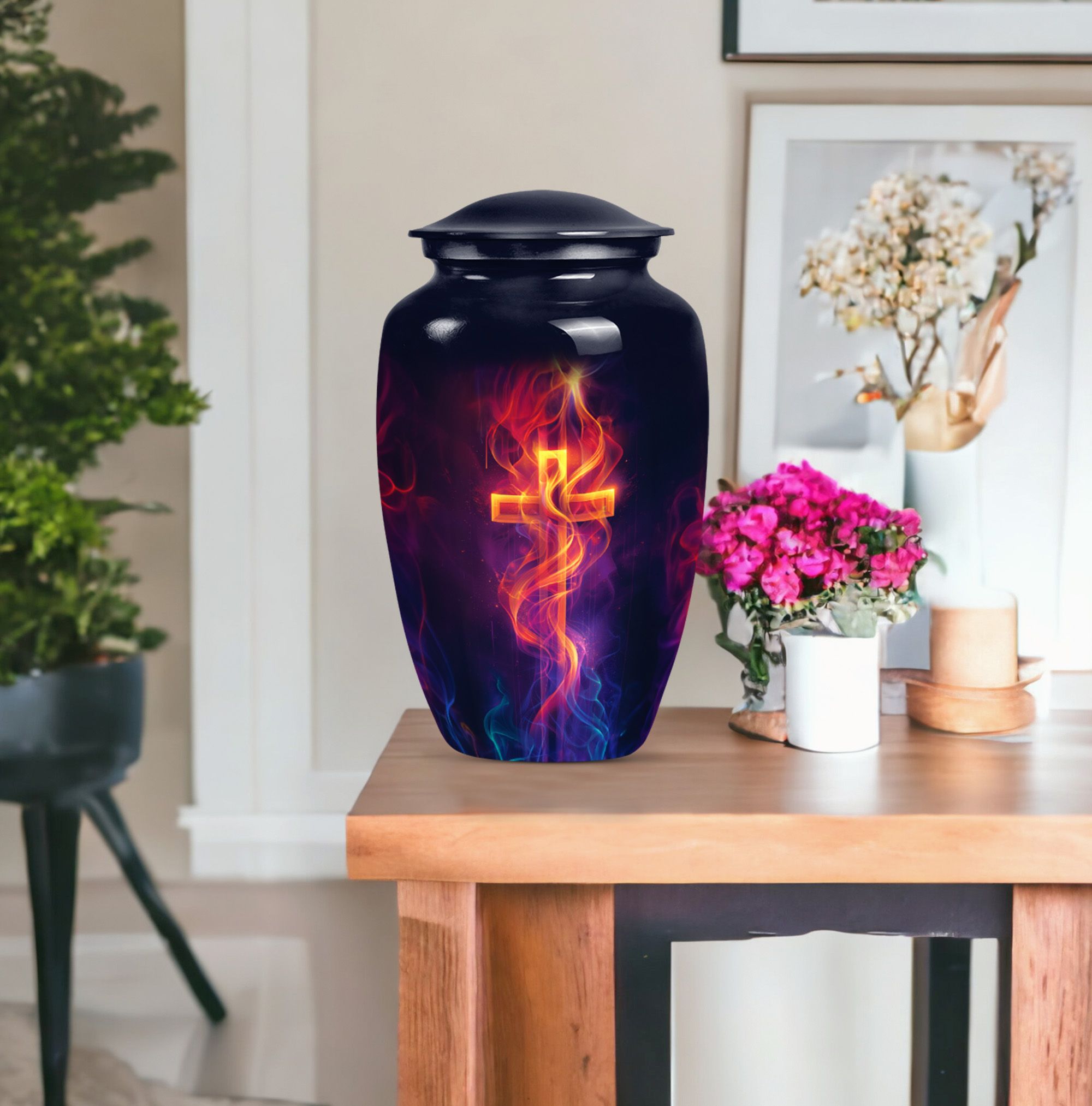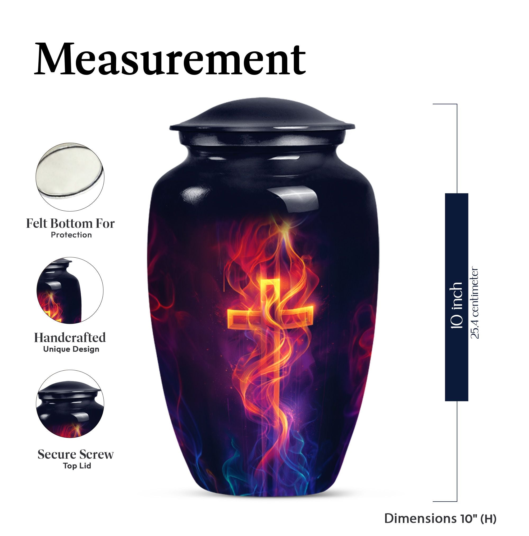 Gaze upon the breathtaking beauty of the 'Aurora Borealis' captured in our 10-inch, aluminium cross urn. Ideal as a remembrance and tribute to your loved ones, this large cremation urn exudes a timeless, classic charm that bridges the gap between tradition and modernity. Crafted to a sophisticated finish, its sturdy weight of 3.3 pounds is representative of its solid construction and durability. At a capacity of 200 cubic inches, it can respectfully hold the ashes of an adult, making it a suitable memorial urn for all genders. The urn package also comes with a velvet pouch for careful containment and respect of the ashes. As a cherished touch, personalize the urn with engraved names, creating a truly special memory of your cherished one. On top of it 'classic urn' design is a noteworthy theme that acquires a new dimension with every look. The perfect urn to honour and remember your departed loved ones.