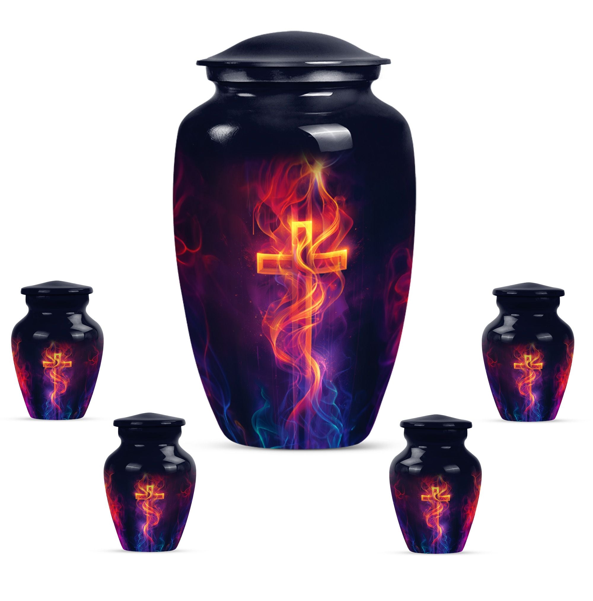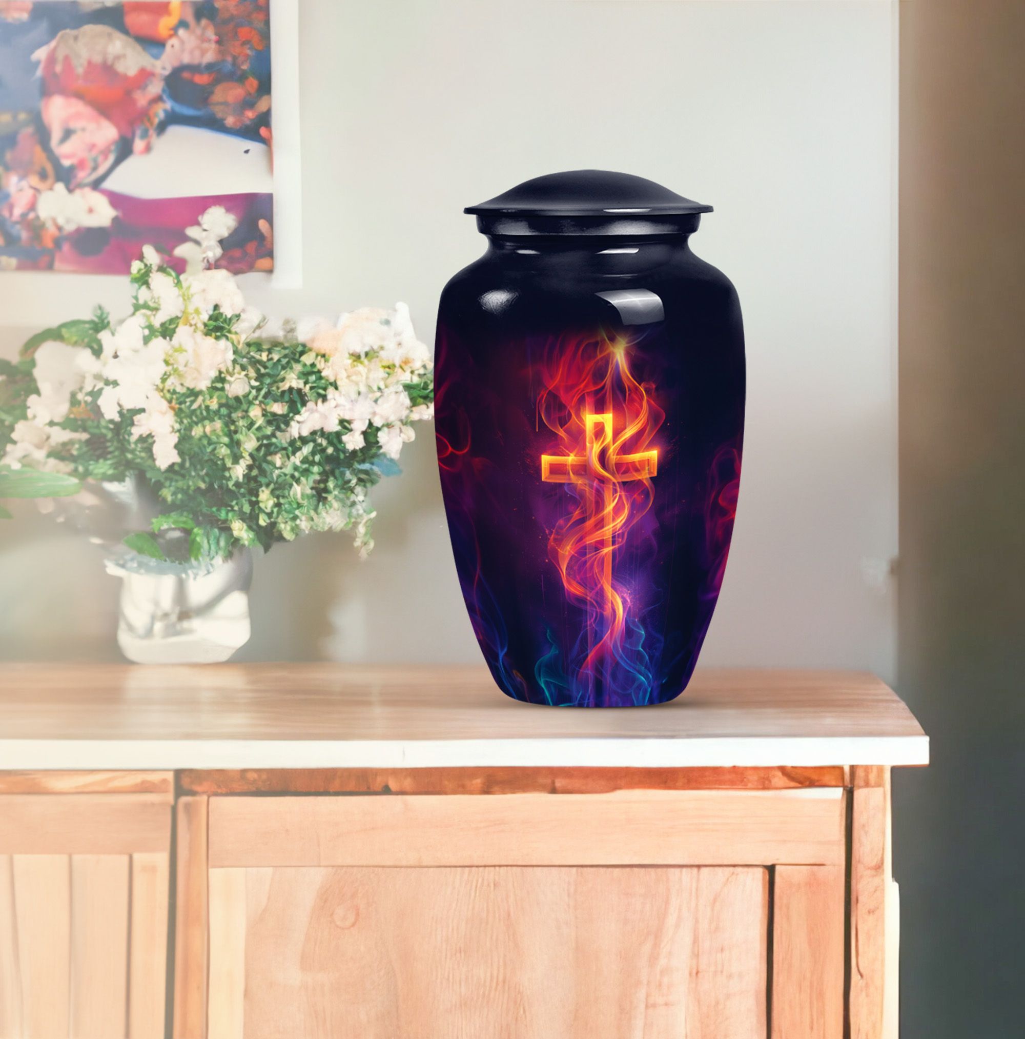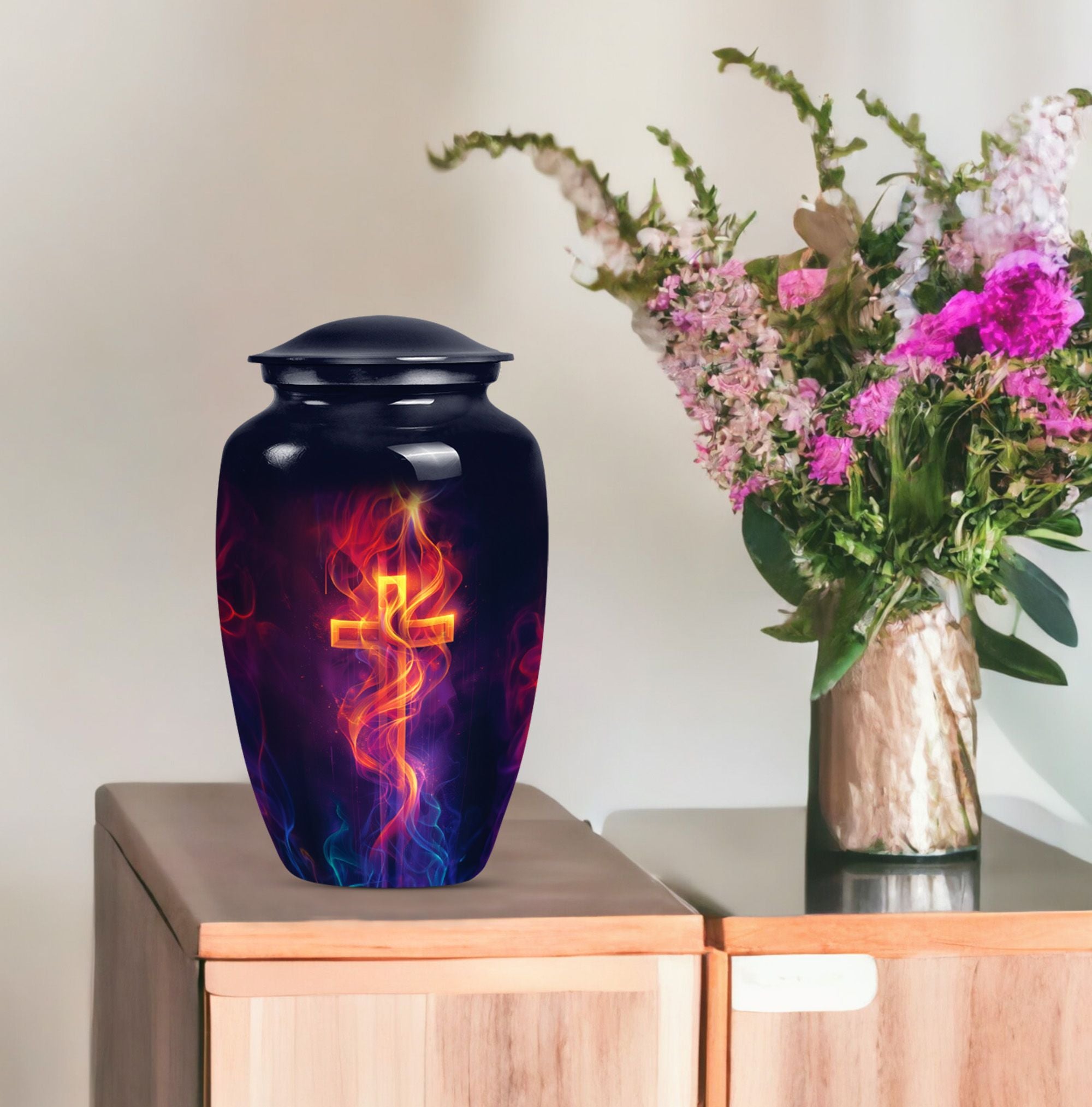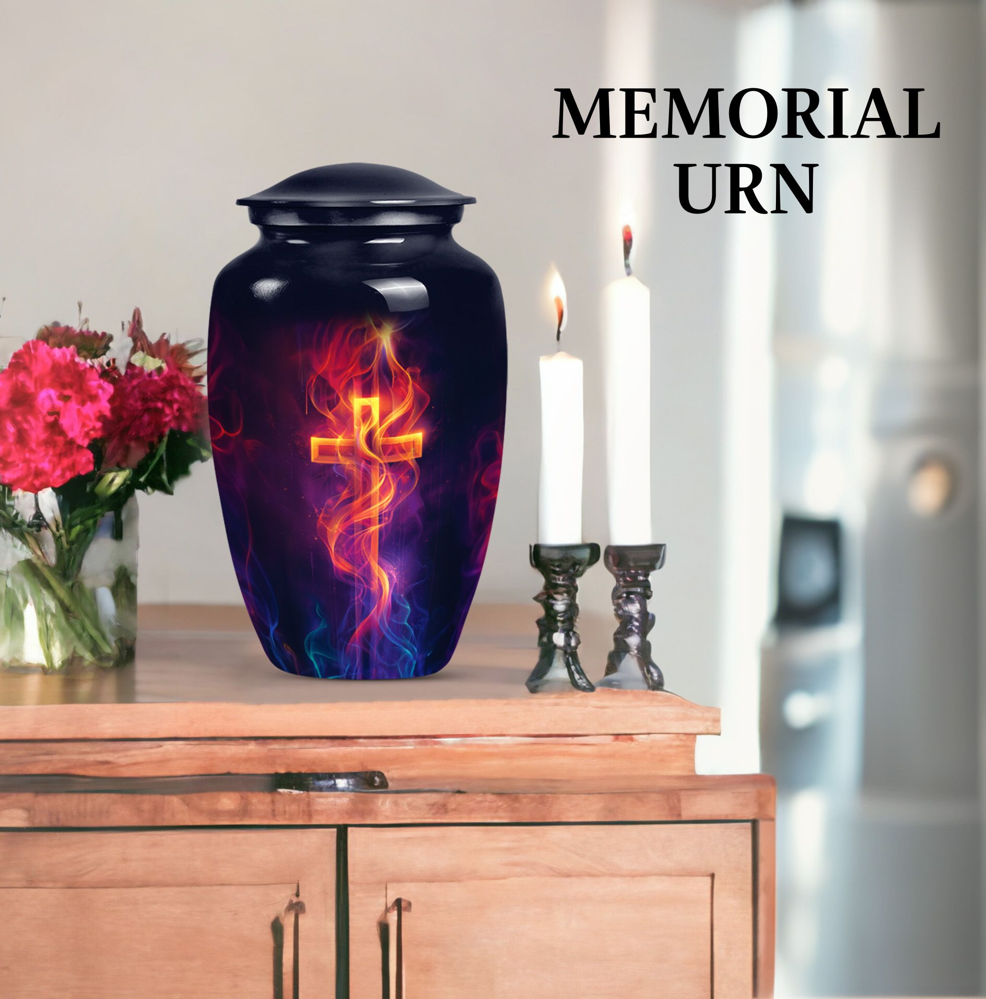 Gaze upon the breathtaking beauty of the 'Aurora Borealis' captured in our 10-inch, aluminium cross urn. Ideal as a remembrance and tribute to your loved ones, this large cremation urn exudes a timeless, classic charm that bridges the gap between tradition and modernity. Crafted to a sophisticated finish, its sturdy weight of 3.3 pounds is representative of its solid construction and durability. At a capacity of 200 cubic inches, it can respectfully hold the ashes of an adult, making it a suitable memorial urn for all genders. The urn package also comes with a velvet pouch for careful containment and respect of the ashes. As a cherished touch, personalize the urn with engraved names, creating a truly special memory of your cherished one. On top of it 'classic urn' design is a noteworthy theme that acquires a new dimension with every look. The perfect urn to honour and remember your departed loved ones.