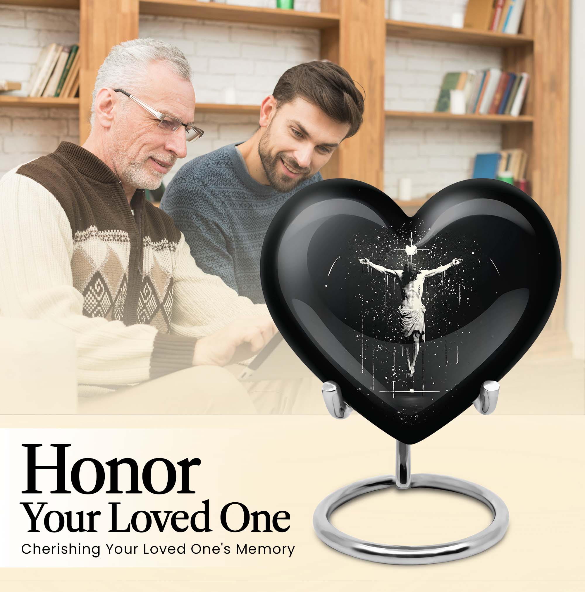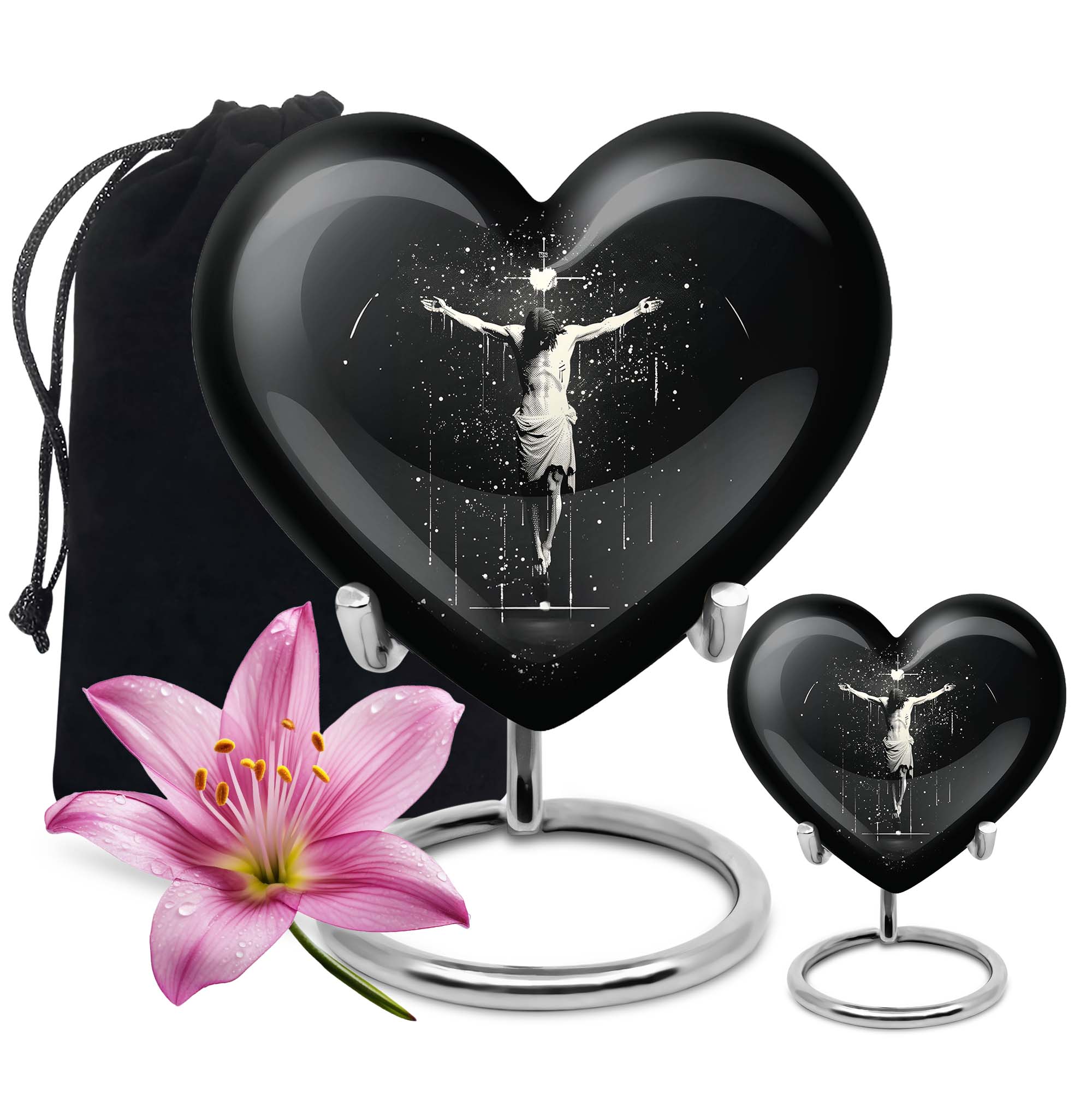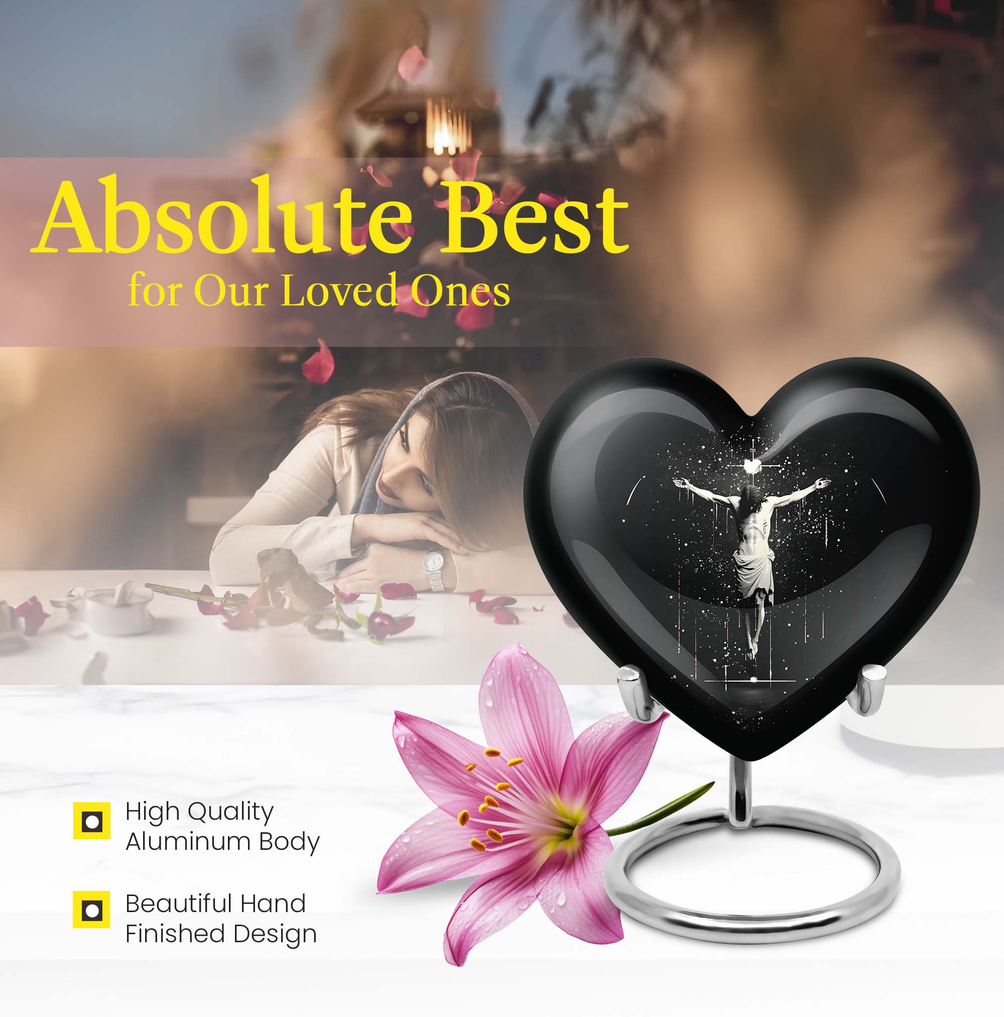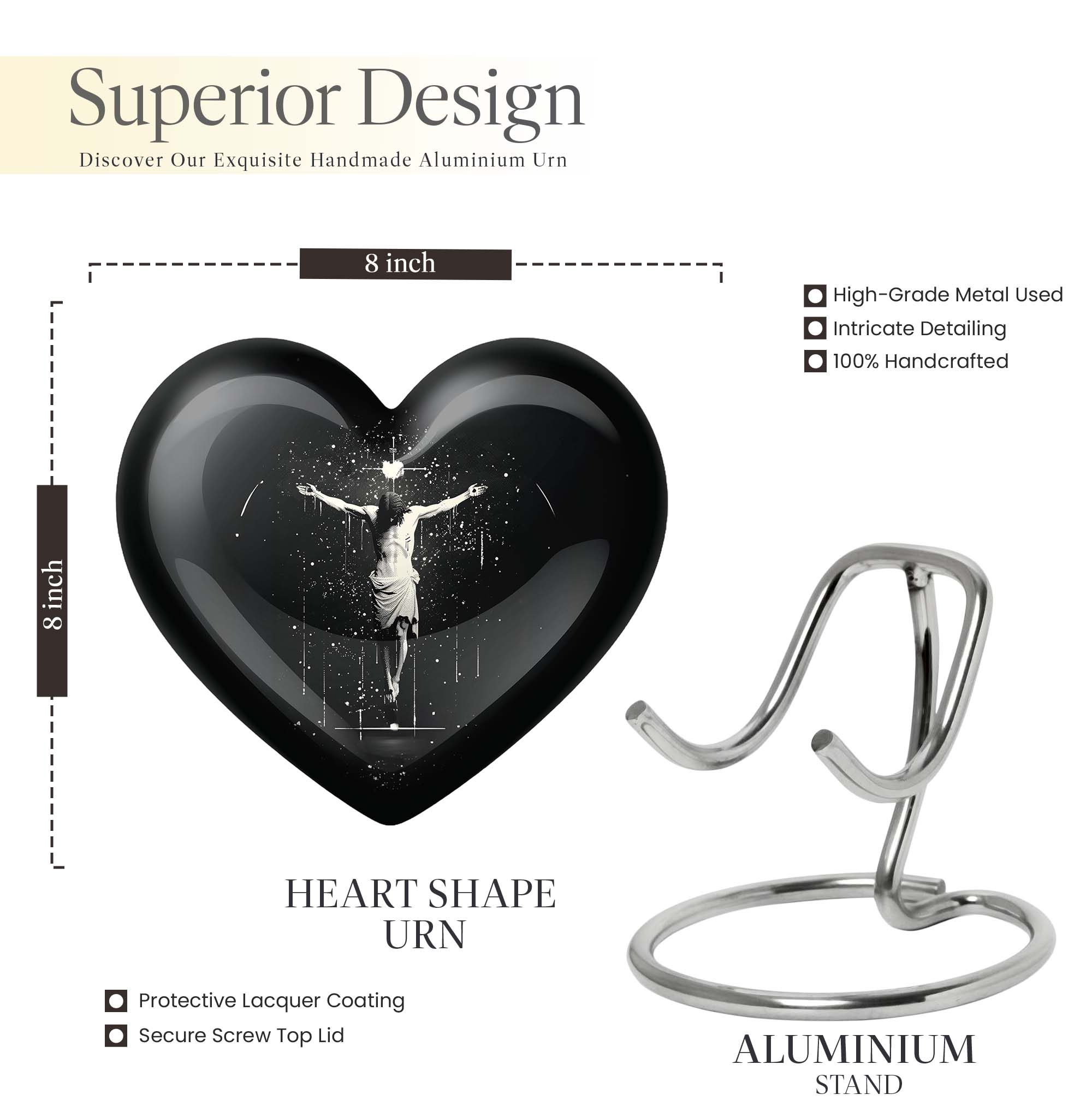 Preserve your loved ones' memories with our uniquely crafted, heart-shaped memorial urn for ashes. Crafted from durable yet lightweight aluminium, tailor this large urn to make it truly unique with our customization options. Personalize it with engraved names making it a truly unique and thoughtful tribute. Measuring 10 inches in height, the urn offers a generous interior space of 200 cubic inches, suitable for an adult male or female. The urn weighs 3.3 pounds, allowing for easy placement and transport. Our heart urn comes with a complementary velvet pouch, providing a respectful containment for the ashes. Bring a touch of class to any memorial ceremony with this urn that elegantly displays a vintage gramophone theme. Remember your beloved ones in a meaningful way with a unique, lovingly-crafted cross urn designed for enduring respect and remembrance. Ideal for phrases related to 'urn for mom', 'funeral urn for ashes for women', 'burial urns', 'cross Urn', and more. NOTE: Design is excluded as per instructions.