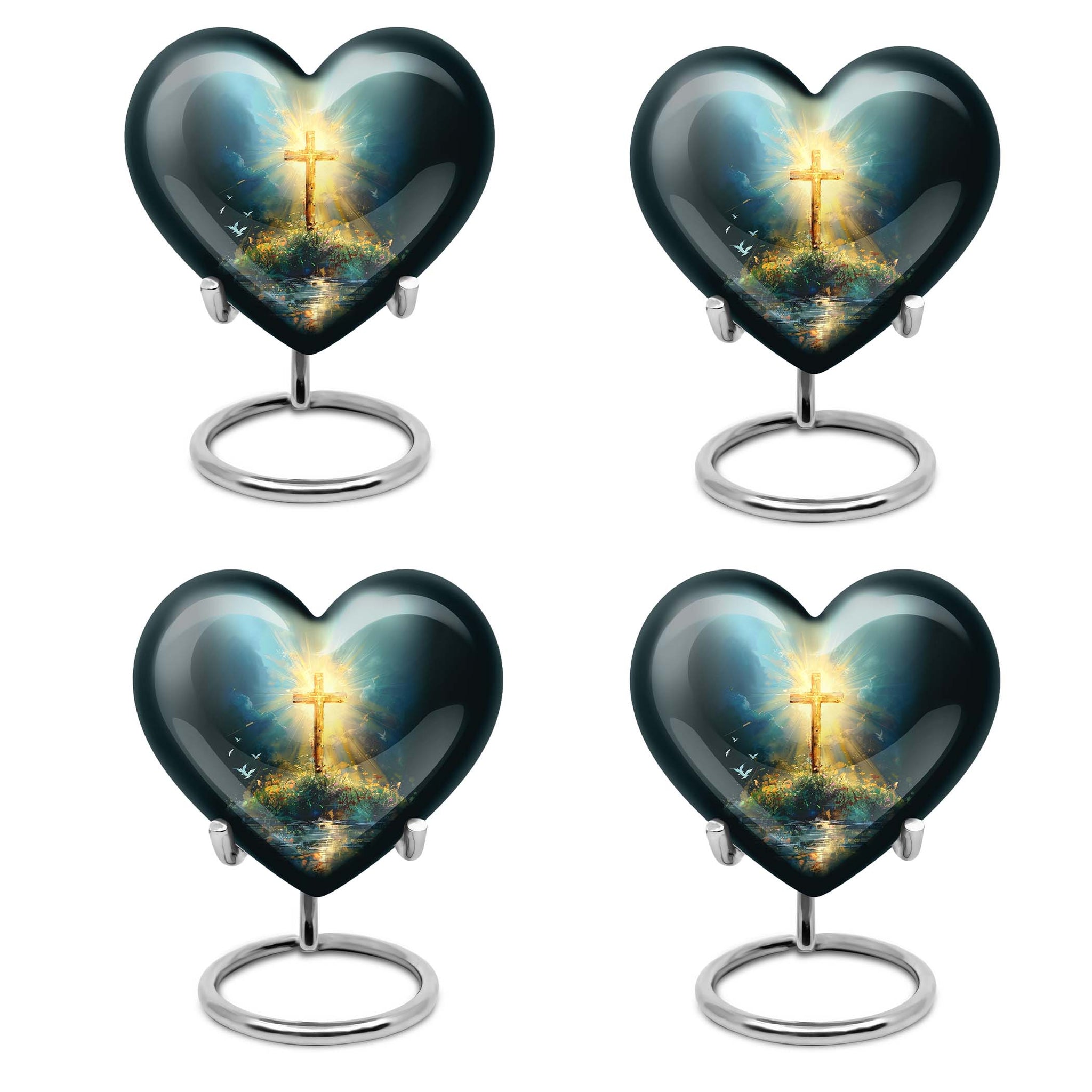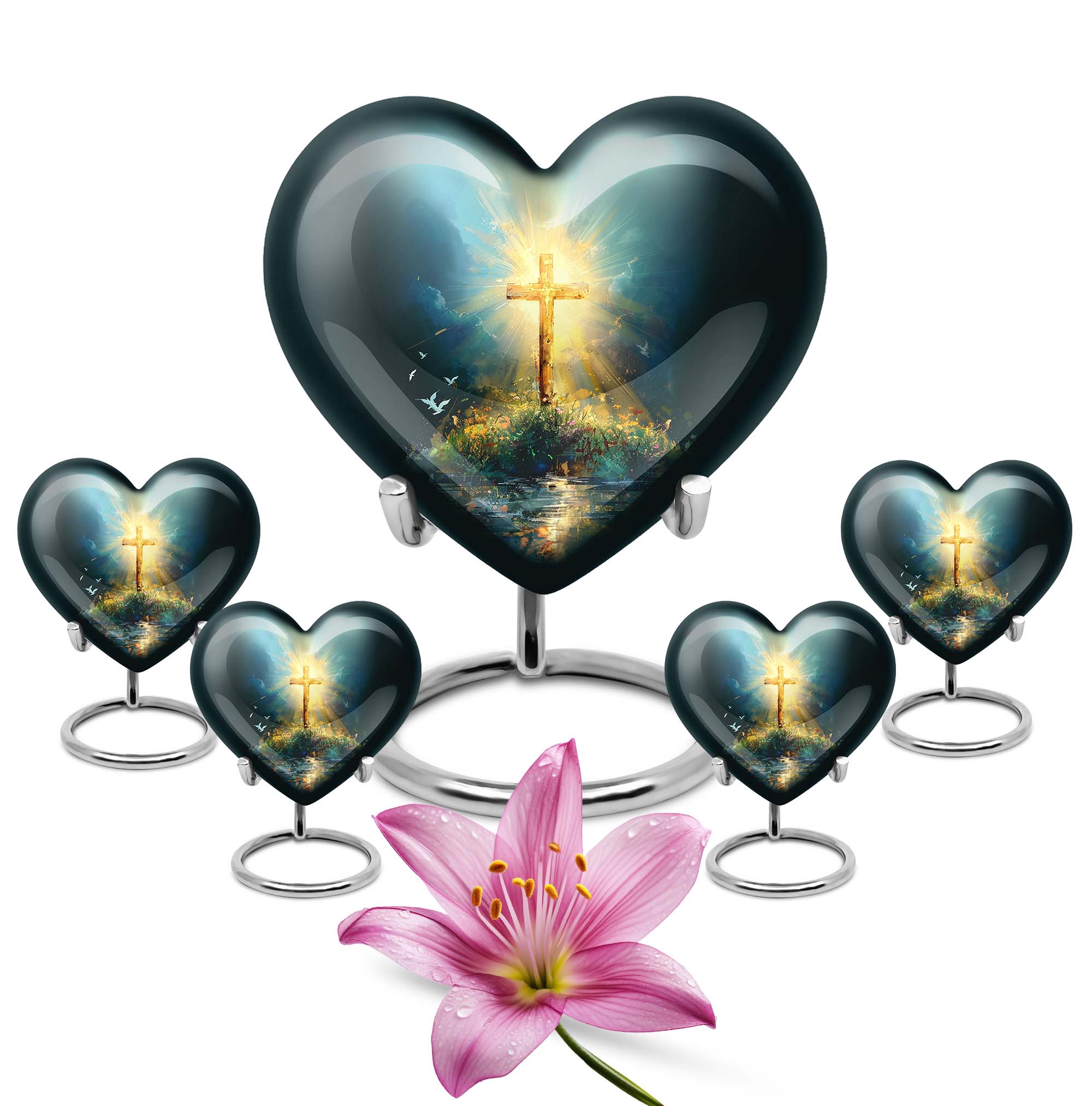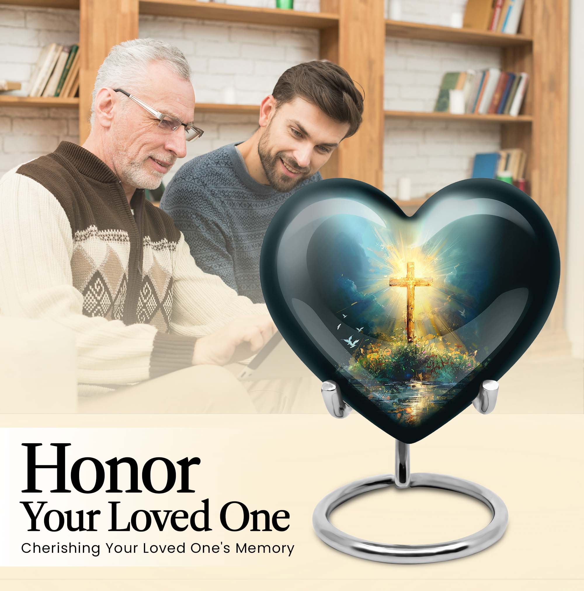 Embrace the continuity of love and remembrance with this elegantly crafted Heart Urn. A product born from meticulous construction, this 10-inch cremation urn is aptly suited to serve as a resplendent memorial for your beloved. Made from resilient aluminium, it weighs a solid 3.3 pounds and is characterized by an enchanting Aurora Borealis theme. This high capacity urn can contain up to 200 cubic inches of ashes. Personalization through engraving presents an opportunity for a bespoke tribute that brings additional comfort. Every purchase comes complete with a plush velvet pouch, enhancing the dignified containment of ashes. This makes a fitting choice for anyone in search of a funeral urn for men's ashes or adult ashes men. Terms 'cross Urn' and 'memorial ash urns' are synonymous with this product. Trust this large urn to become a cherished repository of memories, reverence and peace.