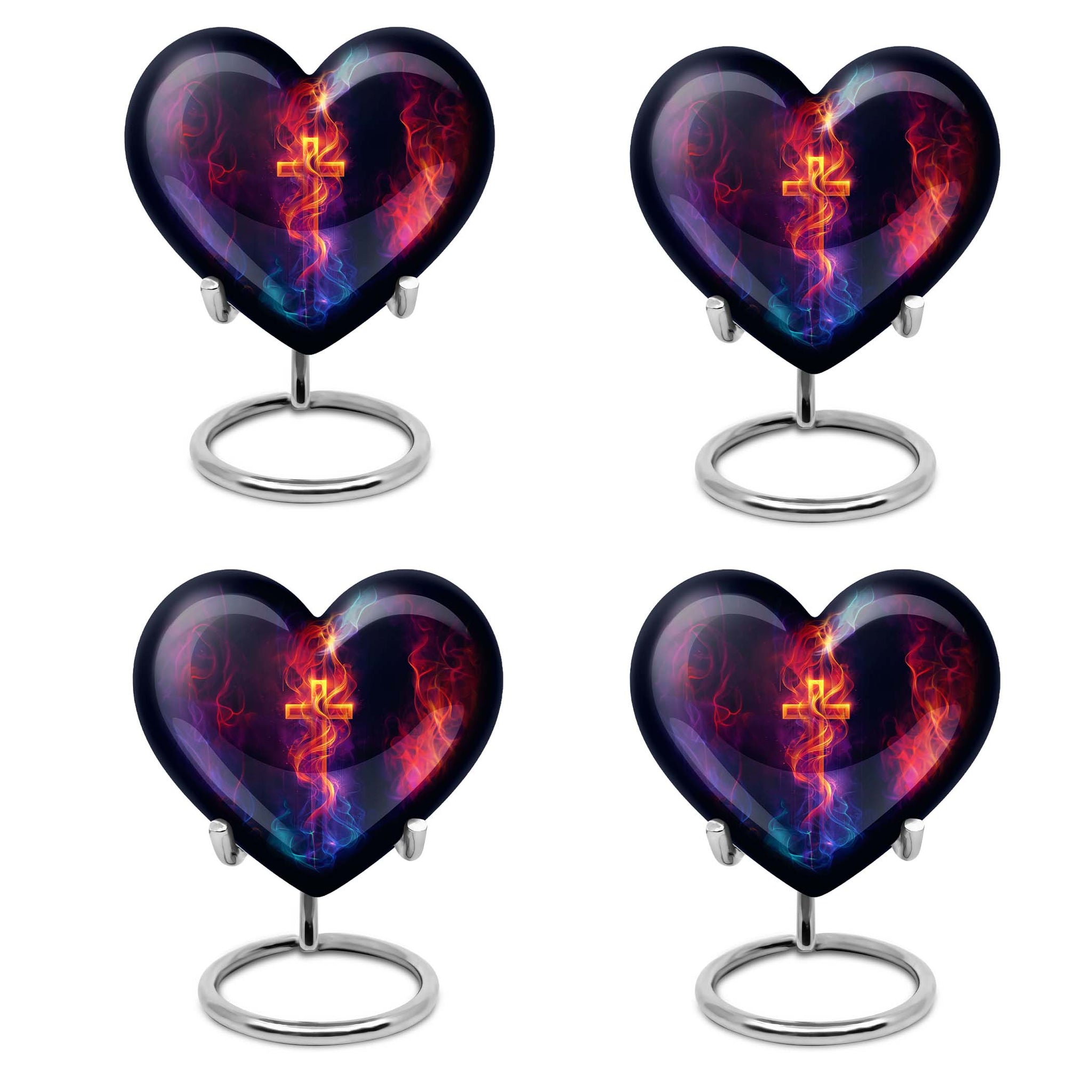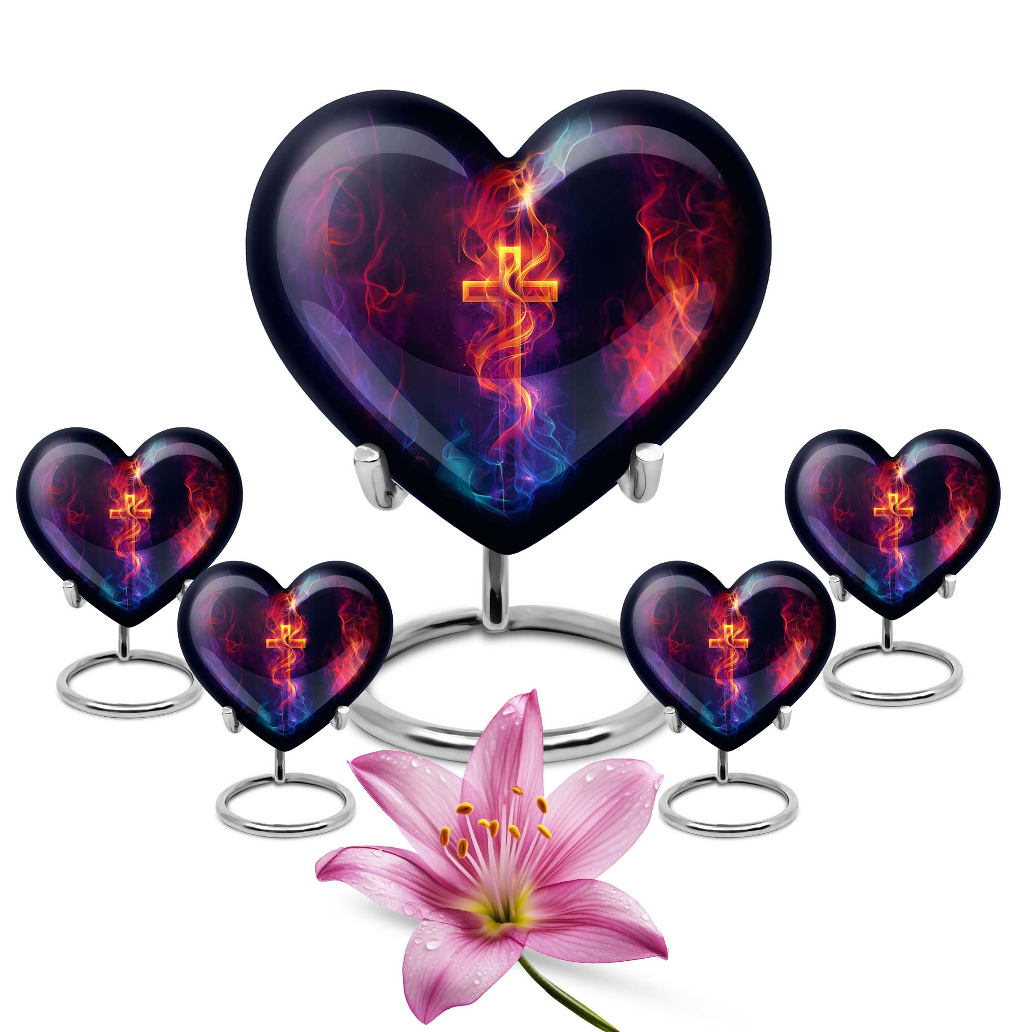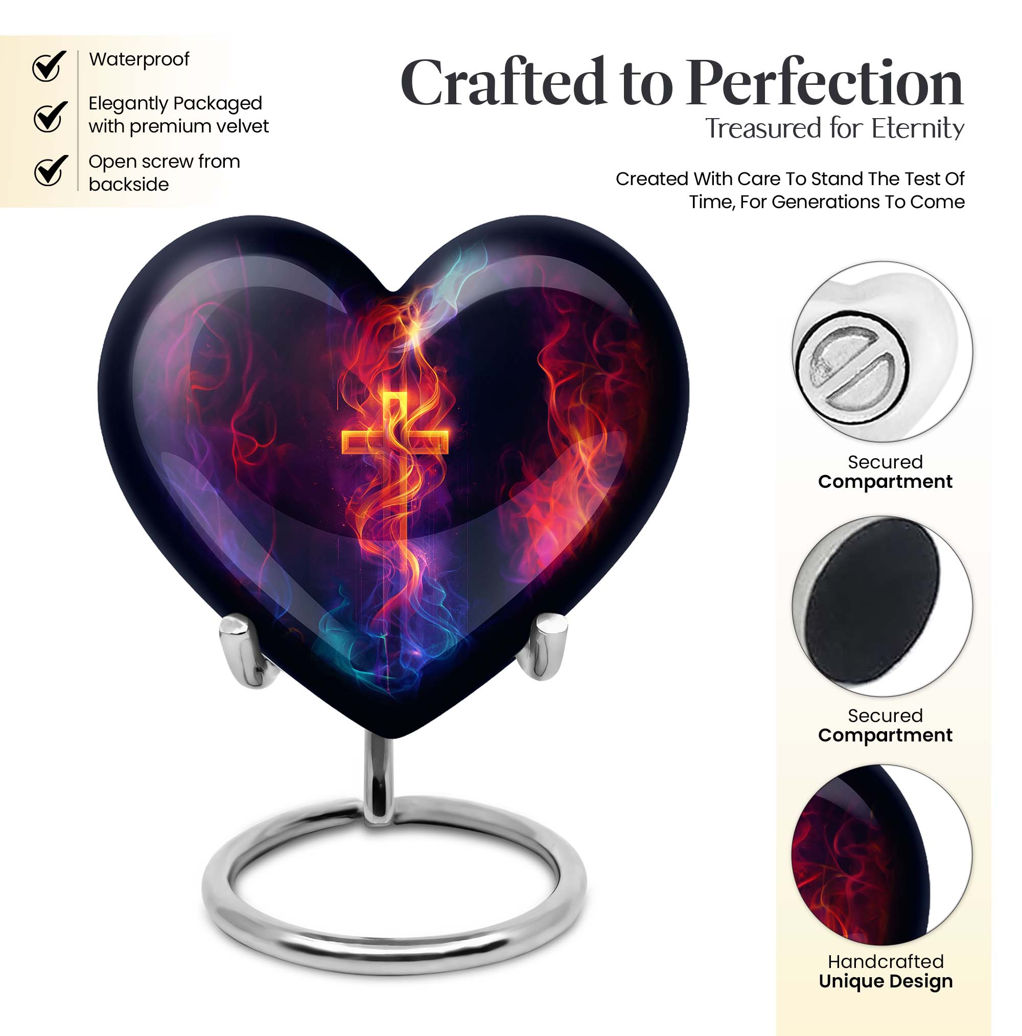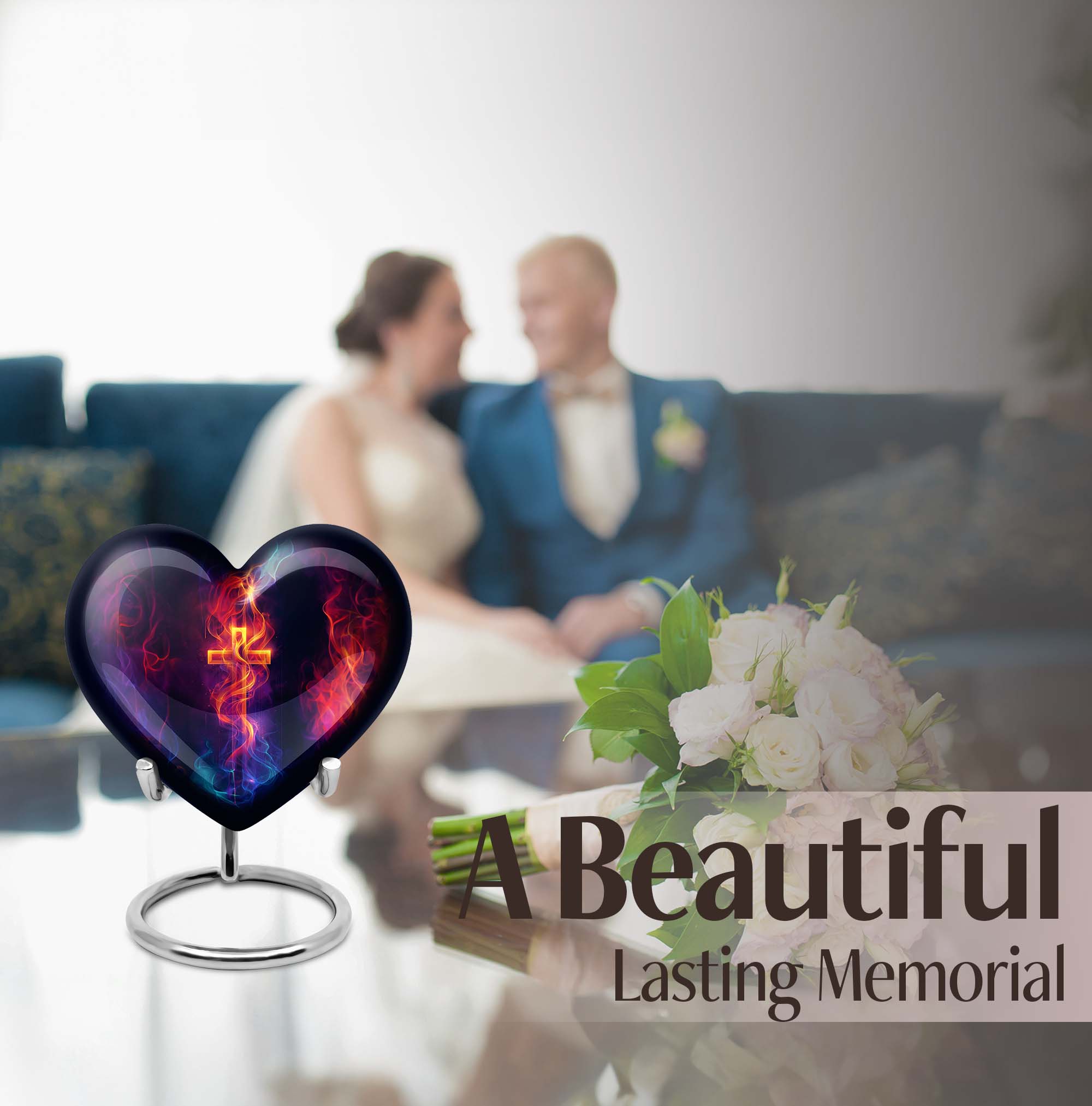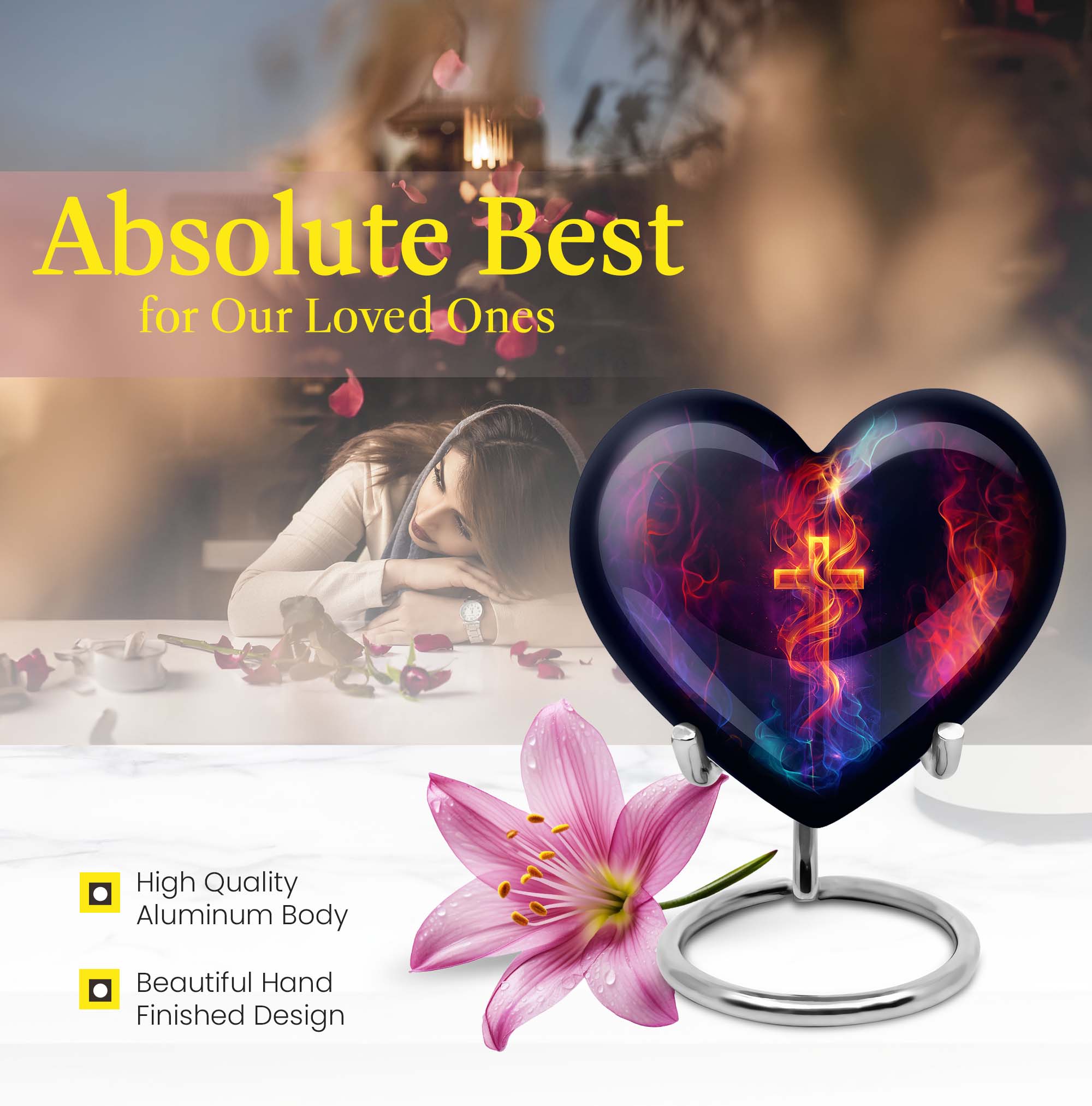 Pay a heartfelt tribute to your departed loved ones with our distinguished cross urn. This sizeable cremation urn stands 10 inches tall and weighs 3.3 pounds, with a substantial capacity to contain up to 200 cubic inches. The urn is meticulously crafted from high-quality aluminium, ensuring it stands the test of time. The captivating 'Aurora Borealis' theme lends an air of divine serenity, making it a fitting memorial urn for both men and women. With a unique heart-shaped design, the urn is more than just a final resting place: it's a symbol of everlasting love and respect. It comes accompanied by a velvet pouch for secure containment of ashes. Moreover, this large urn offers customization options - personalize it with engraved names to create a lasting memory of your loved ones. Whether you're seeking urns for adult human ashes or specifically designed metal urns for human ashes, this product is an exceptional choice. Note: The urn design and size may not account for the entire design feature.