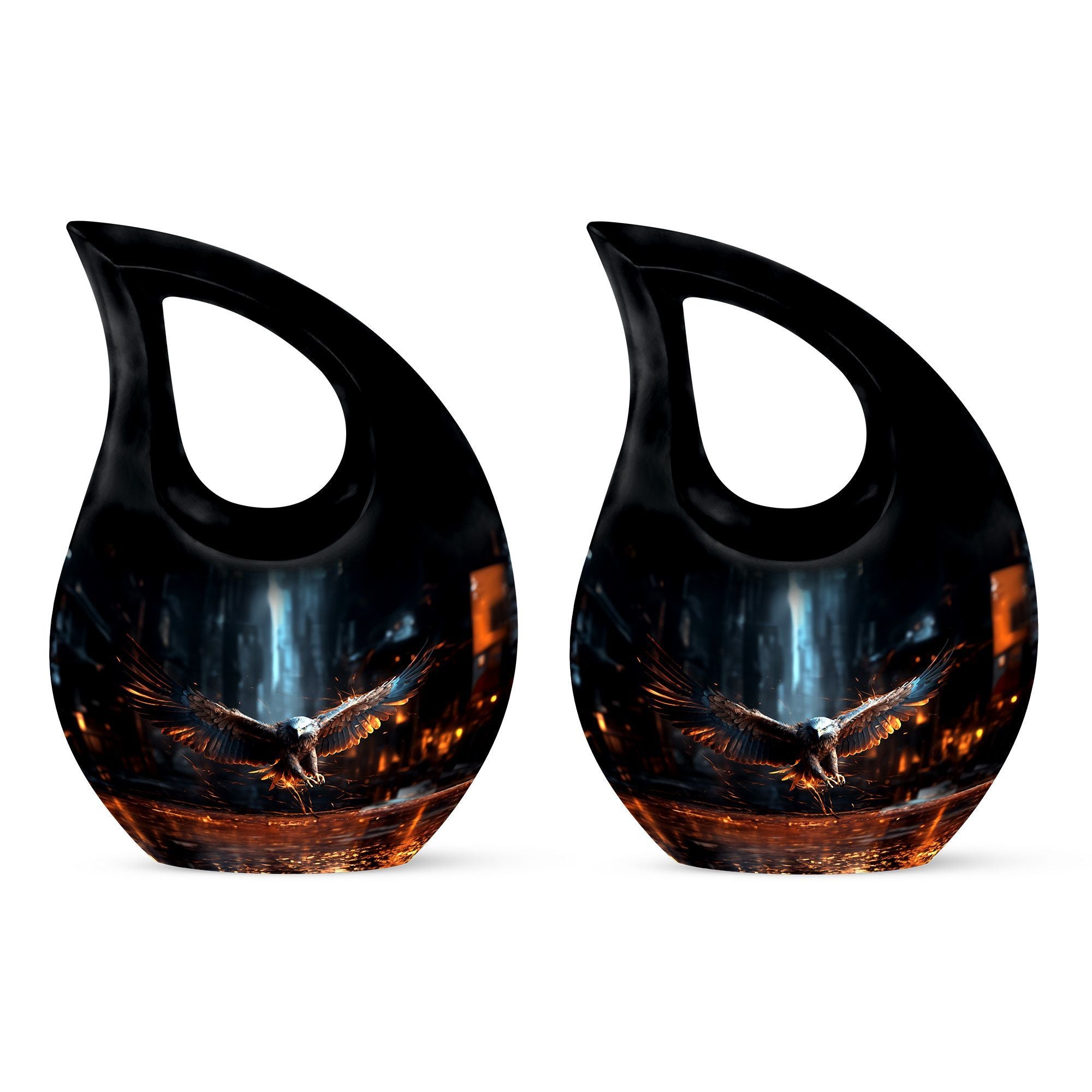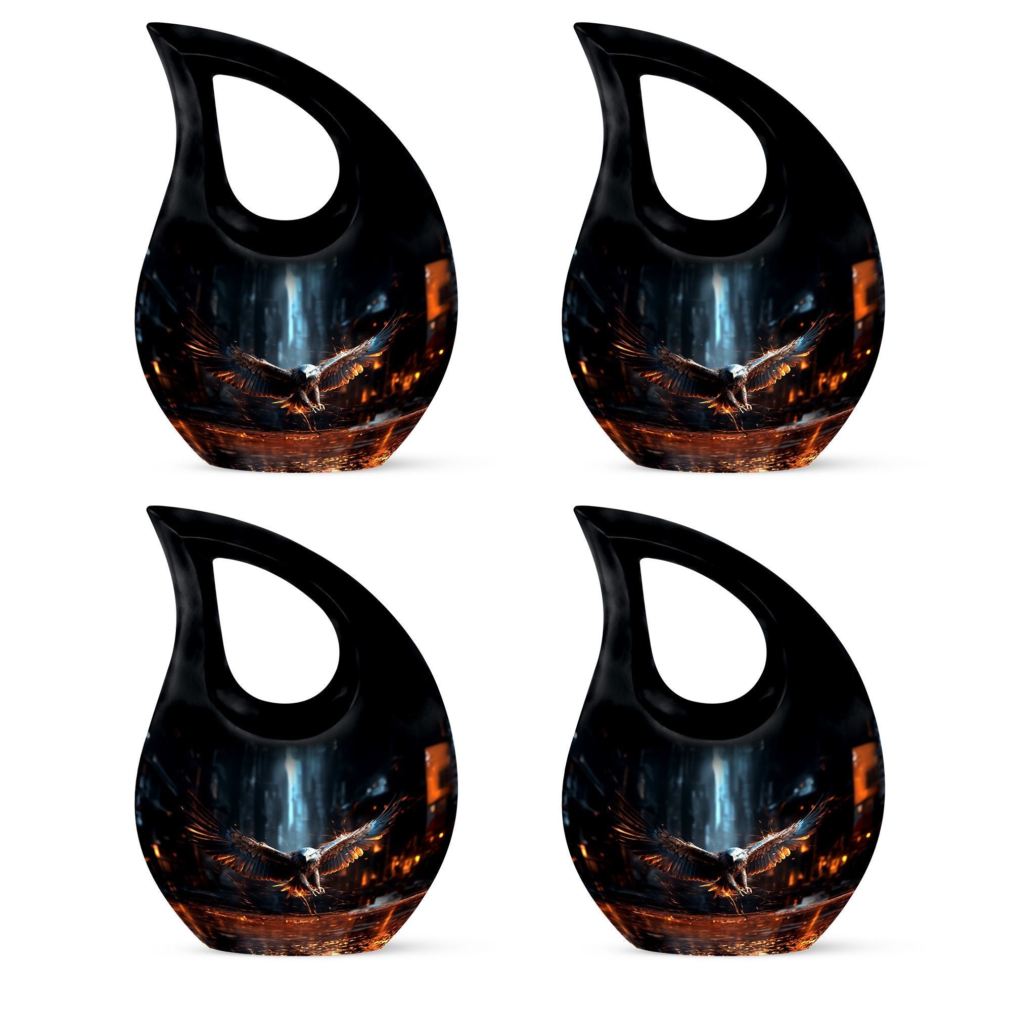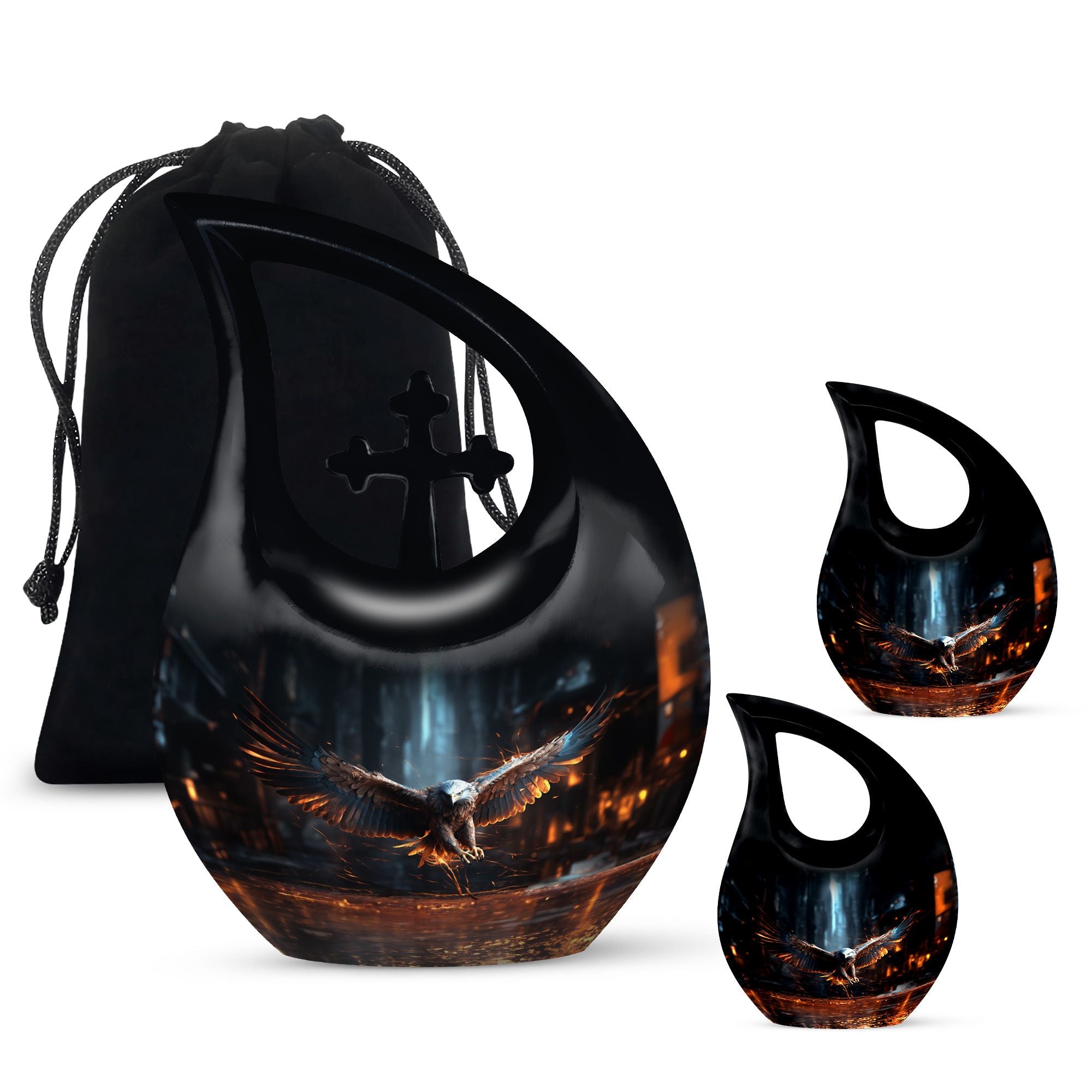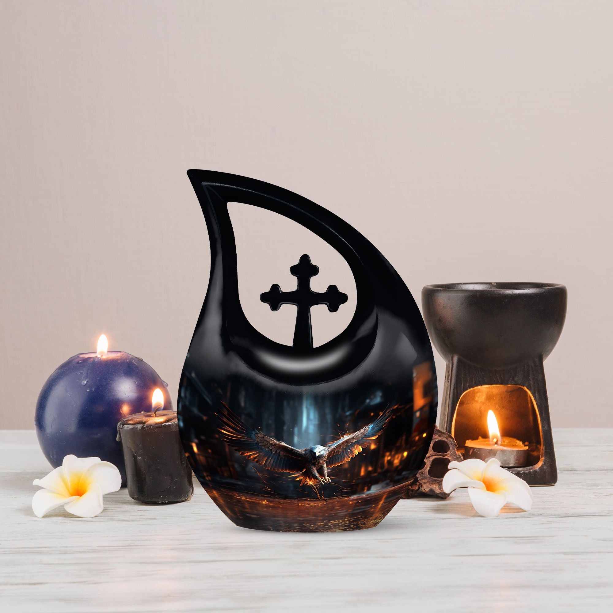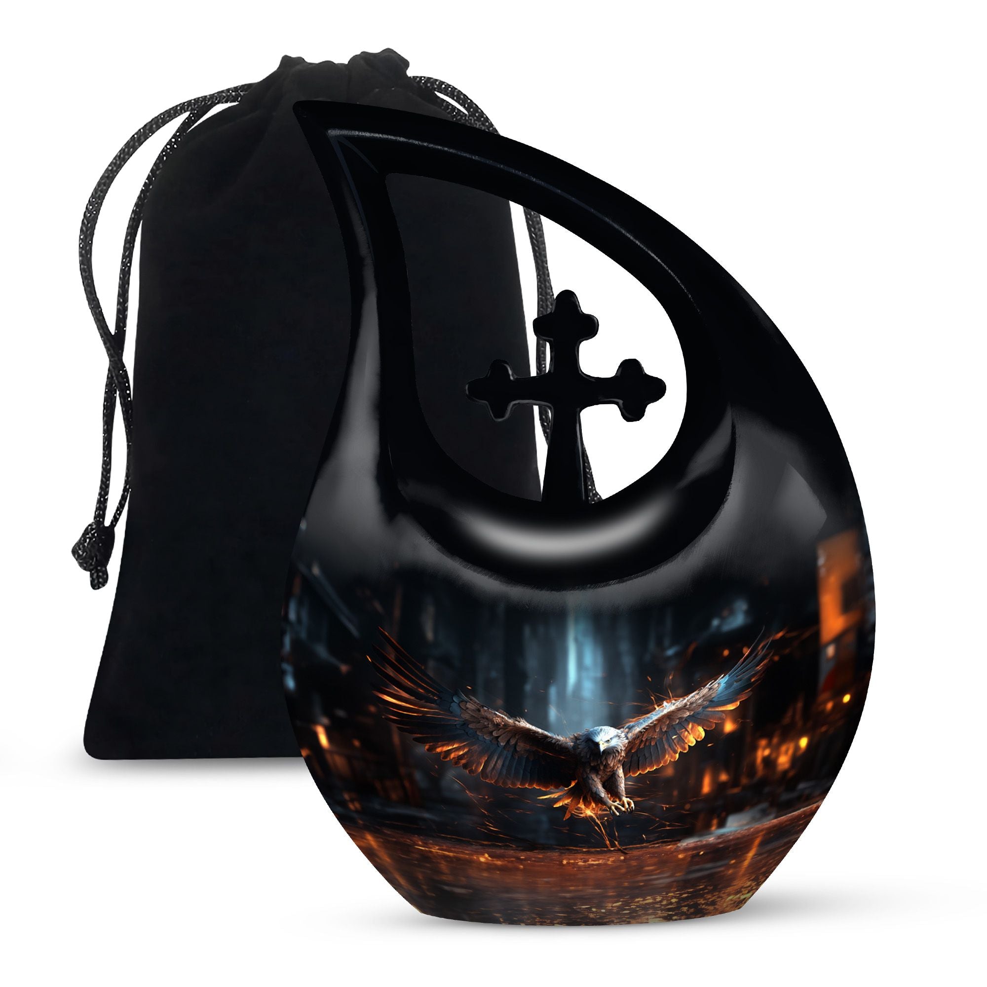 Crafted from high-quality aluminum, this urn is built to last. The sleek black finish is beautifully complemented by the soaring eagle and subtle cross-drop detailing, symbolizing freedom, faith, and eternal peace. This large human ashes urn combines superior craftsmanship with refined aesthetics, making it ideal for families seeking large cremation urns that merge art and purpose. The secure screw-top lid ensures ashes are safely preserved, while the classic design suits any home or memorial setting.