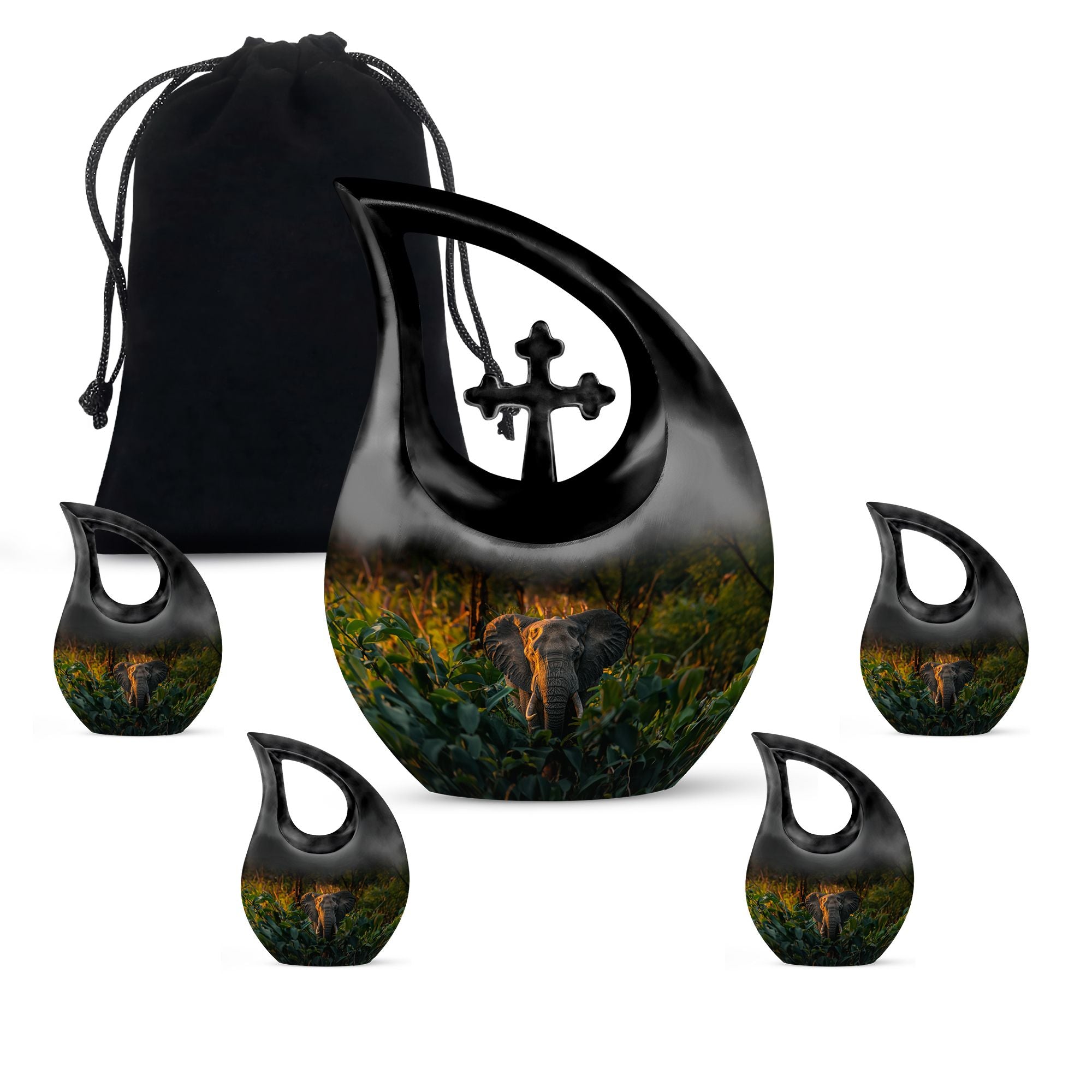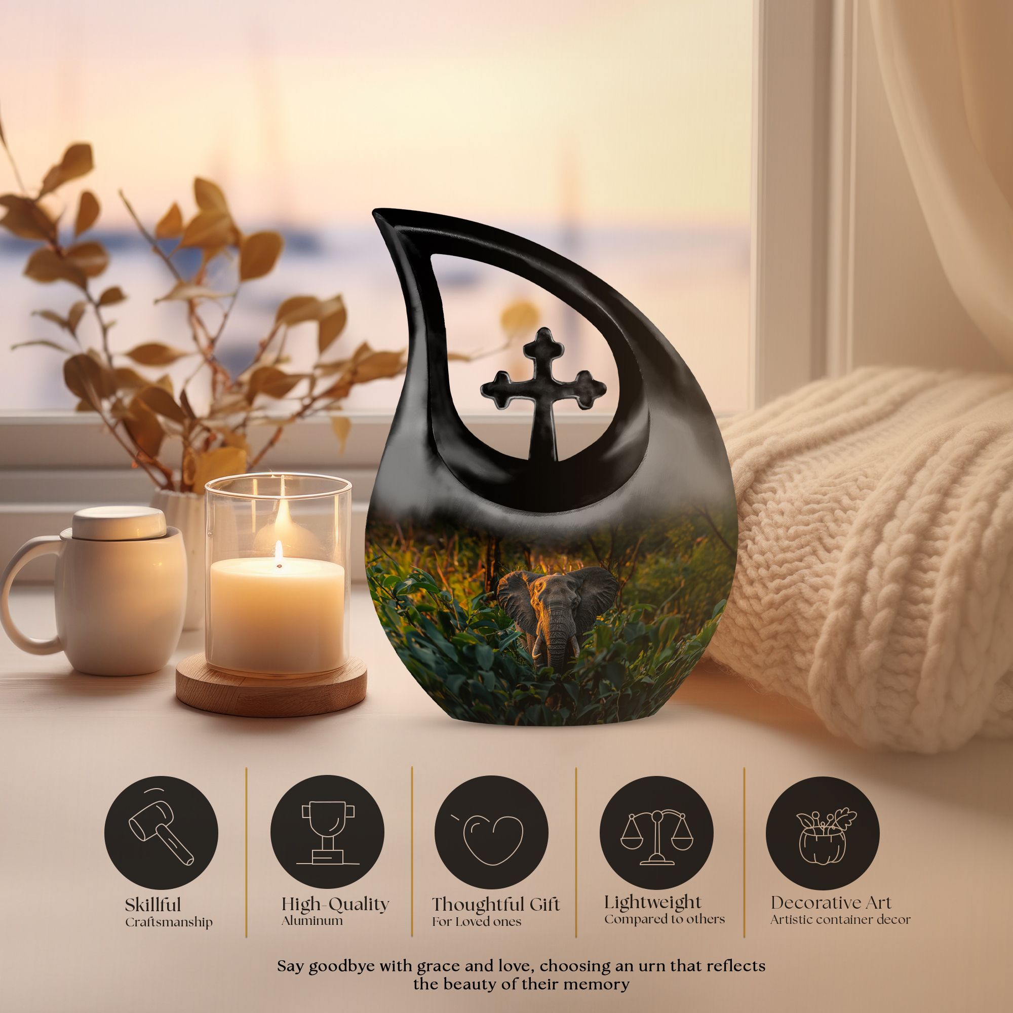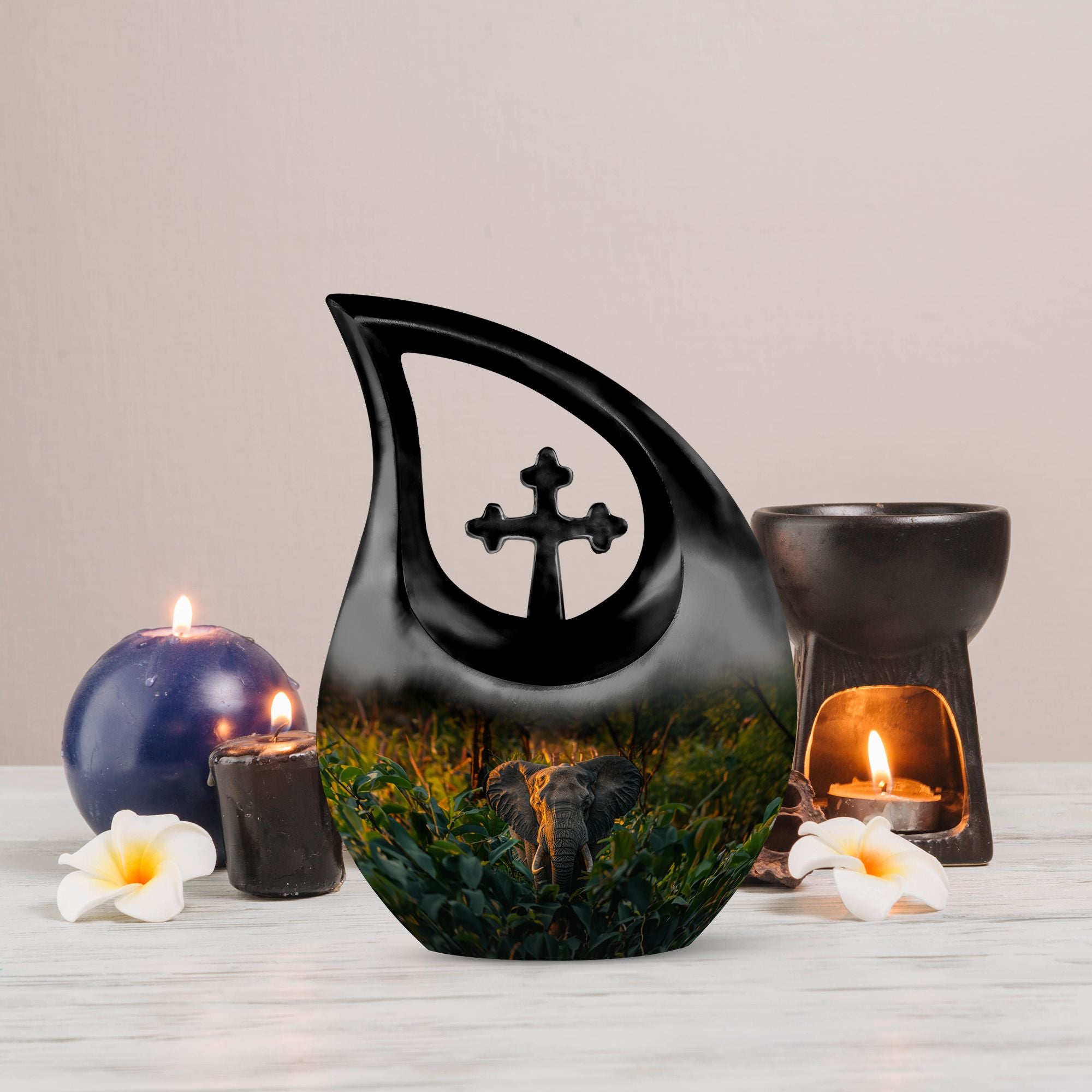 Impeccably crafted from high-quality aluminium, this 10-inch Elephant Urn blends modern elegance with an enduring symbol of strength and wisdom. This unique Large Urn carries the powerful theme of the Elephant, adding a spiritual spark to its appearance. Weighing a sturdy 3.3 pounds, it comfortably holds up to 200 cubic inches of ashes, providing ample space for your loved one's memories. With the added option for personalization, you can engrave names, imprinting a permanent mark of tribute. This stand-out memorial urn is not just a container, but a sacred space that embodies love, respect, and remembrance. This meaningful urn comes with a velvet pouch providing a secure containment for the ashes. The Cross Drop design imparts a salient feature to this memorial urn, making it an ideal 'Urns for Angels', 'Urn For Mom' and serves as 'Remembrance Urns For Ashes'. Considering all its features, this urn is not just an object, but a symbol of enduring love and honor.
