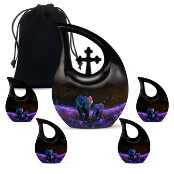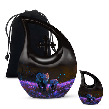 Crafted from premium aluminum, this human cremation urn features a stunning night meadow design illuminated by soft tones of indigo and silver. Two intricately engraved elephants stand side by side beneath a moonlit sky, symbolizing unity and peace. The polished surface and secure screw-top lid ensure safety and elegance, making it perfect for display or burial. Available as a single urn or cremation urns set, it provides a meaningful memorial for those who journeyed through life together.