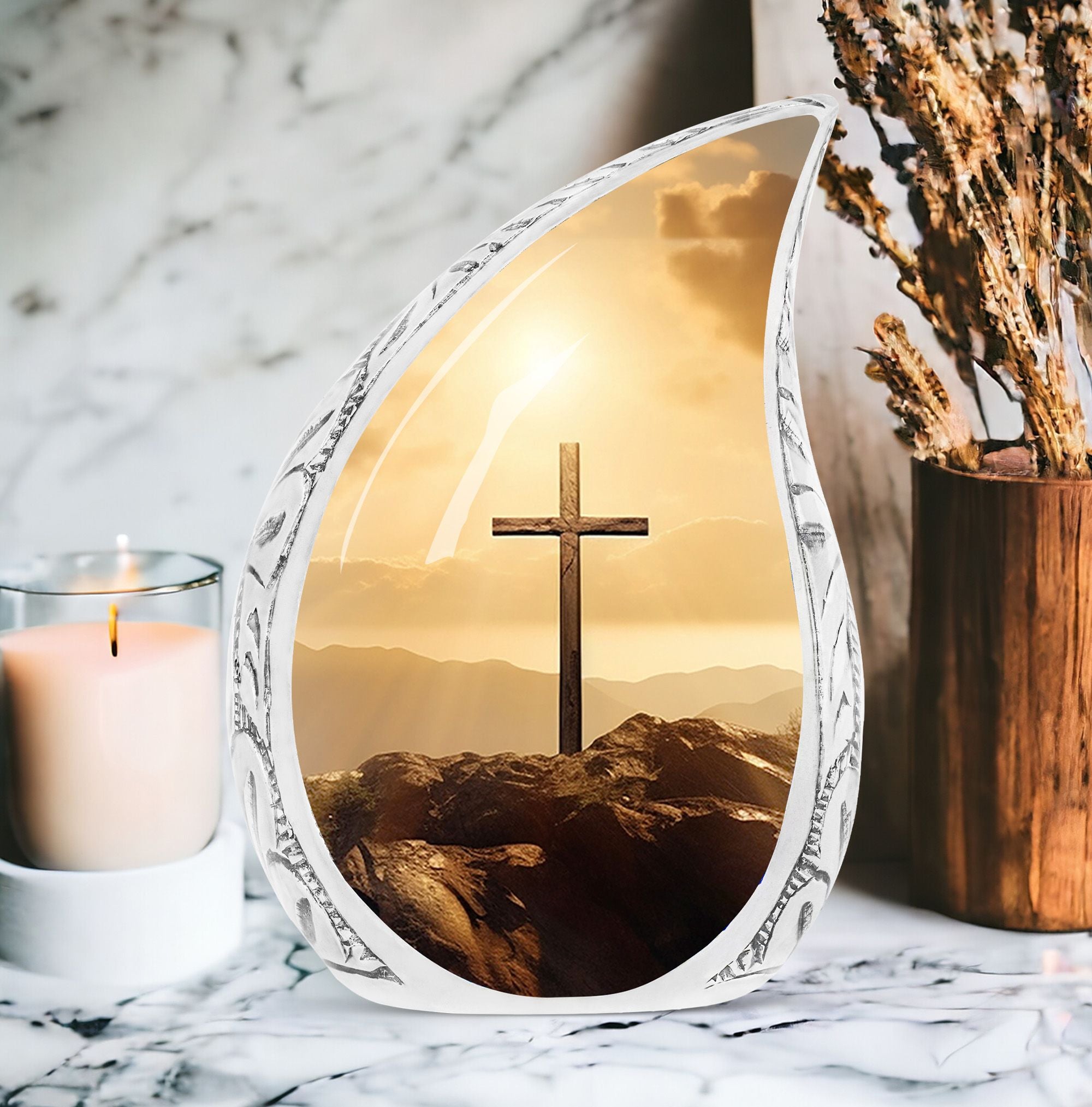 Honor your departed loved one with our Jesus Cross Memorial Urn. A symbol of faith and hope, it offers a poignant and respectful way to pay homage. Constructed with aluminum, this large urn defines durability, promising to enshrine memories forever. Measuring in at a hefty 3.3 pounds with dimensions of 10 inches in height, it boasts a capacity of 200 cubic inches. This ensures adequate room to store precious ashes securely. It is not just the material robustness that sets this piece apart, but the customizable aspect as well. Personalize it with engraved names adding an intimate touch that truly celebrates the individual. The Jesus Cross Memorial Urn comes with a velvet pouch, providing an elegant containment solution for the ashes. An essential in Memorial Ceremony Supplies, this large urn is a solemn reminder of fond memories, regardless if you're looking for burial urns for adults, a unique urn container, or customized cremation urns.