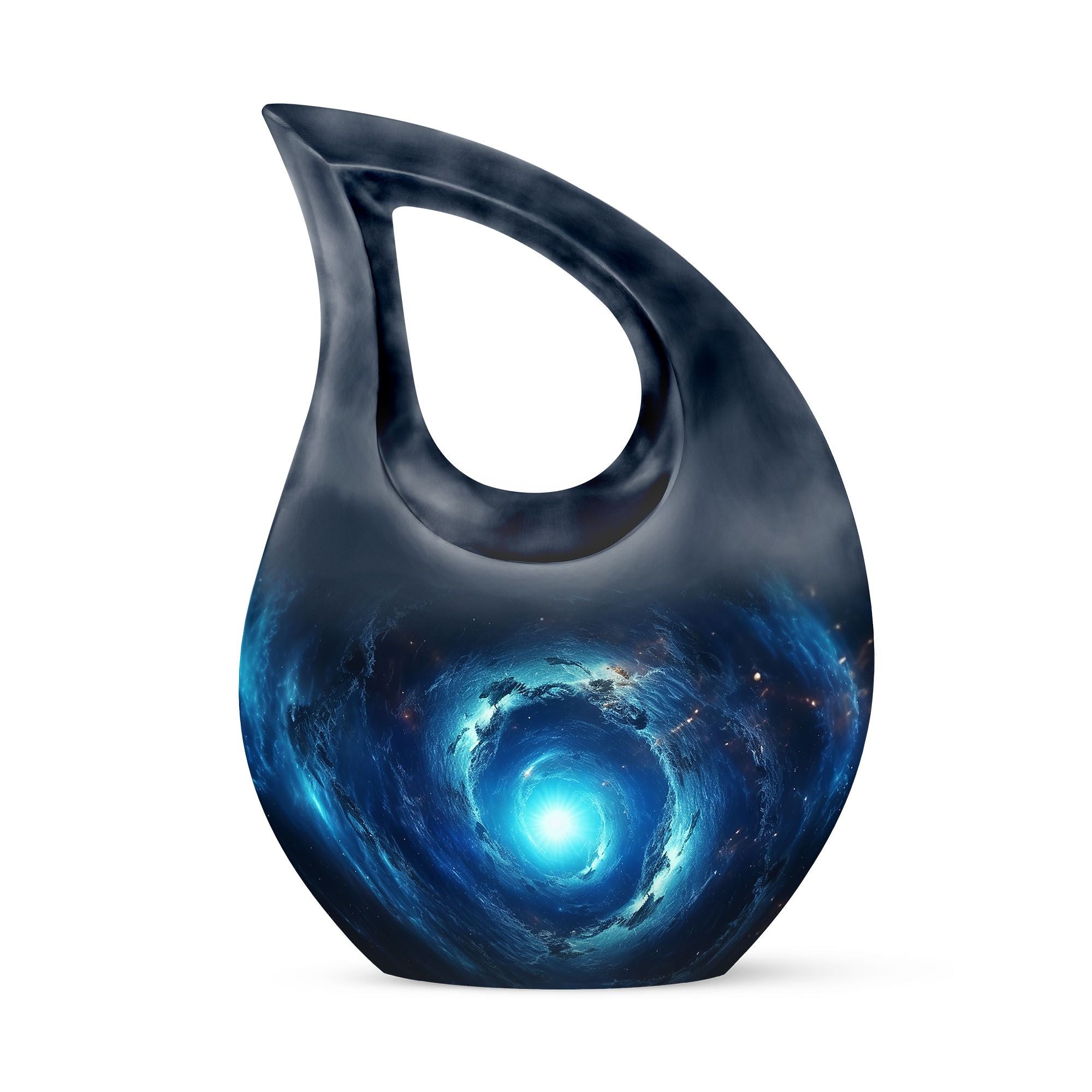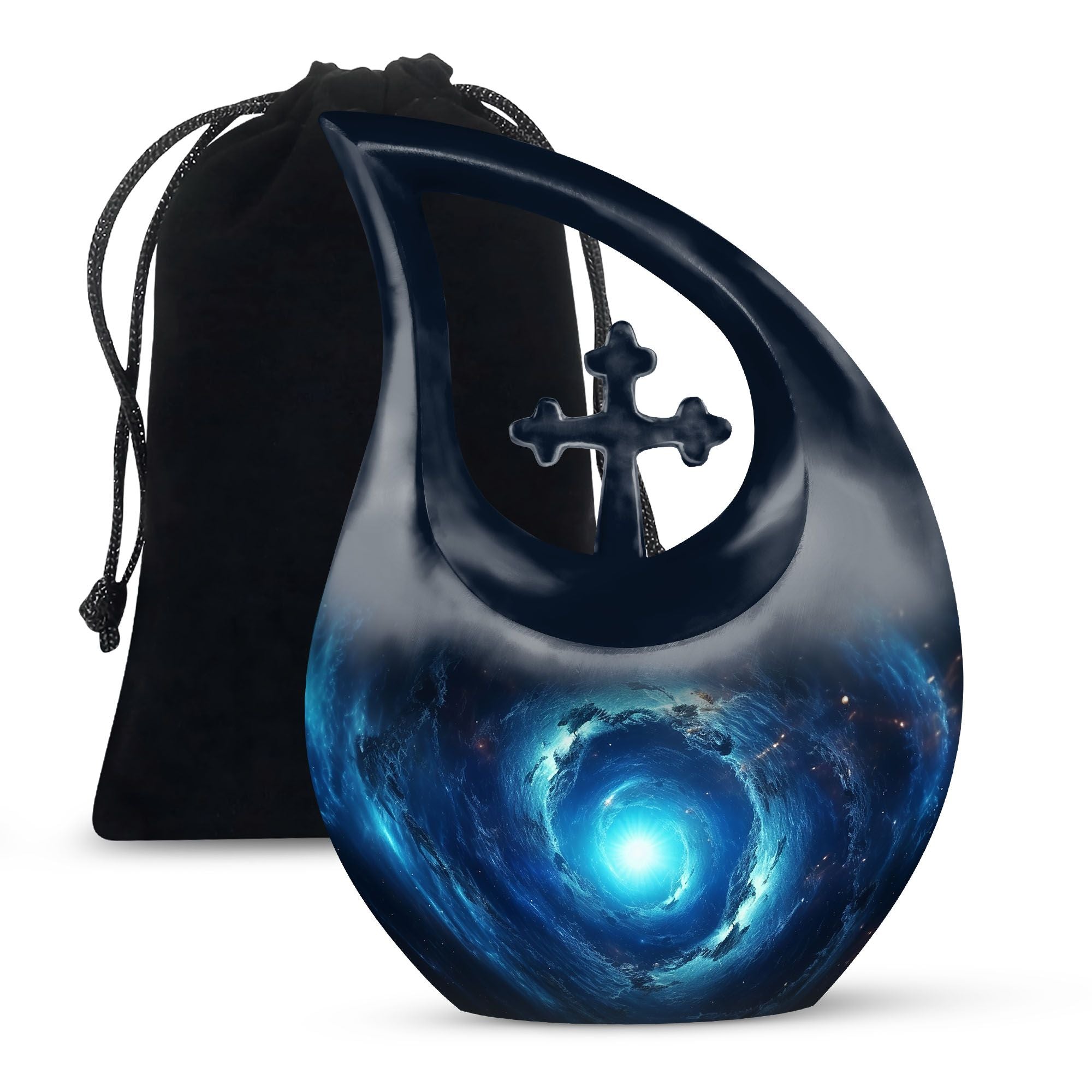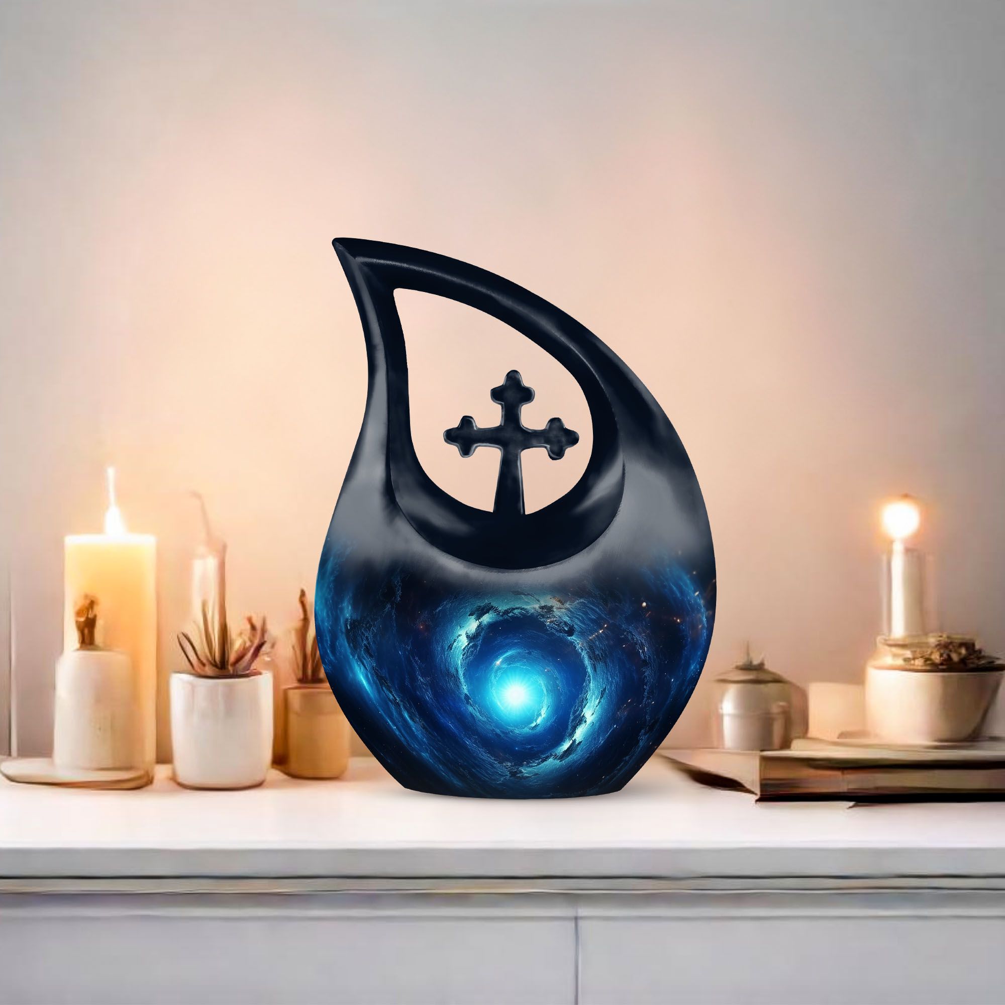 Expertly handcrafted from premium aluminum, the black cross drop memorial urn features a mesmerizing galactic swirl pattern accented with deep cosmic tones and a subtle metallic sheen. Its secure, threaded lid ensures your loved one’s ashes remain safe for generations. Designed for both display and burial, it serves as a timeless piece of art—perfect among cremation keepsake urns for human ashes adult or as a centerpiece urn for cremation in your home.