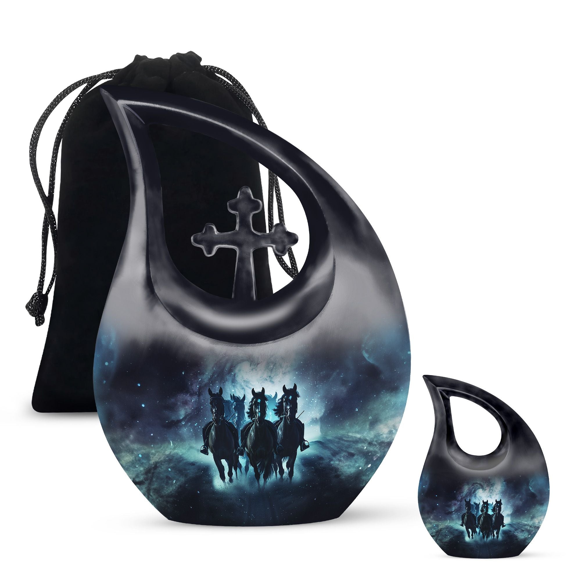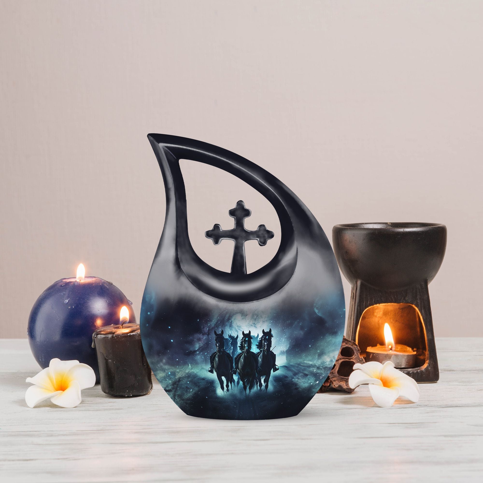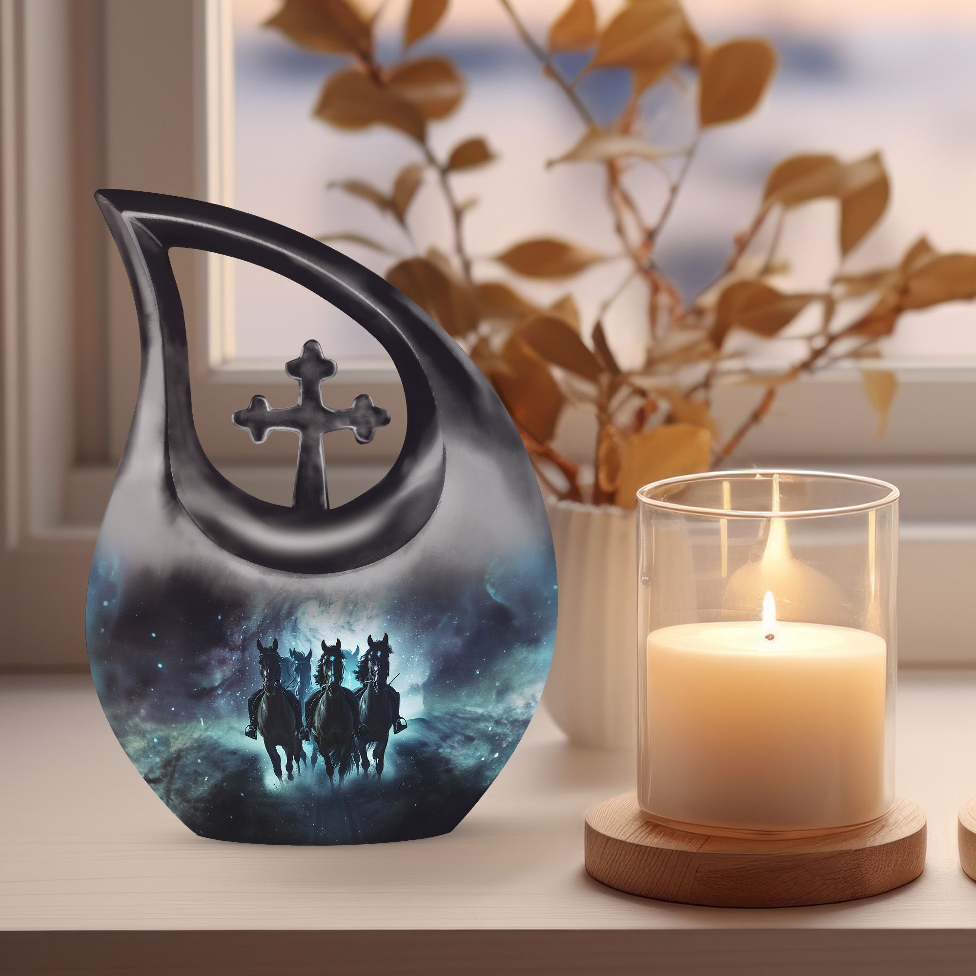 This Horse Themed urn, a magnificent tribute to a meaningful life, brings a sense of calm and honor. Created with high-quality aluminum, this Large Urn stands 10 inches tall, carrying a weight of 3.3 pounds, and holding a capacity of 200 cubic inches. Its theme renders a horse in a quietly powerful way, symbolizing endurance, strength, and the relentless spirit of life. Our urns are more than just cremation boxes for adults, they serve as touching memory sanctuaries which can be personalized with engraved names, making them totally distinctive. The Cross Drop design on the urn underpins the theme of hope and resurrection. The package also includes a velvet pouch for the containment of ashes, providing gentle care and respect. Urn’s keywords include Unique Urns For Dad, Companion Urns For Adults among others if you want to find similar products. For those seeking memorial urns online, this is a compelling choice.
