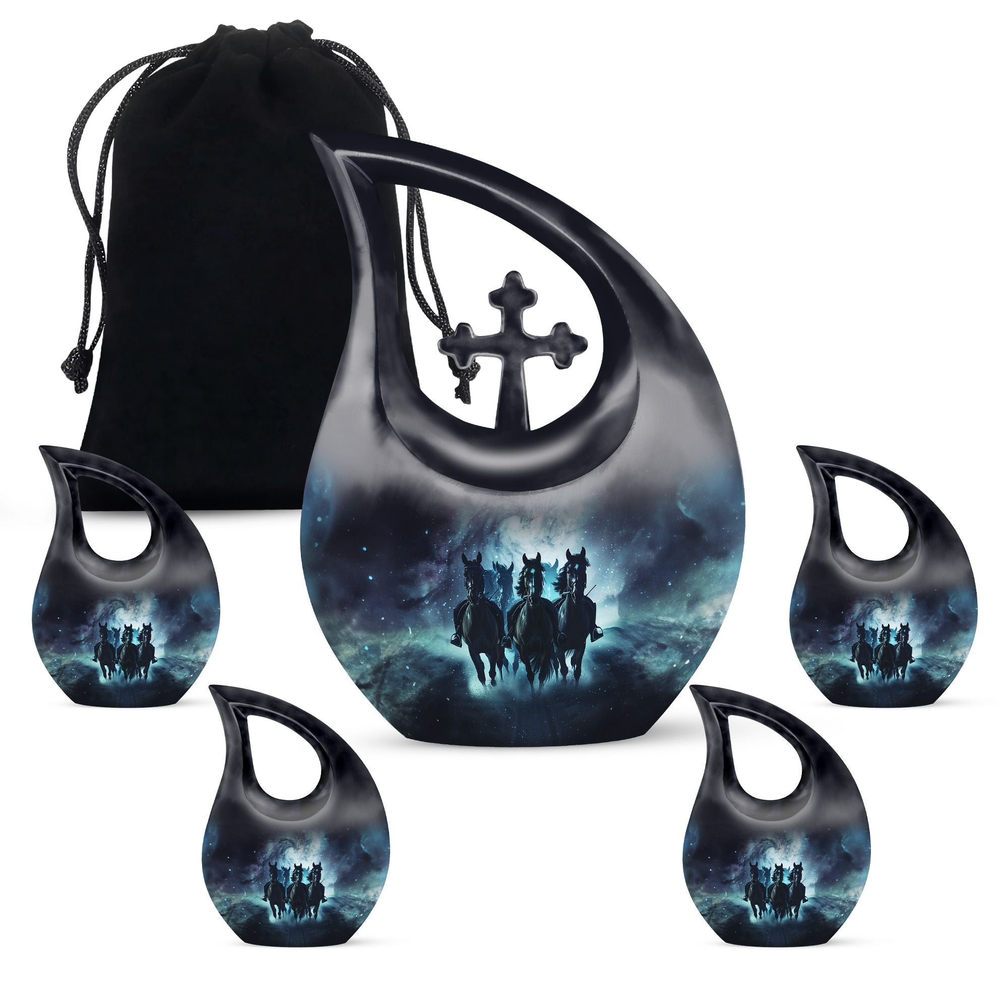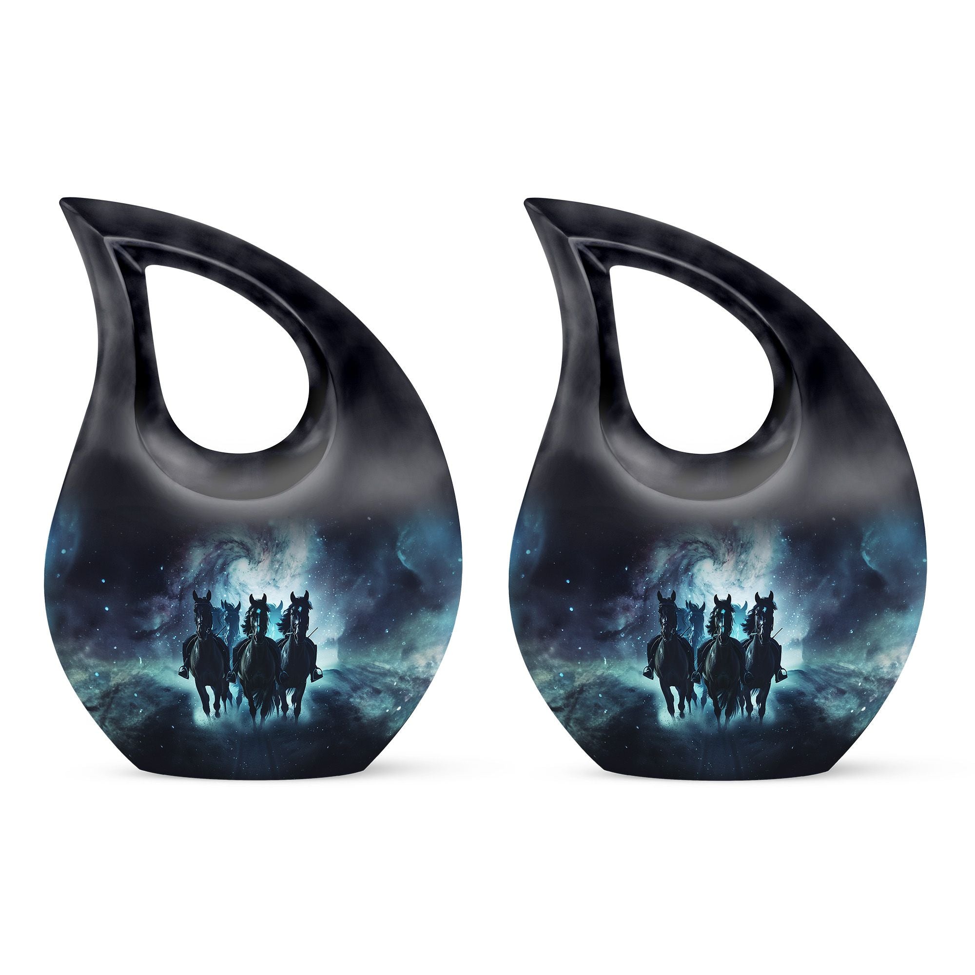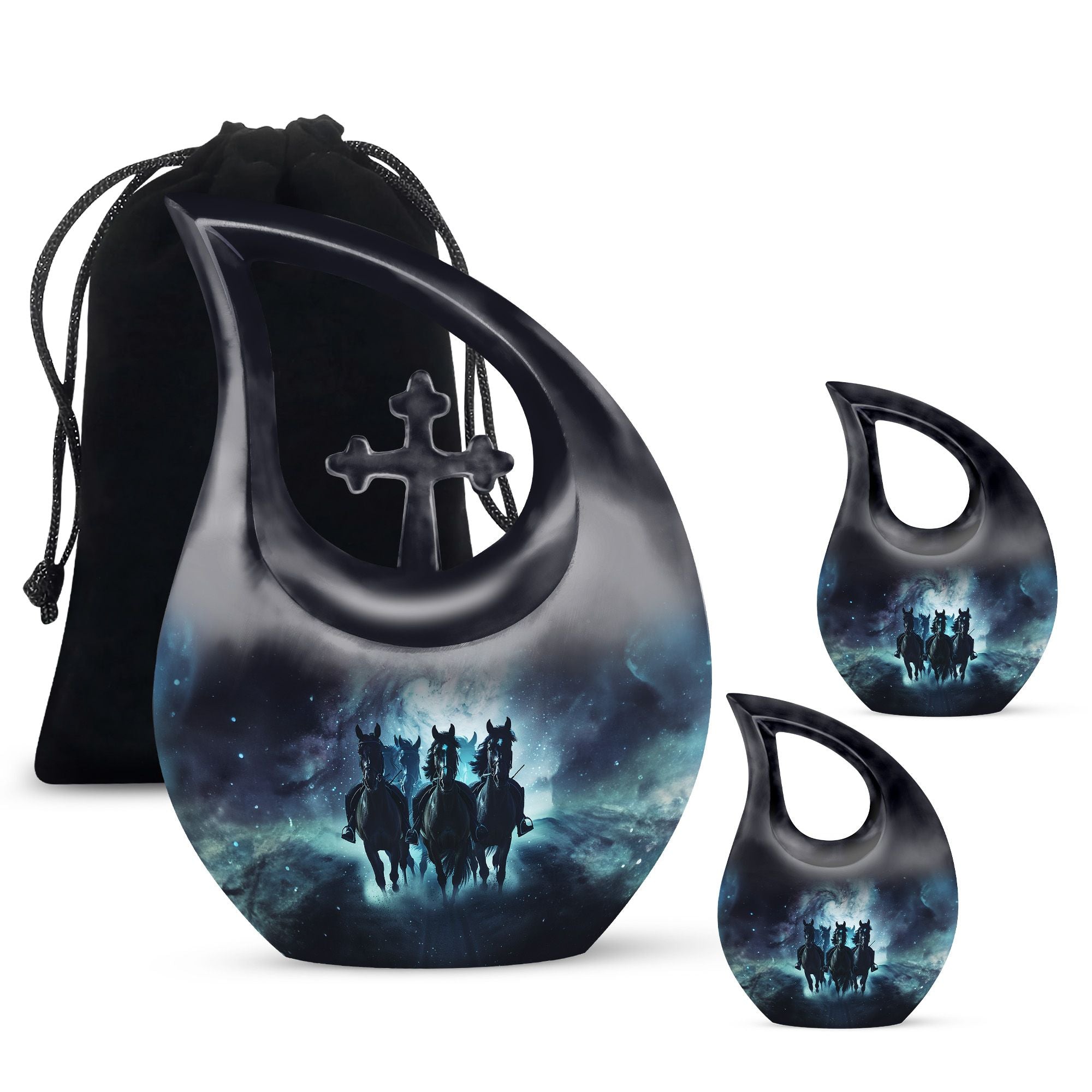 This Horse Themed urn, a magnificent tribute to a meaningful life, brings a sense of calm and honor. Created with high-quality aluminum, this Large Urn stands 10 inches tall, carrying a weight of 3.3 pounds, and holding a capacity of 200 cubic inches. Its theme renders a horse in a quietly powerful way, symbolizing endurance, strength, and the relentless spirit of life. Our urns are more than just cremation boxes for adults, they serve as touching memory sanctuaries which can be personalized with engraved names, making them totally distinctive. The Cross Drop design on the urn underpins the theme of hope and resurrection. The package also includes a velvet pouch for the containment of ashes, providing gentle care and respect. Urn’s keywords include Unique Urns For Dad, Companion Urns For Adults among others if you want to find similar products. For those seeking memorial urns online, this is a compelling choice.
