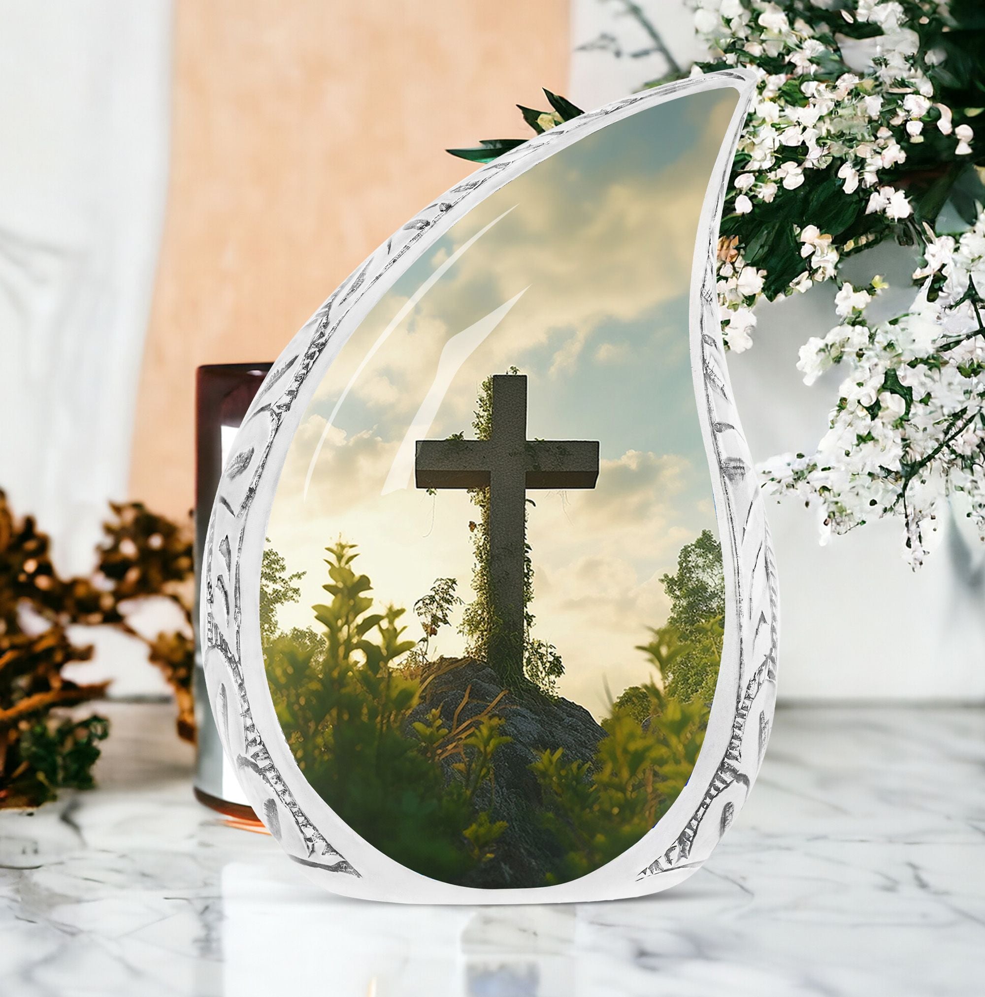 Pay your respects to your departed loved ones with our Jesus Christ Cross Memorial Urn. Crafted meticulously with Aluminium, our large urn is revered for its superior durability. The dimensions of our uniquely designed urn stands at 10 inches in height and weighs in at 3.3 pounds. This classic urn design carries approximately 200 cubic inches of ashes, perfect for the containment of your loved one's remains. This urn is also customizable to truly make it unique to your eternal memory. You can personalize it with engraved names making it a distinctive memorial urn. Included with your purchase is a velvet pouch perfect for the preservation and containment of your cherished one's remains. This 3-inch urn stand as a small yet enduring testament to your eternal love. Perfectly suitable for those searching specifically for 'Unique Urns for Dad, Metal Urns for Human Ashes, Urns for Ashes for Mom, Decorative Urns for Human Ashes'.