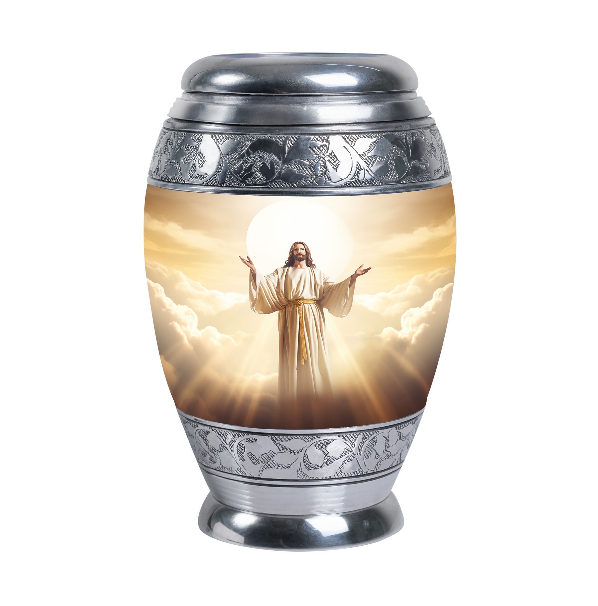 Introducing the 'Jesus Christ With Holy Cross Urn', an exceptional piece from our memorial gifts collection, it's much more than a mere vessel; it's a radiant tribute to a cherished life. Crafted from robust aluminium, this urn is distinguished by its resilient weight of 3.3 pounds and measures 10 inches in height offering a substantial capacity of 200 cubic inches. Perfectly designed as a large urn, this iconic piece is intricately carved to honor memories and beauty in a sacred way. Plus, we offer the opportunity to make it even more unique by personalizing it with engraved names. The urn is specifically packed in a velvet pouch, guaranteeing an elegant containment for the ashes. This memorial urn effortlessly combines functionality and aesthetics, making it a fitting tribute for your loved ones. Especially appealing to adults and seniors, it makes a touching gift for those grieving. For searches regarding 'containers for human ashes' or 'urns for ashes for dad', our classic urn stands out remarkably. So, when it comes to memorial urns, look no further than the 'Jesus Christ With Holy Cross Urn'.