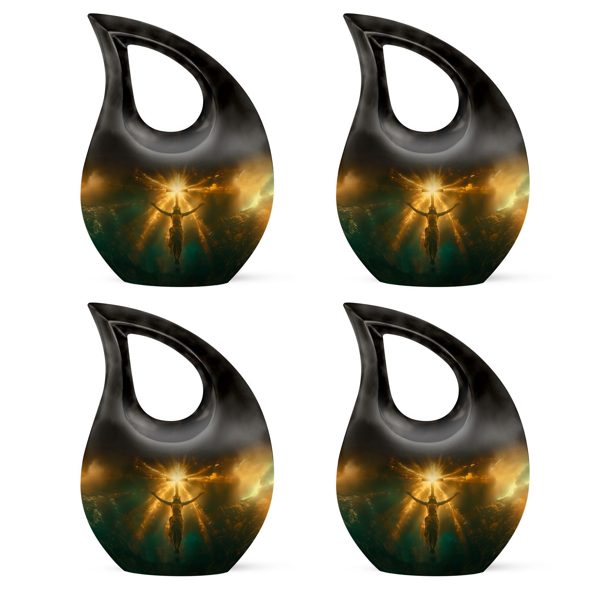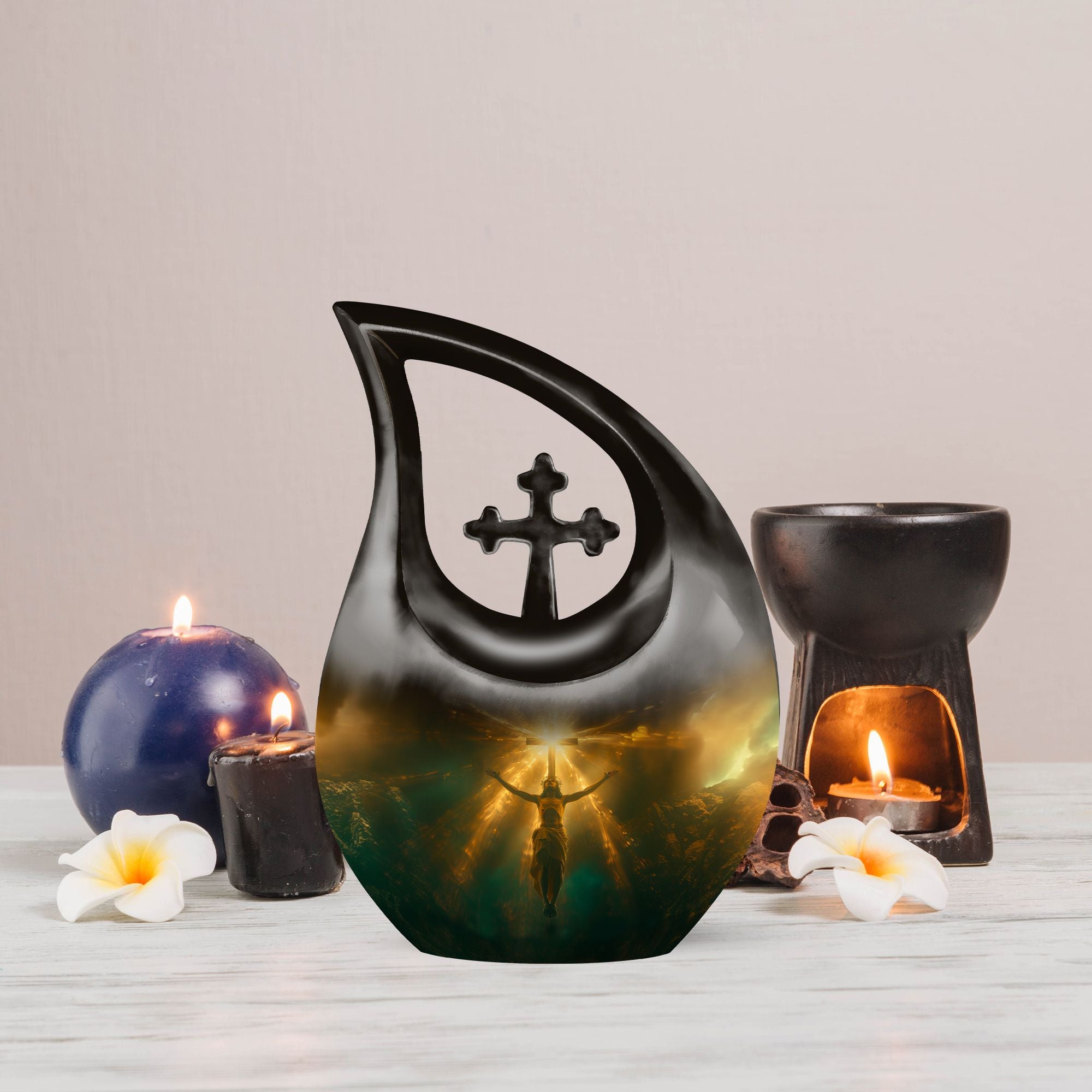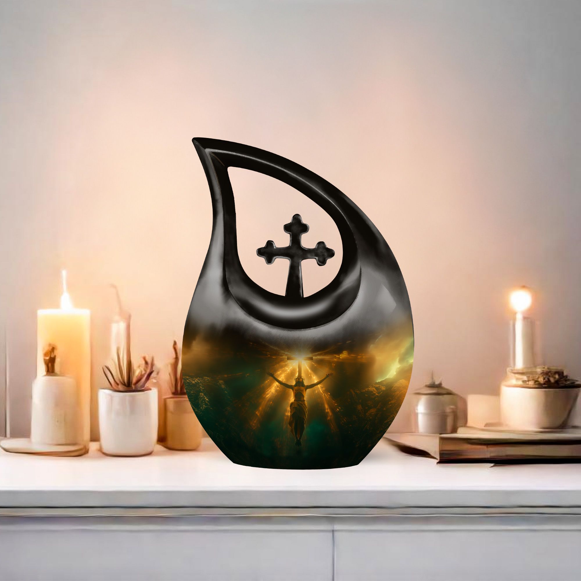 Immerse yourself in a reverent remembrance with our Large Jesus Cross Drop Urn. Tailored specifically for adults and seniors who seek unique pieces for memorial ceremonies, this 10-inch urn, weighing a solid 3.3 pounds, has a noble presence. Skillfully manufactured from robust aluminium, it accommodates up to 200 cubic inches of ashes, creating a heartfelt memorial to the departed. Equipped with personalization options, it is possible to engrave names and bring a touch of individuality to this tender tribute. The package includes a soft velvet pouch for secure containment of shaken ashes. This unique cross drop urn aims to provide a sense of solace in times of sorrow, embodying the timeless inspiration drawn from Jesus. Harnessing keywords such as Jesus Urn, Memorial Urns, Affordable Cremation Urns, Urns for Ashes for Adults, and affordable cremation, this product encapsulates an affordable and respectful choice amongst memorial ceremony supplies.