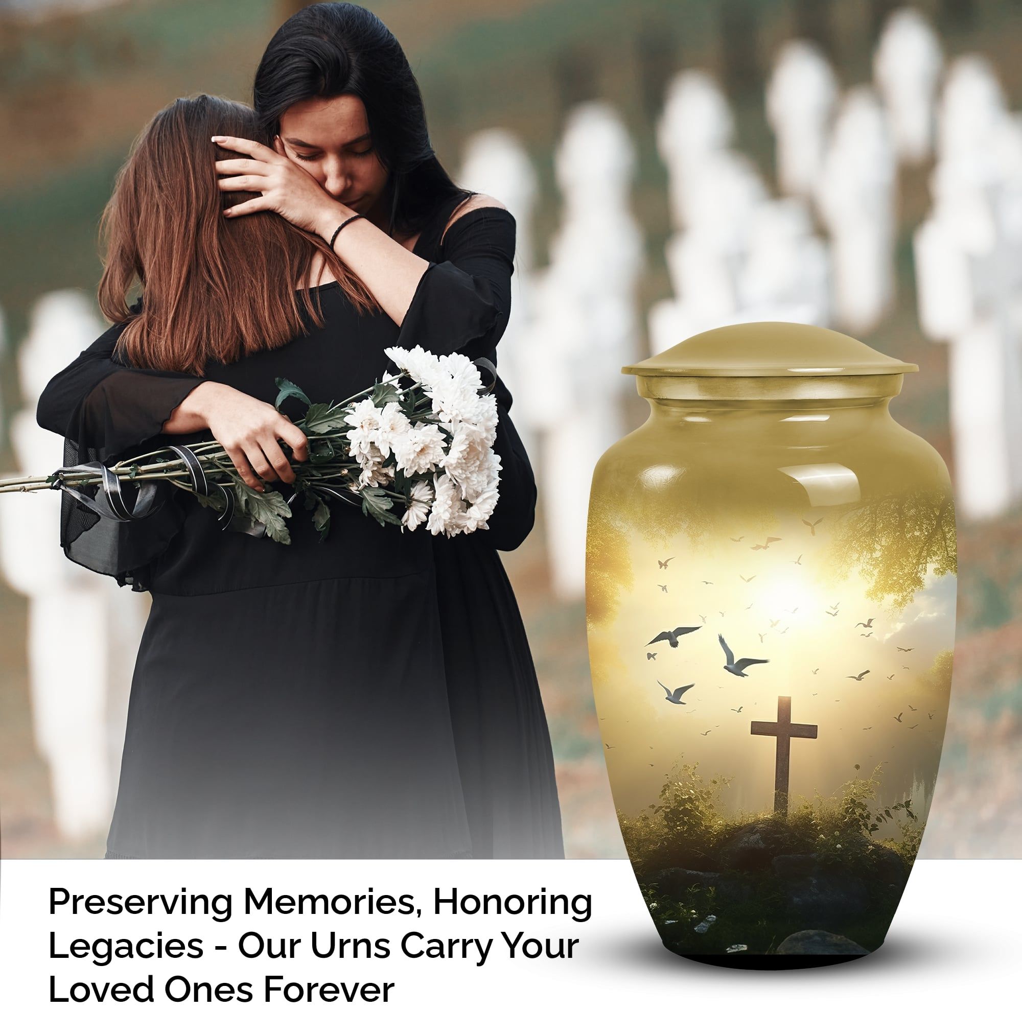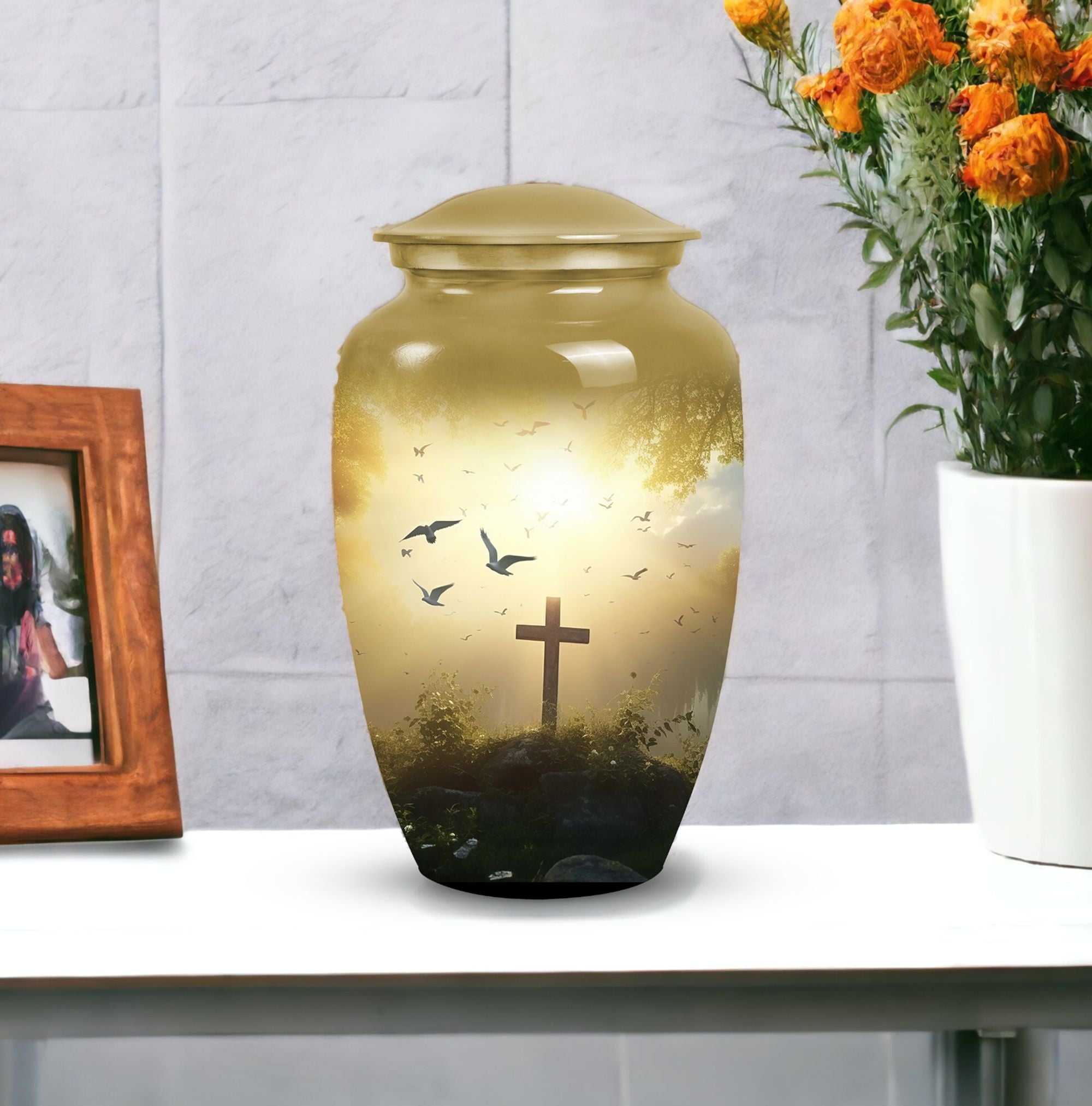 Discover the profound symbolism and heartfelt tribute embodied in this large Cross Urn. Epitomizing serene elegance, these decorative urns radiate a timeless grace designed to offer solace during those most challenging moments. Crafted with love and dignity, they serve as a perfect commemoration for adored women, respected fathers, and esteemed adults. Both majestic and meaningful, these large urns complement any funeral decorations, adding an intimate, genuine touch to memorial ceremonies. Expertly fashioned for those of discerning taste, they captivate the beholder with their intricate detailing and profoundly spiritual allure. Transcending the ordinary, the Cross Urn bridges the gap between this world and the next, encapsulating a legacy that endures beyond a lifetime. Cherish the memory of your loved ones in a unique manner that aligns the sacred and the sentimental. This Cross Urn -- because emotive expressions of remembrance should never be mundane.