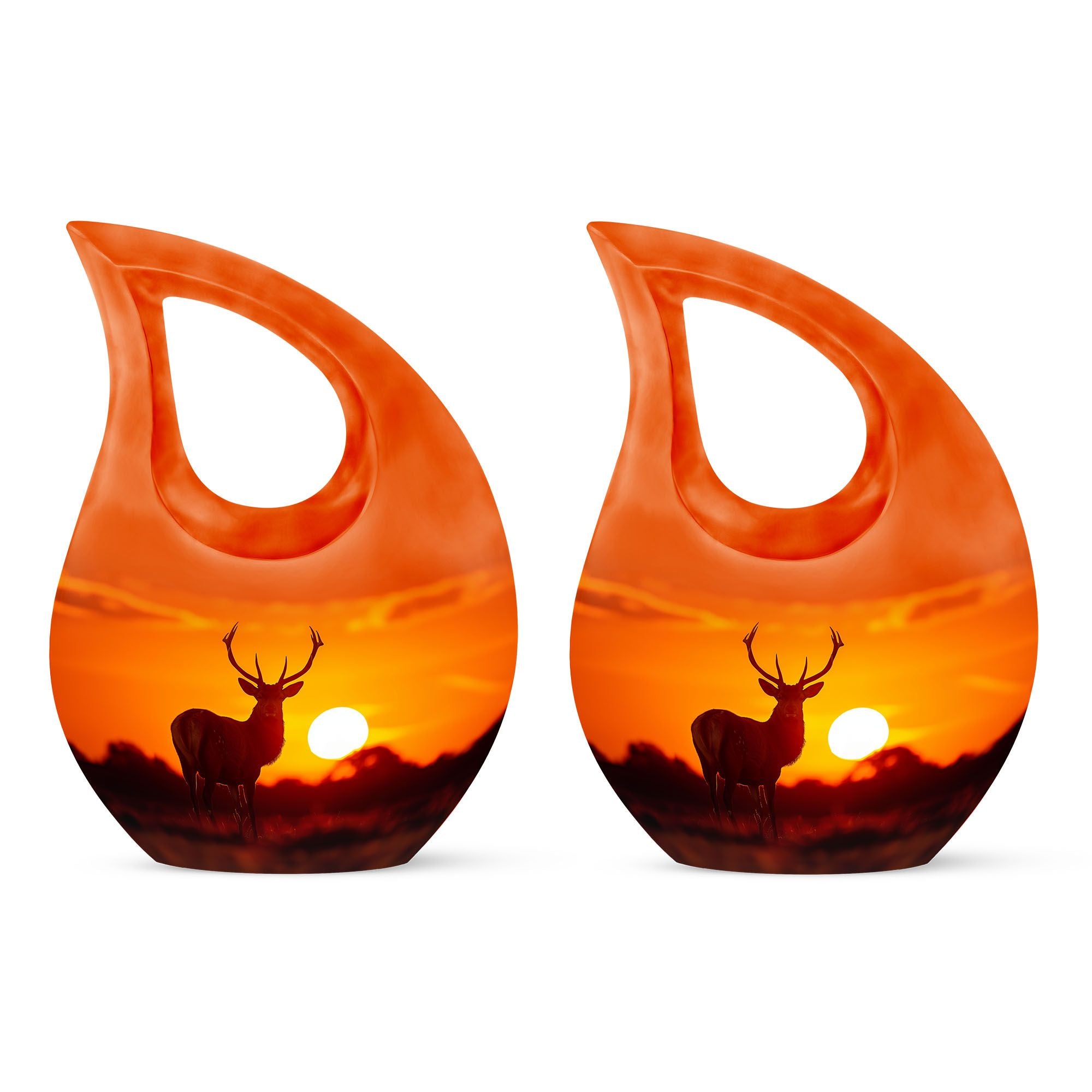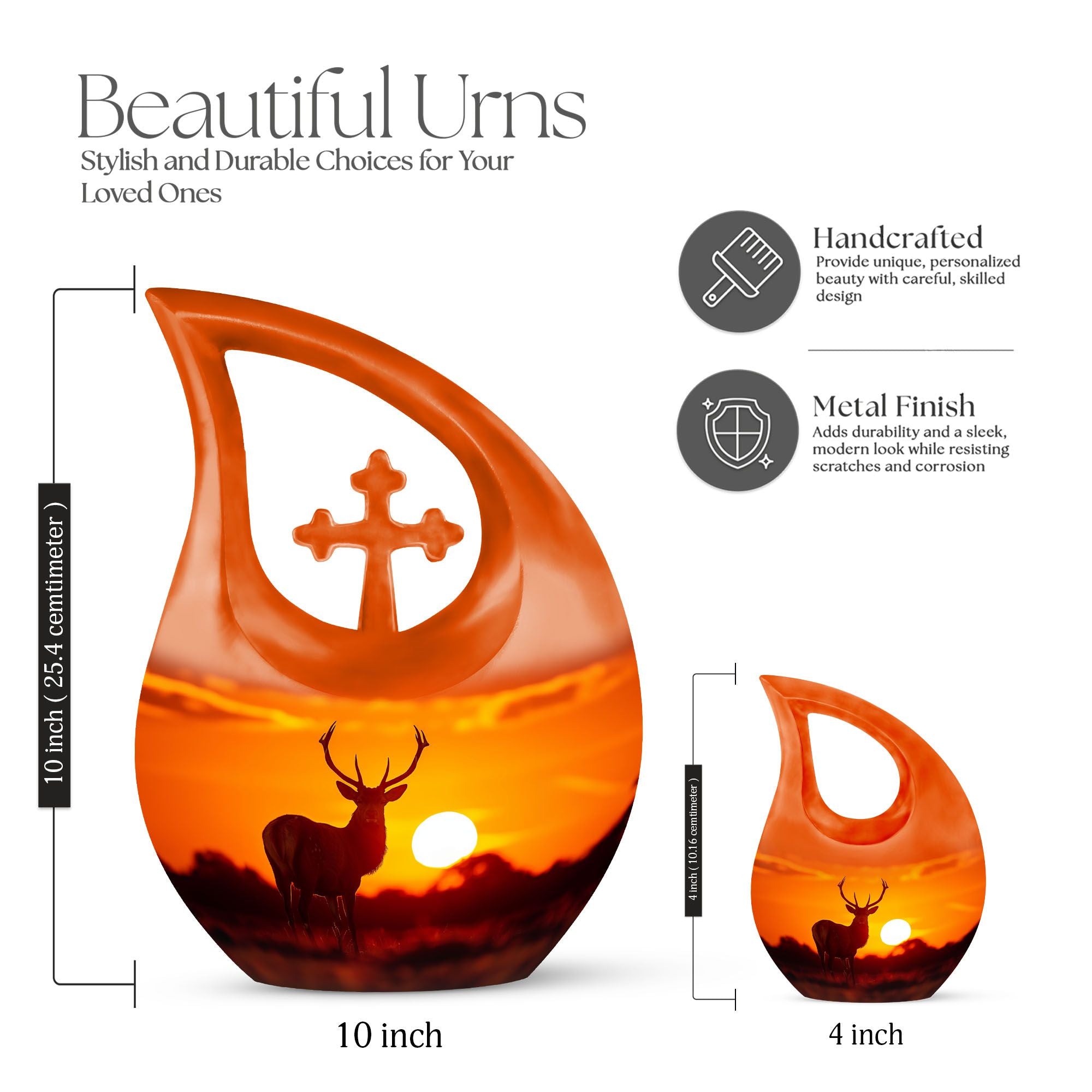 Discover an embrace of timeless remembrance with our Deer Urn. Measuring 10 inches in stature and with a capacity of 200 cubic inches, it carries a distinctive 'Cross Drop' theme presenting a delicate balance between grace and honor. It is carefully crafted from durable aluminium rigorously chosen for its unmatched quality and enduring appeal. This large urn is meticulously designed to contain the ashes in a velvet pouch, making it a cherished and respectful homage to your loved one. Weighing at a modest 3.3 pounds, its astute construction ensures a lasting testament of your precious memories. Adding a personal touch, our bespoke customization service allows you to engrave names and significant dates. Amidst the array of funeral urns, our deer urn stands out, capturing the poignancy of loss and the importance of memory. This urn is more than just a vessel; it's a solemn salute to life, love, and loss. Keywords: Deer Urn, Funeral Urns, Memorial Urns, Cheap Cremation Urns, Cheap Funeral Urns, Keepsake Urns, Custom Urns.