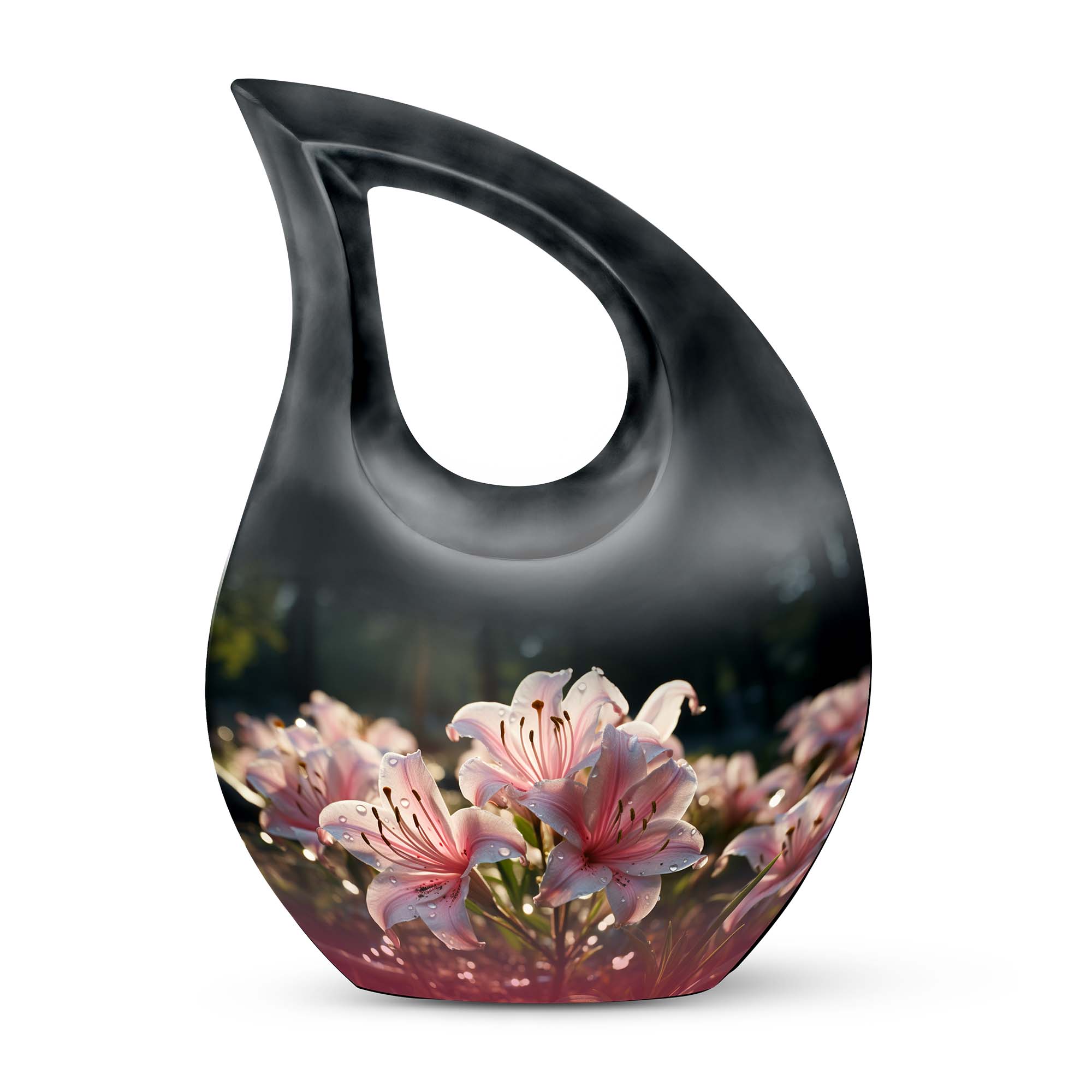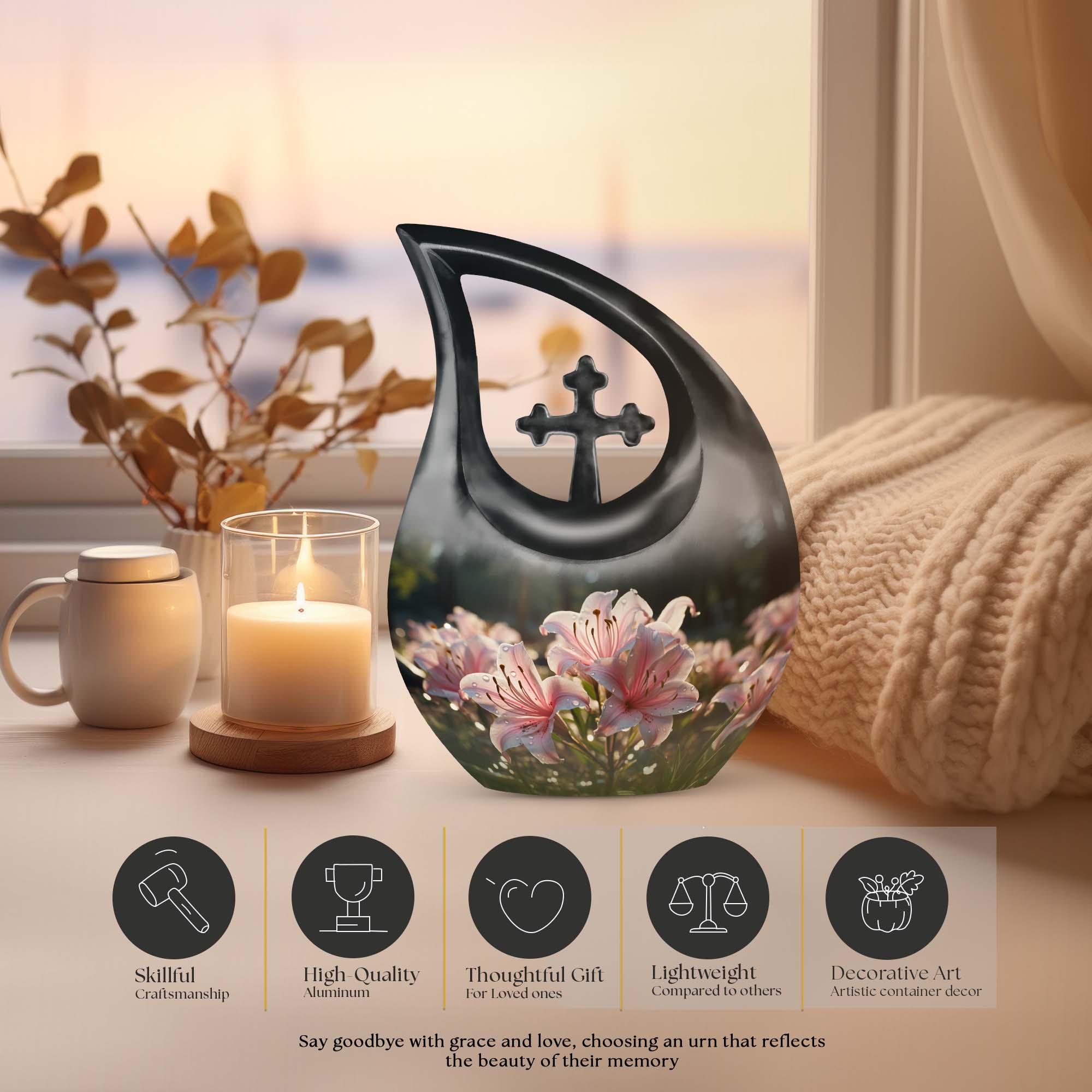 Handcrafted from durable, high-quality aluminum, this large decorative urn for human ashes blends artistry with strength. Its graceful black teardrop silhouette is adorned with vibrant pink lilies surrounding a soft cross motif — a stunning symbol of remembrance and hope. Whether chosen as a cremation urn for women or as part of a memorial for men, this urn provides both dignity and visual beauty. The threaded screw-top lid ensures ashes remain securely preserved, offering comfort and assurance for years to come.