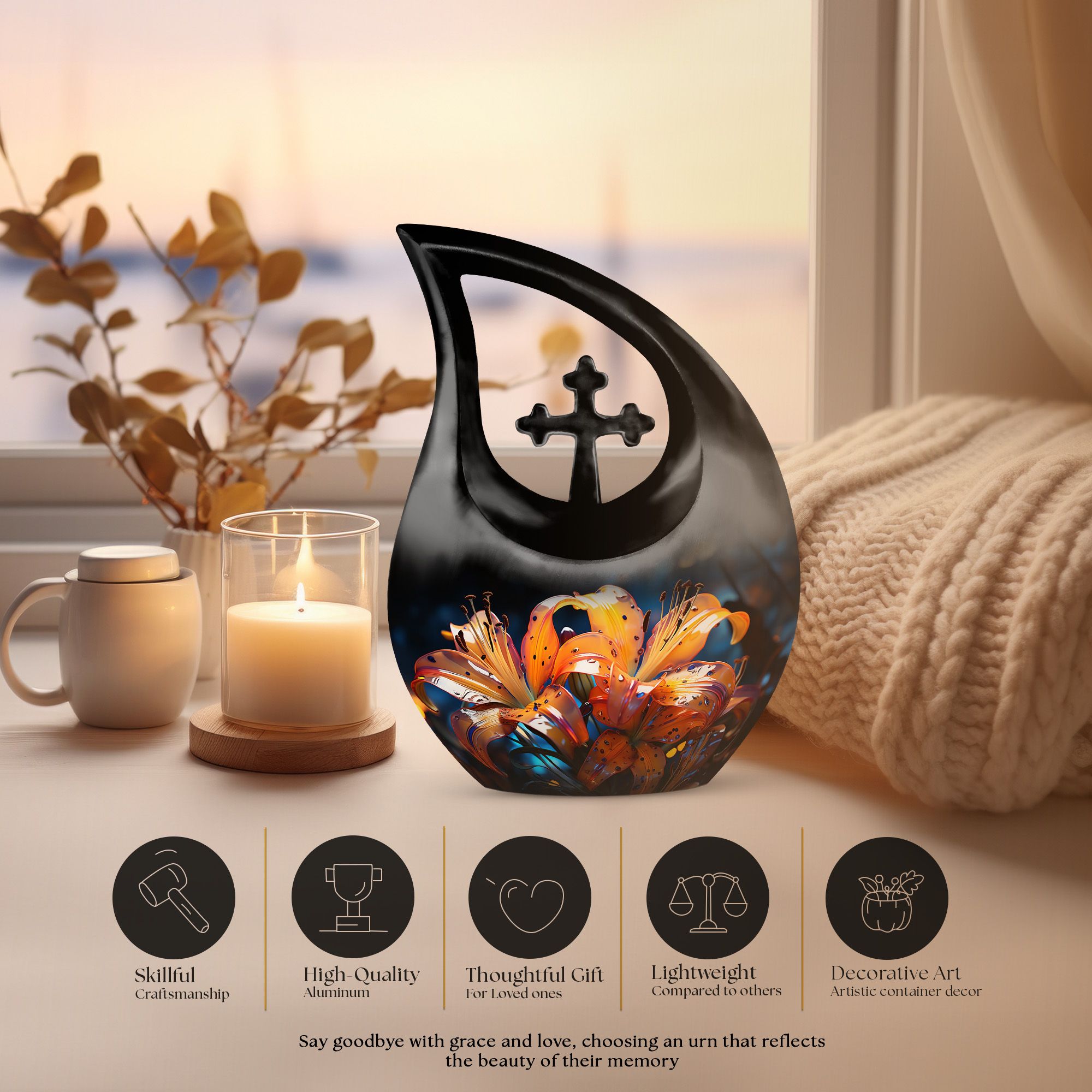Expertly handcrafted from premium aluminum, this large decorative urn for human ashes showcases a sleek teardrop silhouette finished in deep black, accentuated by vibrant orange tiger lilies and a subtle cross engraving. The striking contrast symbolizes resilience and hope through faith. Ideal as an urn for ashes for women or as a cremation urn for men, it offers a dignified and secure resting place. The threaded screw-top lid ensures ashes remain safely preserved, while the elegant shape adds sophistication to any memorial setting.